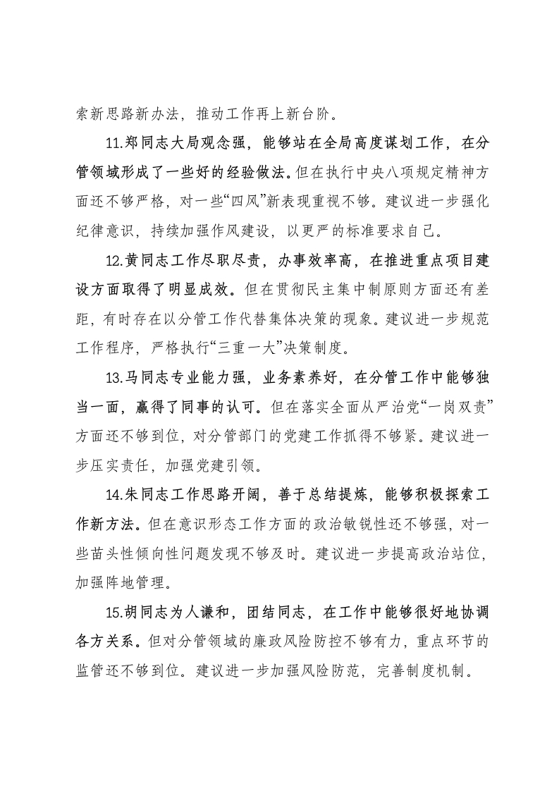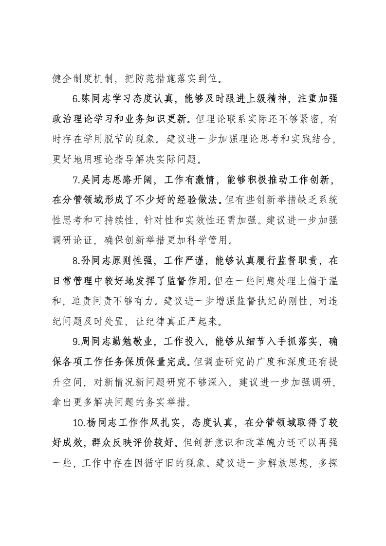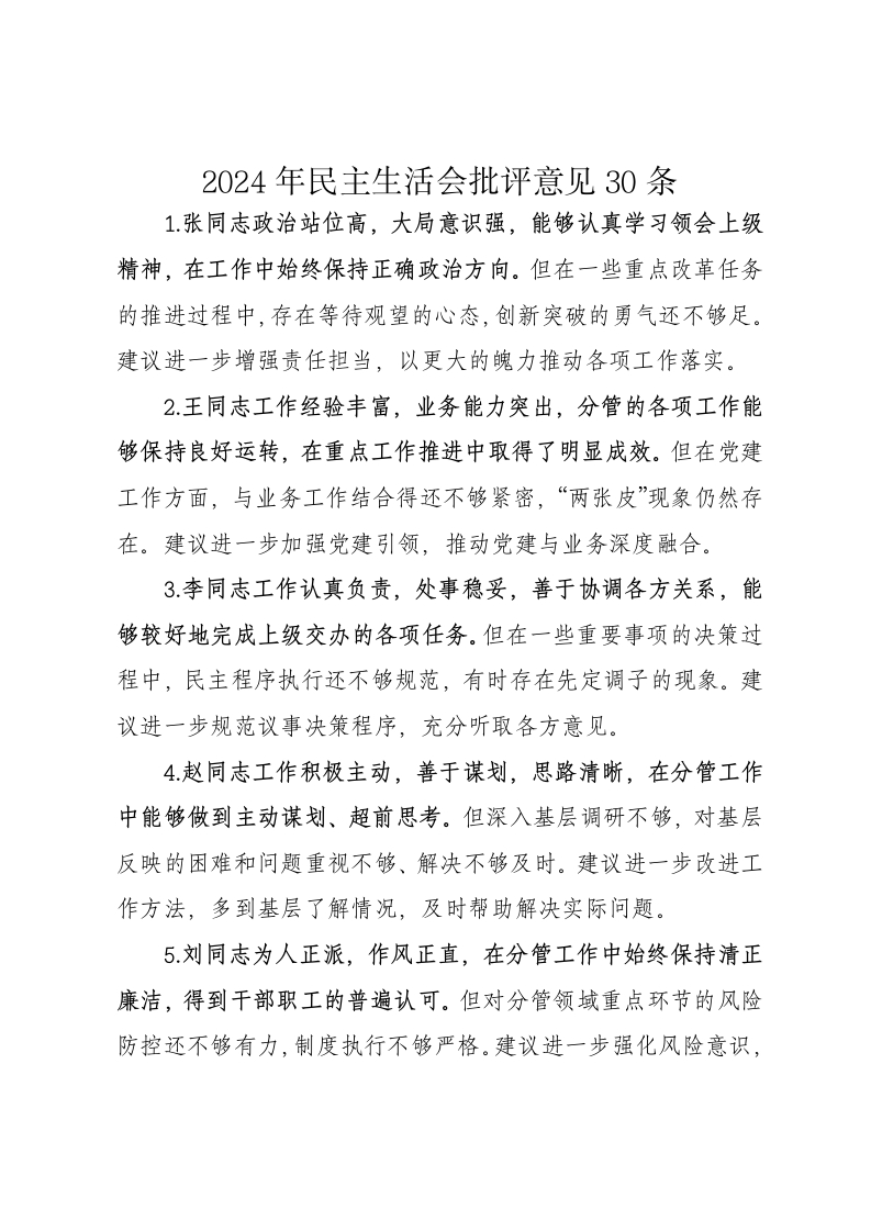 2024年民主生活会批评意见30条1.张同志政治站位高,大局意识强,能够认真学习领会上级精神,在工作中始终保持正确政治方向。但在一些重点改革任务的推进过程中,存在等待观望的心态,创新突破的勇气还不够足。建议进一步增强责任担当,以更大的魄力推动各项工作落实。2.王同志工作经验丰富,业务能力突出,分管的各项工作能够保持良好运转,在重点工作推进中取得了明显成效。但在党建工作方面,与业务工作结合得还不够紧密,“两张皮”现象仍然存在。建议进一步加强党建引领,推动党建与业务深度融合。3李同志工作认真负责,处事稳妥,善于协调各方关系,能够较好地完成上级交办的各项任务。但在一些重要事项的决策过程中,民主程序执行还不够规范,有时存在先定调子的现象。建议进一步规范议事决策程序,充分听取各方意见。4赵同志工作积极主动,善于谋划,思路清晰,在分管工作中能够做到主动谋划、超前思考。但深入基层调研不够,对基层反映的困难和问题重视不够、解决不够及时。建议进一步改进工作方法,多到基层了解情况,及时帮助解决实际问题。5.刘同志为人正派,作风正直,在分管工作中始终保持清正廉洁,得到干部职工的普遍认可。但对分管领域重点环节的风险防控还不够有力,制度执行不够严格。建议进一步强化风险意识,