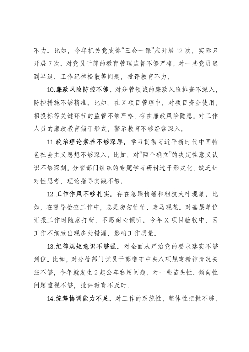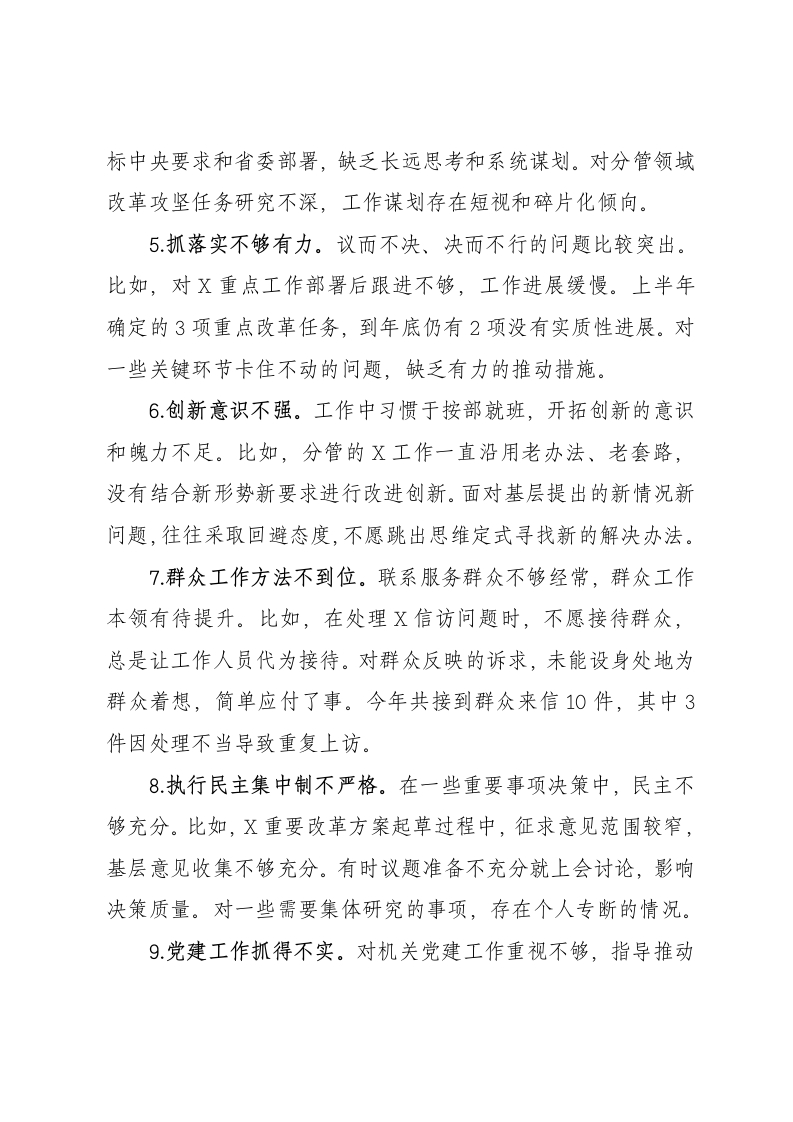 2024年民主生活会(组织生活会)批评意见34条(带案例)1理论学习不够系统深入。虽然通过党组第一议题、理论中心组学习等形式开展学习,但学习质量不高。比如,党的二十届三中全会召开后,对《决定》提出的进一步全面深化改革的指导思想、总体要求等重要论述理解把握不够,存在囫囵吞枣、浅尝辄止的问题。在分管部门的学习中,往往只是安排会议传达,缺乏深入研讨,对如何结合实际推进改革创新思考不够。2.调查研究不深入扎实。对基层情况了解不够,存在蜻蜓点水、走马观花现象。比如,下基层调研时习惯于听汇报、看材料,与基层干部群众深入交流不够。今年X专项工作开展前,只去了两个基层单位了解情况,且每次调研时间不超过2小时,没有全面细致了解基层实际困难,导致工作推进中遇到不少问题。3.担当作为不够有力。面对改革发展中的难题,存在等靠要思想,敢于碰硬的勇气不足。比如,在推进X重点改革事项时,遇到阻力就打退堂鼓,没有主动研究对策。对于群众反映强烈的X历史遗留问题,虽然多次开会研究,但始终没有拿出切实可行的解决方案。4.工作谋划站位不高。习惯于就事论事,对中央精神和上级要求领会不够深入。比如,在制定X工作规划时,没有很好对