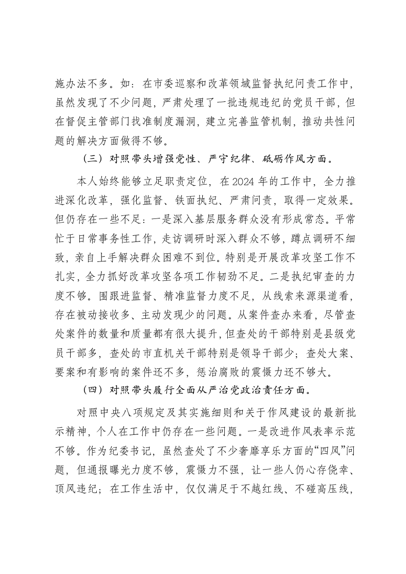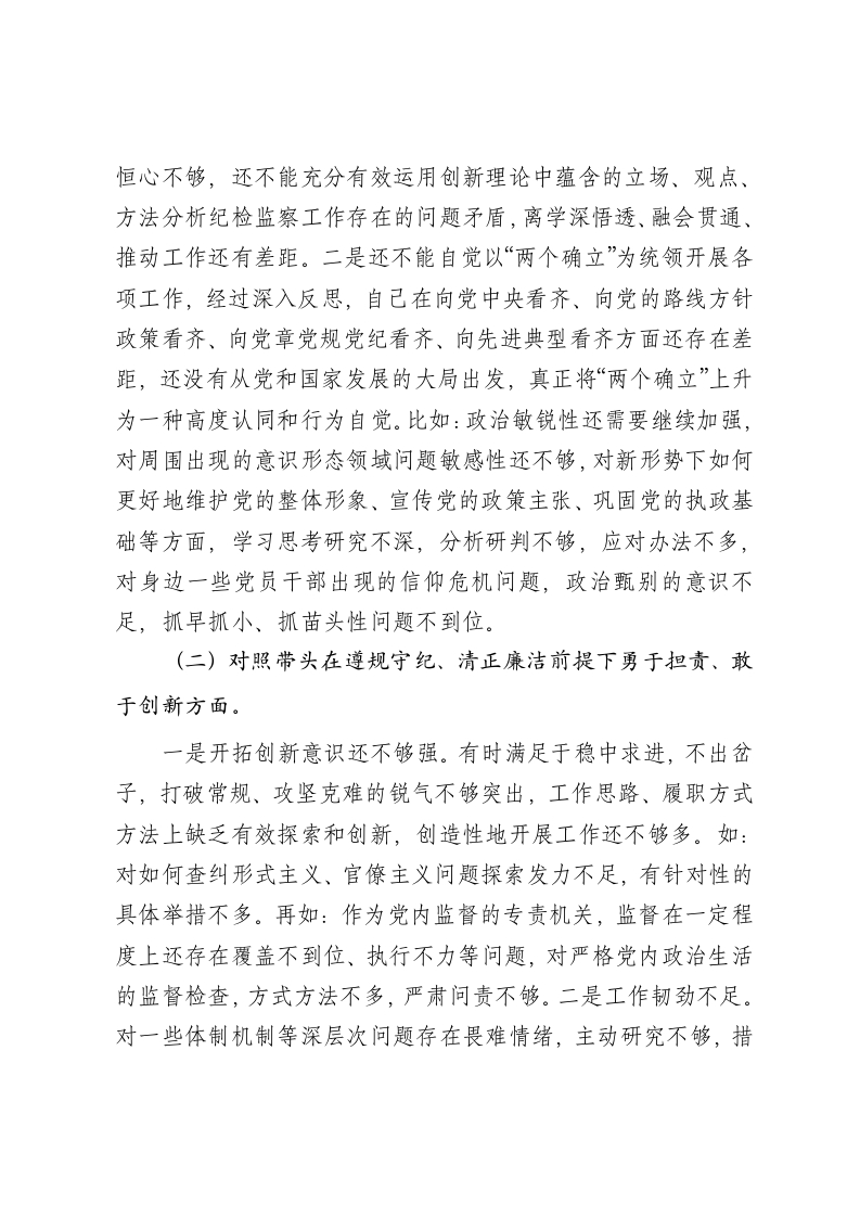 2024年民主生活会个人对照材料-纪检干部(四个带头)按照2024年度民主生活会的有关要求,本人始终坚持以创新理论为指导,深入研读党规党纪,及时跟进学习党的二十届三中全会精神,同时,重点领会把握坚持以人民为中心的发展思想和统筹推进“四个伟大”的系列重大战略决策、部署和意图,自觉地把思想和行动统一到党中央决策部署上来。我聚焦会议主题,结合思想工作实际,深入对照“四个带头”,深入开展谈心谈话,广泛征求意见建议,深入查找自身存在的问题,深刻剖析思想根源,明确了下步整改方向和目标。现具体报告如下:一、存在的主要问题情况说明:本年度本人在意识形态、保密、国家安全等领域严格遵守省委要求,这些领域未发生任何问题。(一)对照带头严守政治纪律和政治规矩,维护党的团结统一方面虽然能够始终强化“四个意识”,坚持“四个自信”,做到“两个维护”,把准政治方向、站稳政治立场、保持政治定力,严守政治纪律、政治规矩,不忘初心、对党忠诚,坚决贯彻落实重要指示批示和党中央决策部署。但用更严的标准衡量,还存在一些薄弱环节。一是对创新理论的学习方面,学习上下的功夫还不够,在学习理解上缺乏深度,对深层次思想理论问题理解把握不够深刻,在理论知识的转化运用上做得不够,在精研深思上的钻劲和