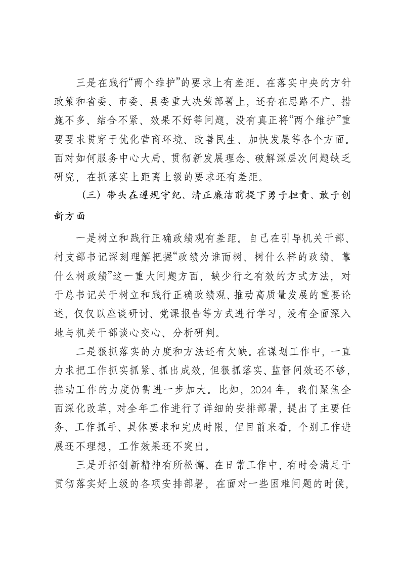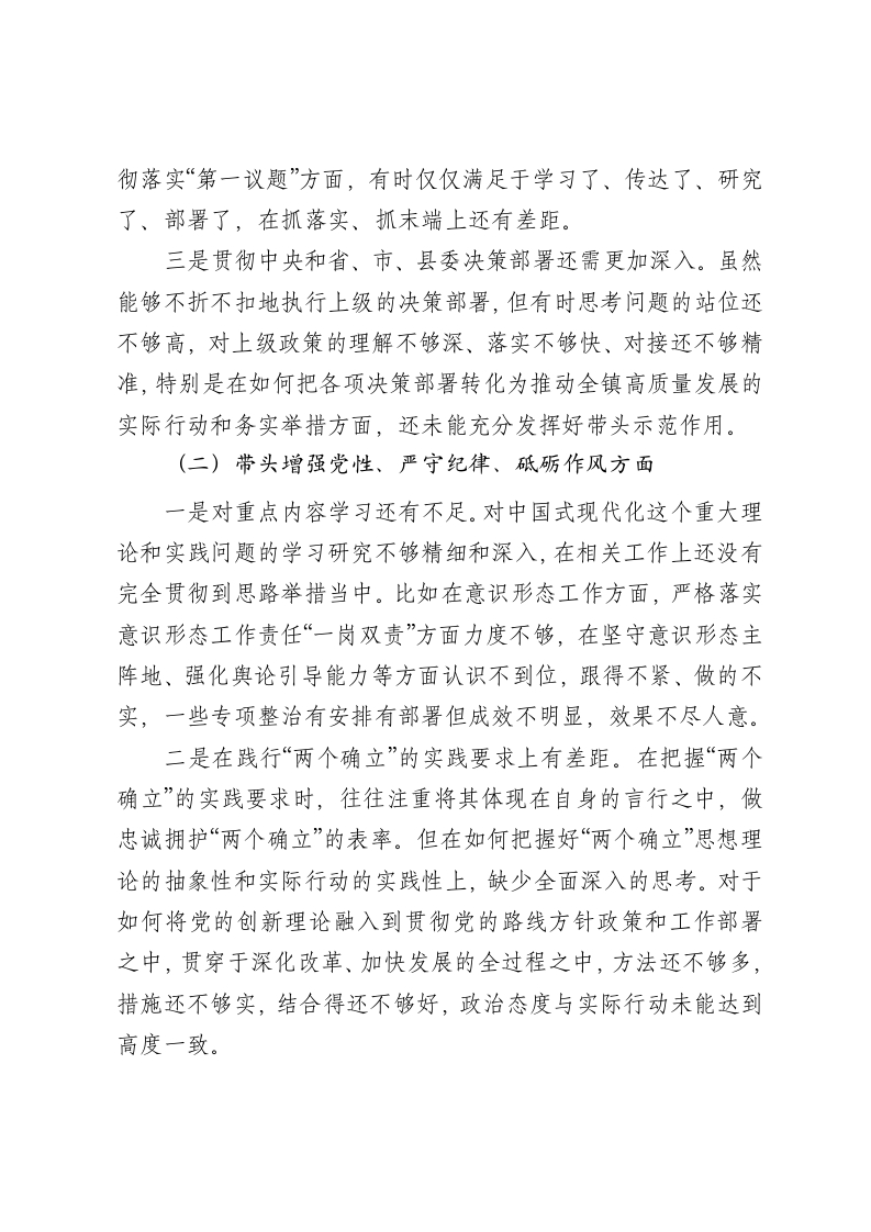 乡镇党委书记2024年民主生活会个人对照检查材料按照《关于认真开好2024年度民主生活会的通知》要求,本人深入学习贯彻习近平新时代中国特色社会主义思想和党的二十届三中全会精神,在认真开展理论学习、深入谈心谈话的基础上,全面对照4个方面内容,认真检视自身存在的问题和不足,深刻剖析问题根源,研究制定整改措施。现将对照检查情况汇报如下:一、存在的主要问题(一)带头严守政治纪律和政治规矩方面一是对思想内涵认识不够深入。满足于参加理论中心组学习和个人自学,有时把“学过了”当“学会了”,把“知道了”当“学懂了”,缺乏深钻细研的精神,对党的创新理论的理解领悟还不够深刻,距离学而用、学而行还有很大差距。比如参加理论学习中心组学习时,仅仅是听文件,对内容形成大致了解,但没有认真思考学习内容,并且会后仅对照学习文件摘抄学习笔记,应付了事。这些问题,说明我在思想上不重视学习,对待学习的态度不认真,致使学习时存在漏项缺项,学深悟透有差距。二是在加强党的政治建设、落实党的全面领导上仍需努力。坚持按党章规定办事、管事做得不够好,离党章严格要求还有一定差距。在遵守政治纪律和政治规矩,落实新形势下党内政治生活的若干准则上,有时还存在迁就照顾、好人主义思想。学习贯