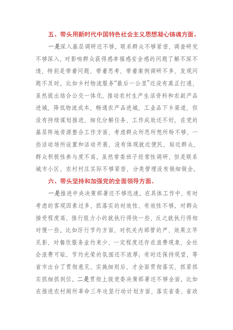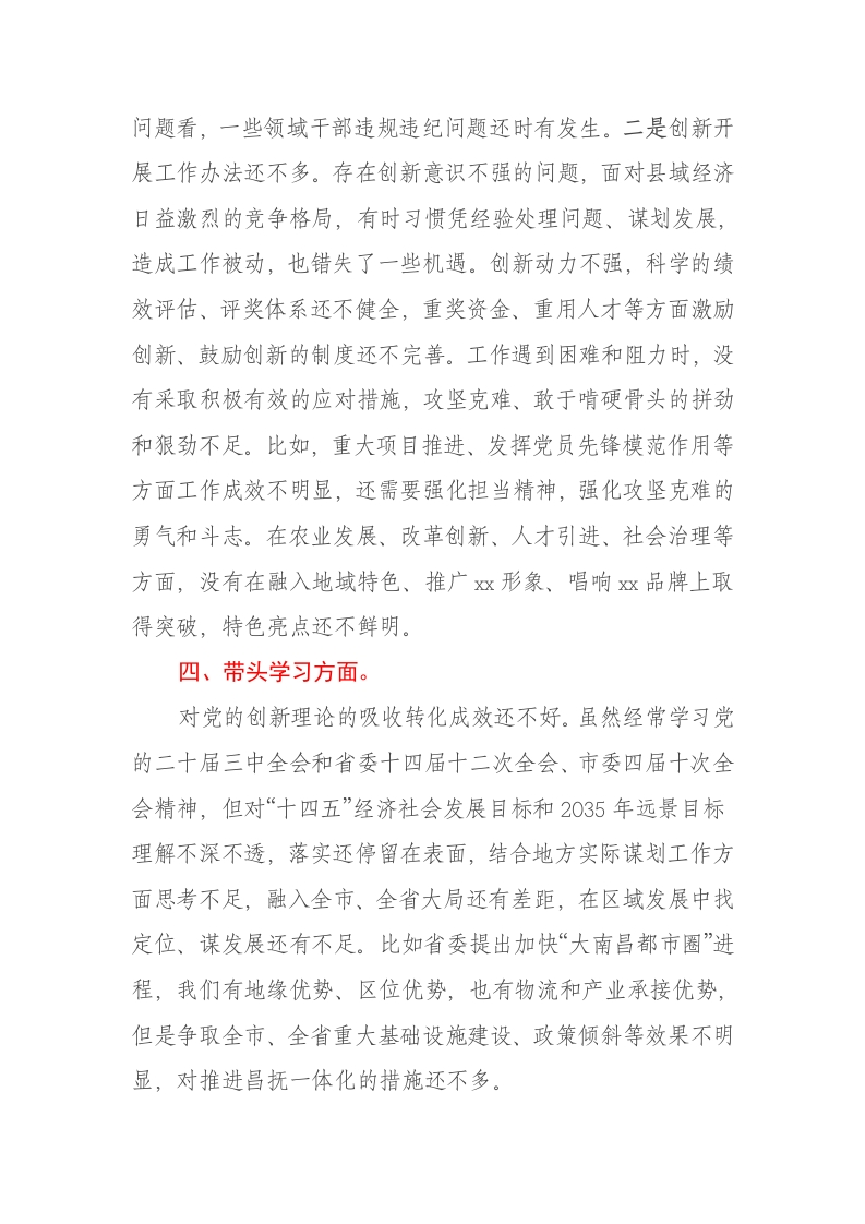 区委书记2024年度党纪学习教育专题民主生活会上的发言提纲(查摆不足部分)一、政治纪律和政治规矩方面。引领作用发挥的还不够明显。到基层调研,接触一把手和班子成员多,接触一般干部和群众少,工作不够接地气,发现问题不全面、不深入、不细致。在抓工作落实上还存在着重布置、轻落实的问题,有些工作部署在落实过程中跟的不紧、督的不严,导致一些决策落实效果不好。统筹推进工作、协调推动发展、补短板强弱项的意识还不够强,不平衡不充分的矛盾还比较突出。二、增强党性、严守纪律、砥砺作风方面。一是主体责任履行的还不够细致。廉政教育上,干部廉政思想教育方式创新还不多,警醒作用发挥还有待加强。在干部任用上,对一些隐形的问题,提醒的不够、追究的不够。意识形态上,没有充分认识到意识形态领域工作的重要性,对网络和社会上传播的一些负面信息和错误言论缺乏高度的警惕性、斗争性和及时制止纠正的自觉性。三、遵规守纪、清正廉洁前提下勇于担责、敢于创新方面。一是“一岗双责”落实的还不够到位。还没有真正把党风廉政建设作为自己的“责任田”和“份内事”,指导分管工作时,抓业务工作的多,抓党风廉政建设的少,从纪检监察机关查处的