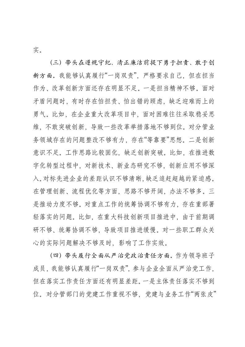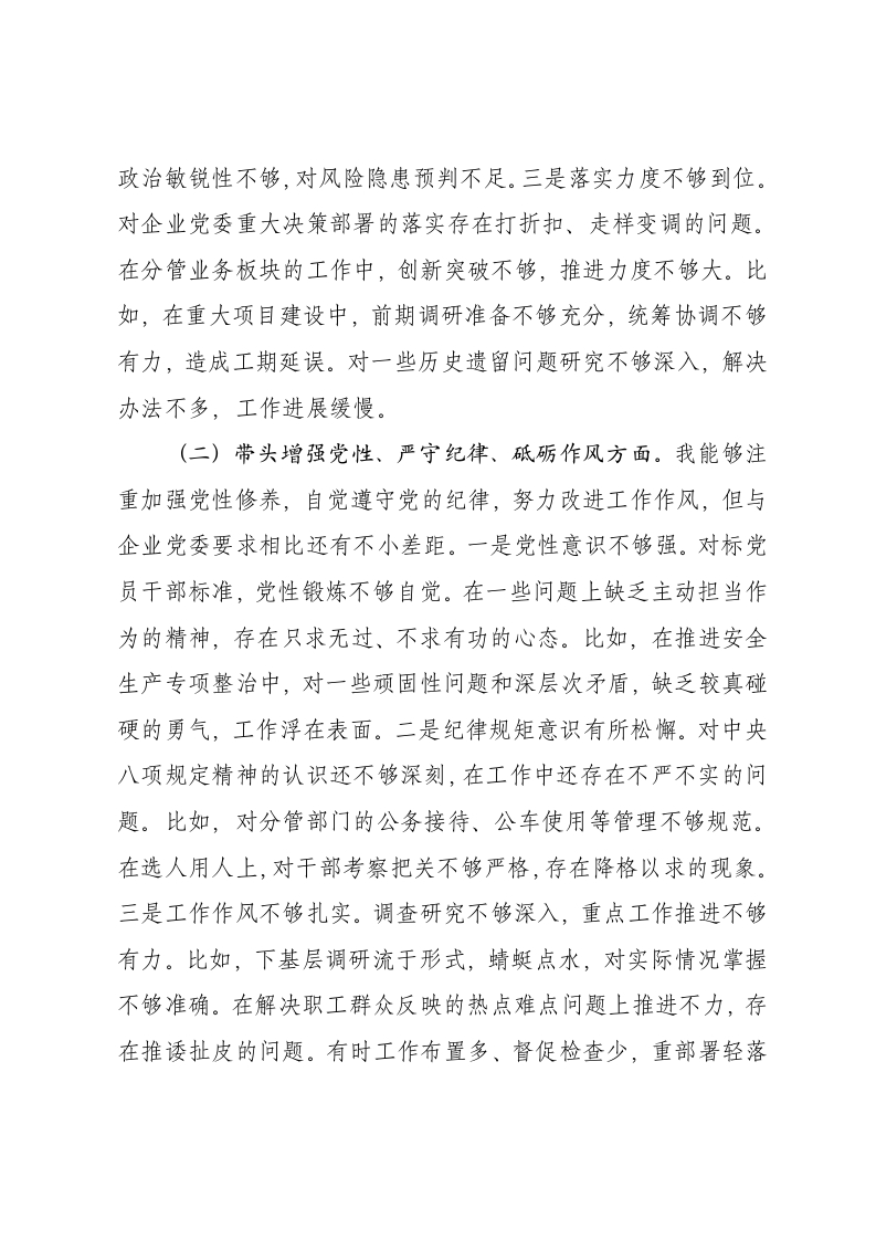 国企副总经理2024年度民主生活会个人对照检查材料(四个带头)按照《关于开好2024年度党员领导干部民主生活会的通知》要求,我深入学习贯彻习近平新时代中国特色社会主义思想和党的二十届三中全会精神,紧扣“四个带头”主题,深入开展谈心谈话,广泛征求意见,认真查摆问题,深刻检视反思,现将个人对照检查情况汇报如下:一、问题查摆(一)带头严守政治纪律和政治规矩方面。作为企业班子成员,我能够认真学习贯彻习近平新时代中国特色社会主义思想,深入贯彻党的二十大和二十届三中全会精神,自觉在思想上政治上行动上同以习近平同志为核心的党中央保持高度一致。但对标新时代新要求,还存在以下问题和不足:一是政治理论学习不够深入系统。理论学习还不够系统深入,存在应付心态。比如,在学习二十届三中全会精神时,仅限于文件的表层含义,对全面深化改革的深刻内涵学习思考不够。在企业改革三年行动等重要政策的学习理解上也停留在表面,对如何结合分管工作具体落实思考不够深入。二是政治站位不够高。在分管工作中,对标新时代国企工作的政治性、责任性要求还不够到位。比如,在推进企业科技创新工作时,对国家战略需求和产业布局研究不够深入,缺乏主动服务国家战略的意识。在推进供应链安全保障等工作中,