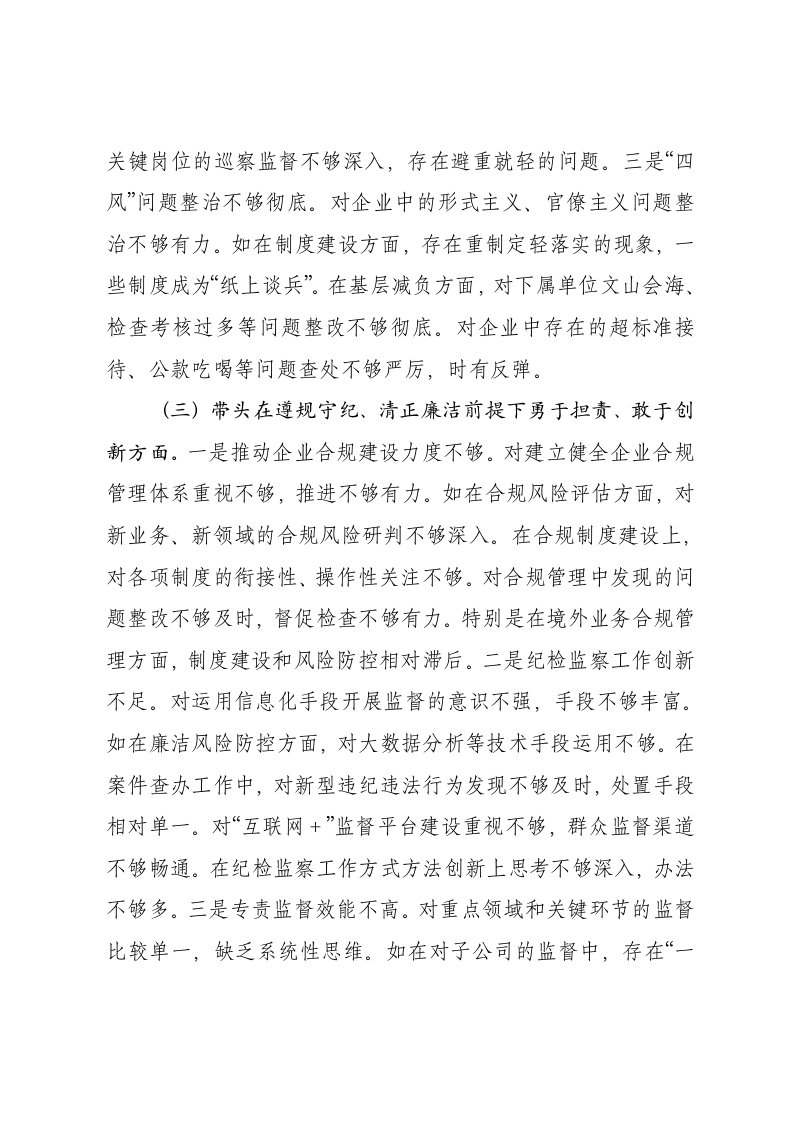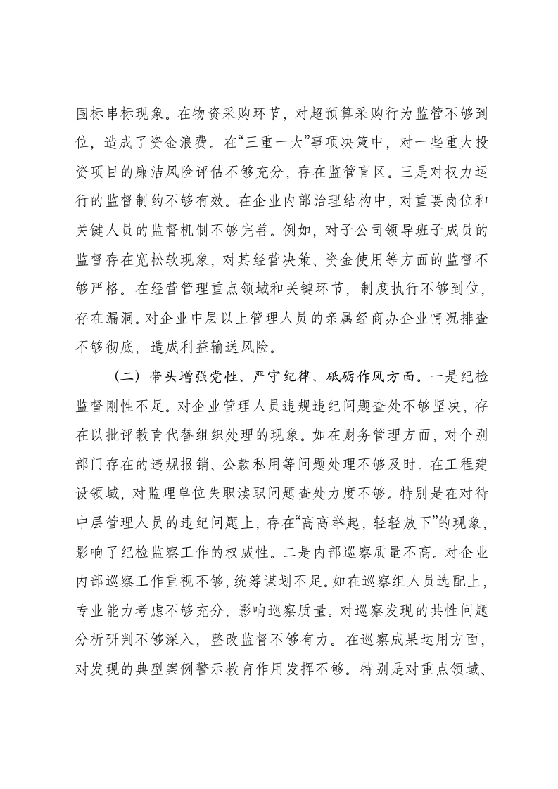国企纪委书记2024年民主生活会对照发言材料(四个带头)按照上级党委和集团公司党委关于开好2024年度党员领导干部民主生活会的要求,我紧扣“深入学习贯彻习近平新时代中国特色社会主义思想,巩固深化党纪学习教育成果,综合发挥党的纪律教育约束、保障激励作用,为进一步全面深化改革、推进中国式现代化提供坚强纪律保证”主题,对照新修订的《中国共产党纪律处分条例》,结合分管工作和个人实际,深入查找问题,认真进行对照检查。现将个人对照检查情况汇报如下:一、存在的主要问题(一)带头严守政治纪律和政治规矩方面。一是落实国企党建工作要求不够彻底。对国有企业在中国特色社会主义事业中的重要地位和作用认识不够深刻,在推进党建工作与企业发展深度融合方面下功夫不够。例如,在公司各下属企业党建工作考核中,考核指标设置不够科学,存在“一刀切”现象。对基层党支部党建与业务工作“两张皮”问题重视不够,发现后处理不够及时。在推进混合所有制企业党建工作中,指导监督不够有力,导致一些子公司党的领导作用发挥不够充分。二是国企廉洁风险防控体系不够健全。对企业在国有资产管理、项目投资、物资采购、市场营销等关键环节的廉洁风险研判不够深入,防控措施不够有力。如在工程项目招投标过程中,对供应商资格审查把关不严,出现了