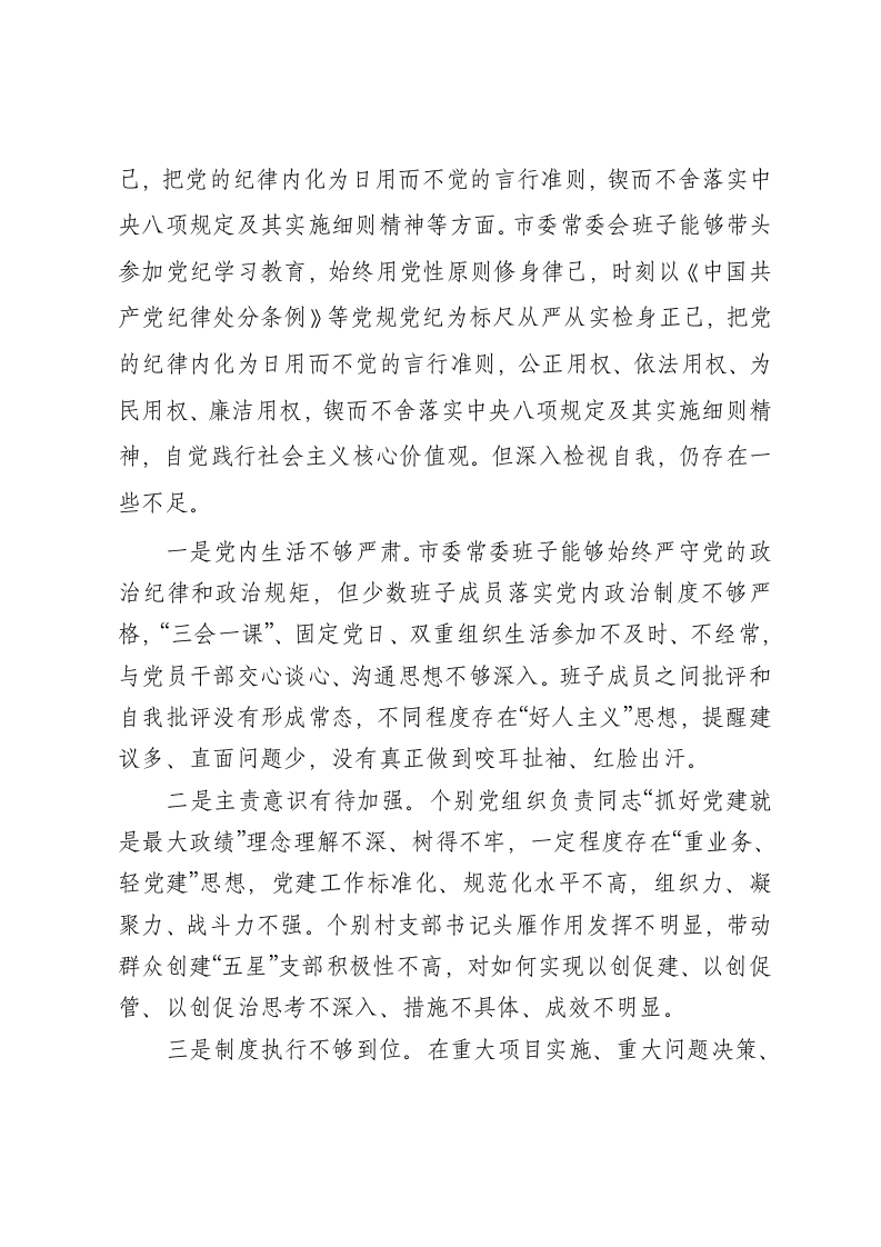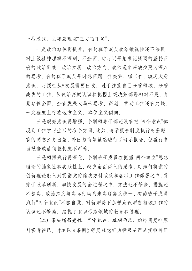 常委会领导班子2024年度民主生活会“四个带头”对照检查剖析材料根据关于召开2024年度民主生活会的通知要求,市委常委会班子认真组织学习习近平总书记重要讲话重要指示精神和党章、《中国共产党纪律处分条例》《中共中央办公厅关于推进党纪学习教育常态化长效化的意见》等重要内容,在认真开展谈心谈话、广泛征求意见建议基础上,围绕“四个带头”深入查找自身短板不足,深入剖析存在的问题,反思问题产生的根源,明确下步整改措施。现将班子对照检查情况报告如下:一、存在的主要问题及具体表现(一)带头严守政治纪律和政治规矩,维护党的团结统一。健全落实以学铸魂、以学增智、以学正风、以学促干长效机制,深刻领悟“两个确立”的决定性意义,坚决做到“两个维护”,自觉防止和反对个人主义、分散主义、自由主义、本位主义方面。市委常委会班子始终坚持把纪律和规矩挺在前面,毫不放松抓好纪律建设,班子成员大部分能够时刻牢记自已的第一身份是共产党员,第一职责是为党工作,始终坚持政治立场、党性原则和底线思维,带头严守政治纪律和政治规矩,把党性锤炼作为自我净化、自我完善、自我革新、自我提高的长期过程,常抓不懈、久久为功。但对照学纪、知纪、明纪、守纪更高标准和健全落实以学铸魂、以学增智、以学正风、以学促干长效机制更严要求,还存在