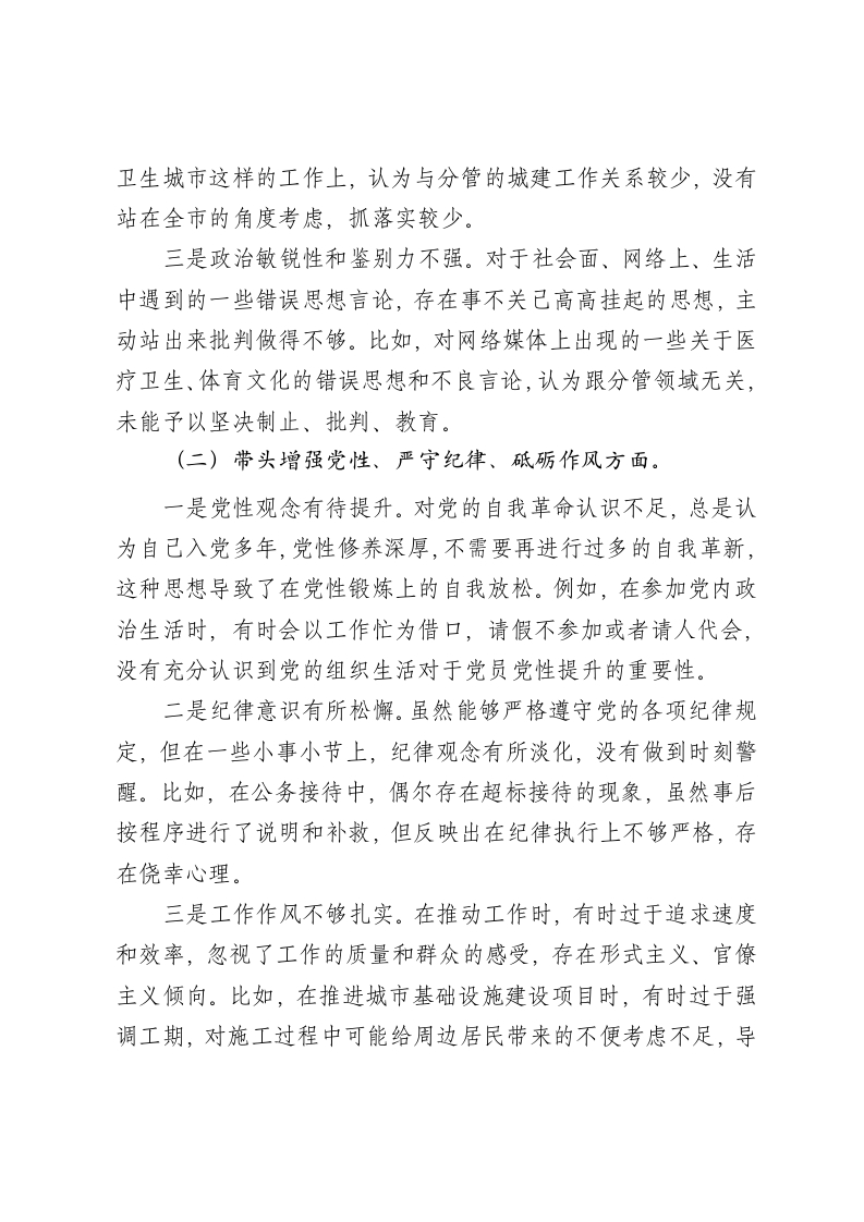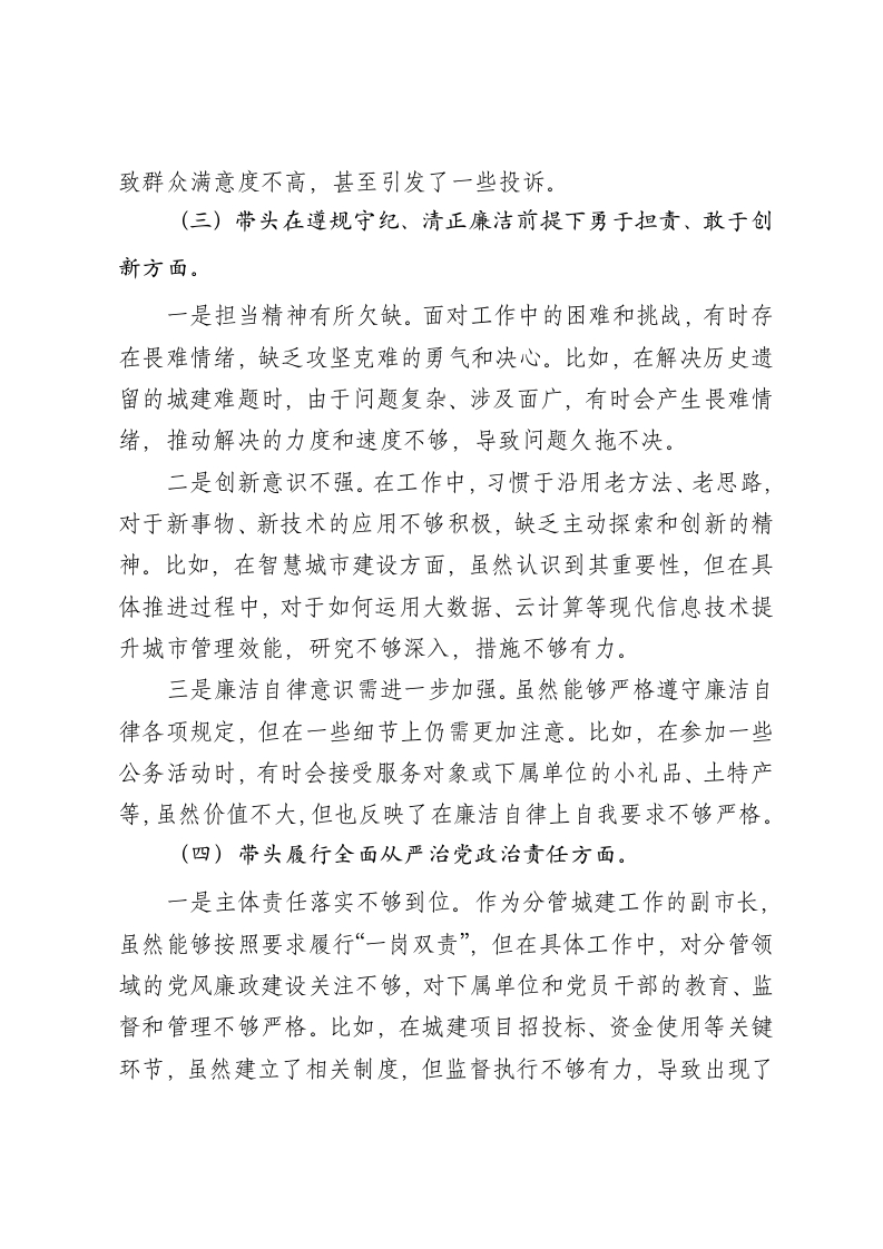 某分管城建工作副市长2024年民主生活会对照检查材料根据中央和省、市委部署要求及政府党组统一安排,会前,我紧扣本次民主生活会主题,原原本本的学习了党的二十届三中全会公报、新修订的《中国共产党纪律处分条例》和习近平总书记论党的自我革命、论全面从严治党等重要论述摘编以及系列重要指示批示精神,在班子成员之间开展了谈心谈话,互相虚心听取意见建议。在此基础上,严格按照民主生活会要求,紧扣思想、工作和生活实际,认真检视查摆自身存在的突出问题,深入剖析问题产生的根源,进一步明晰了今后的努力方向和整改措施。现将有关情况对照检查如下:一、存在的突出问题(一)带头严守政治纪律和政治规矩,维护党的团结统一方面。一是政治意识有待提升。主动学习政治理论的主管意愿不够强烈,满足于现用现学,对政策理论没有做到深入钻研,精学细悟。比如,学习时仅仅局限于按照政府党组学习计划和理论中心组集体学习开展,仅满足于完成学习计划和学习内容,浮于表面、浅尝辄止,没有做到用党的最新理论武装头脑、指导实践。二是大局意识不足。在具体抓工作落实过程中,习惯于从自己分管的“一亩三分地”出发,在运用发展且全面的目光看待问题,推动全盘谋划和协调发展上做得不够好。比如,在涉及到像创建