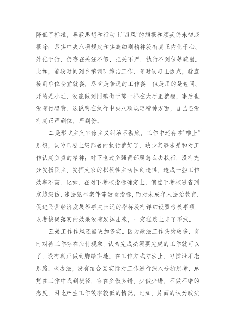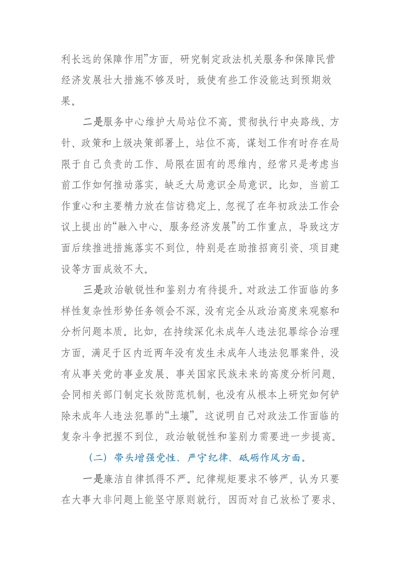 某区委常委、政法委书记2024年度民主生活会对照检查材料根据关于召开2024年度专题民主生活会方案安排,紧扣此次民主生活会主题,我认真学习领会X思想和X全会精神,深入学习了习近平总书记关于党的建设的重要思想、关于党的自我革命的重要思想以及关于全面加强党的纪律建设的重要论述、关于全面深化改革的一系列新思想新观点新论断,认真学习《中国共产党纪律处分条例》等规定篇目。通过学习,进一步加深了认识理解,提高了政治觉悟。会前,与其他领导班子成员、分管负责人进行了谈心谈话,扎实开展自检自查,虚心听取了各位同志的意见建议;联系自身实际深入查找存在的差距和不足,剖析产生问题原因,制定改进措施,明确今后努力方向。现将对照检查情况报告如下:一、存在的突出问题(一)带头严守政治纪律和政治规矩,维护党的团结统一方面。一是落实上级决策部署不够及时主动。在贯彻落实上级决策部署上,由于自身能力水平的原因,从学习领会到消化吸收再到自觉执行的过程比较慢,导致有些认识和执行不够及时到位。比如,落实上级提出的“政法机关聚焦经济建设这一中心工作和高质量发展这一首要任务,发挥法治固根本、稳预期、