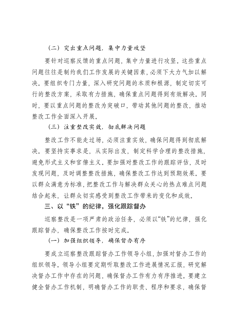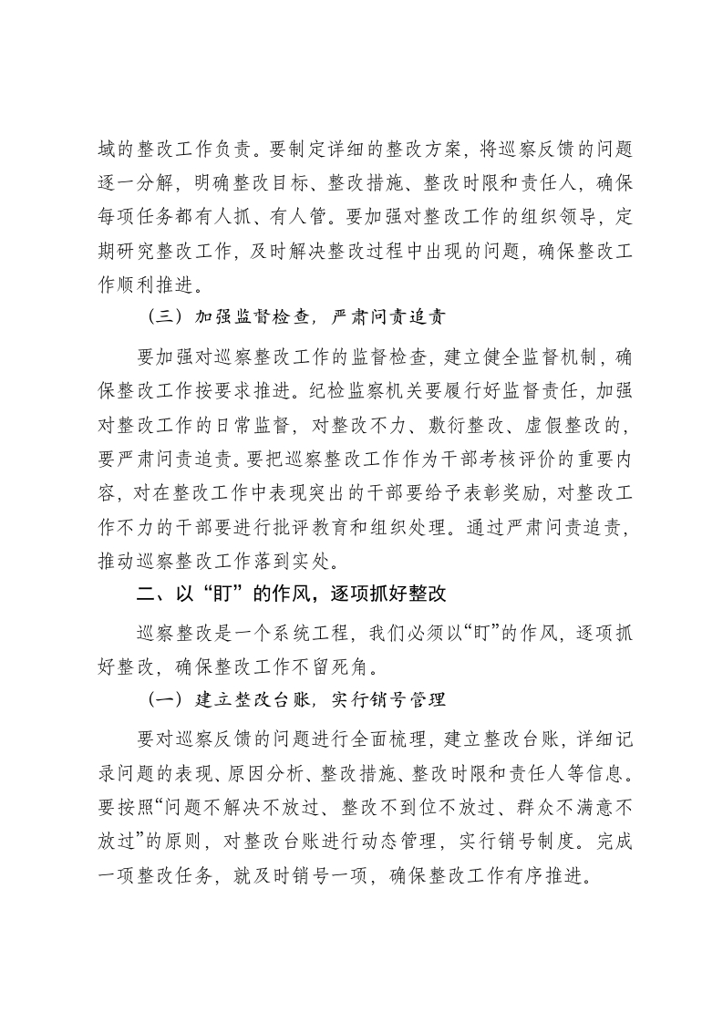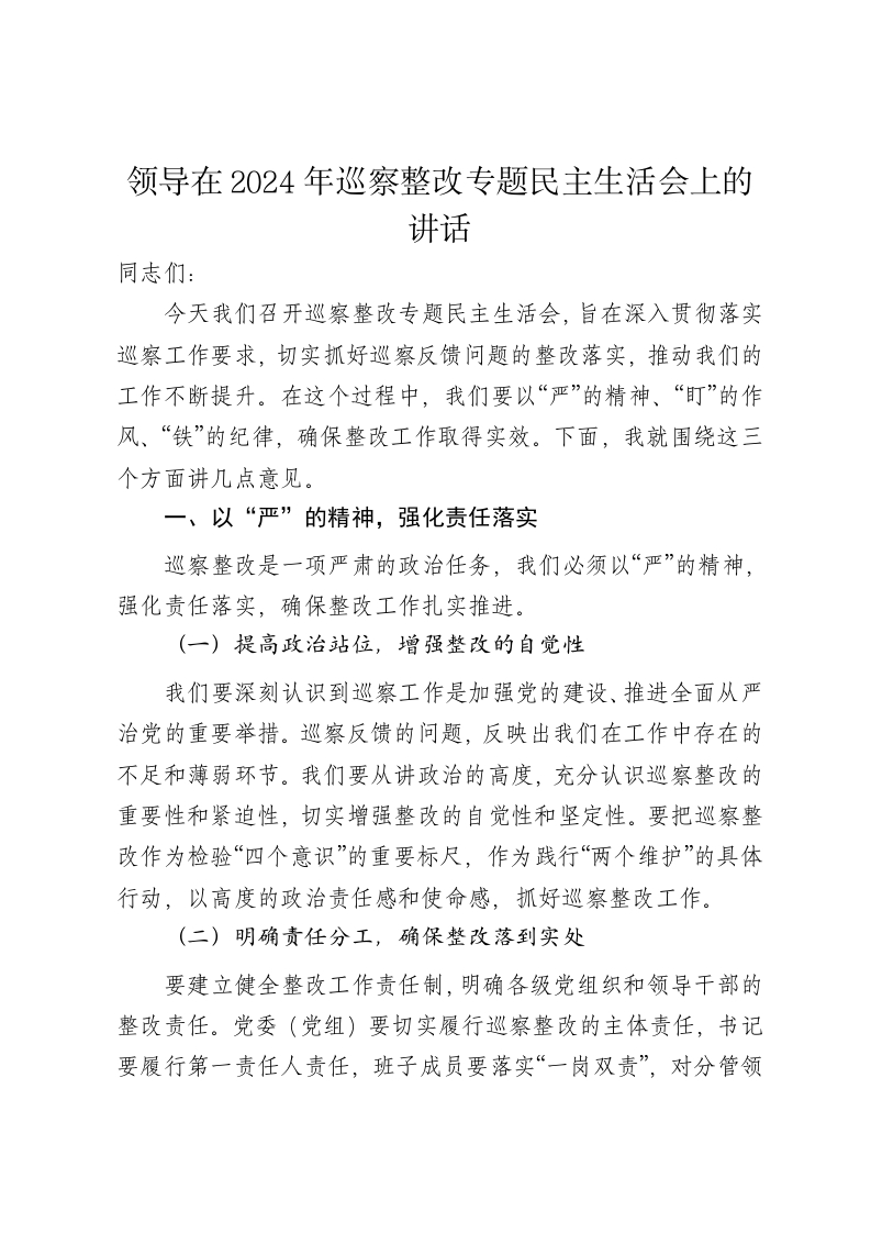 领导在2024年巡察整改专题民主生活会上的讲话同志们:今天我们召开巡察整改专题民主生活会,旨在深入贯彻落实巡察工作要求,切实抓好巡察反馈问题的整改落实,推动我们的工作不断提升。在这个过程中,我们要以“严”的精神、“盯”的作风、“铁”的纪律,确保整改工作取得实效。下面,我就围绕这三个方面讲几点意见。一、以“严”的精神,强化责任落实巡察整改是一项严肃的政治任务,我们必须以“严”的精神,强化责任落实,确保整改工作扎实推进。(一)提高政治站位,增强整改的自觉性我们要深刻认识到巡察工作是加强党的建设、推进全面从严治党的重要举措。巡察反馈的问题,反映出我们在工作中存在的不足和薄弱环节。我们要从讲政治的高度,充分认识巡察整改的重要性和紧迫性,切实增强整改的自觉性和坚定性。要把巡察整改作为检验“四个意识”的重要标尺,作为践行“两个维护”的具体行动,以高度的政治责任感和使命感,抓好巡察整改工作。(二)明确责任分工,确保整改落到实处要建立健全整改工作责任制,明确各级党组织和领导干部的整改责任。党委(党组)要切实履行巡察整改的主体责任,书记要履行第一责任人责任,班子成员要落实“一岗双责”,对分管领