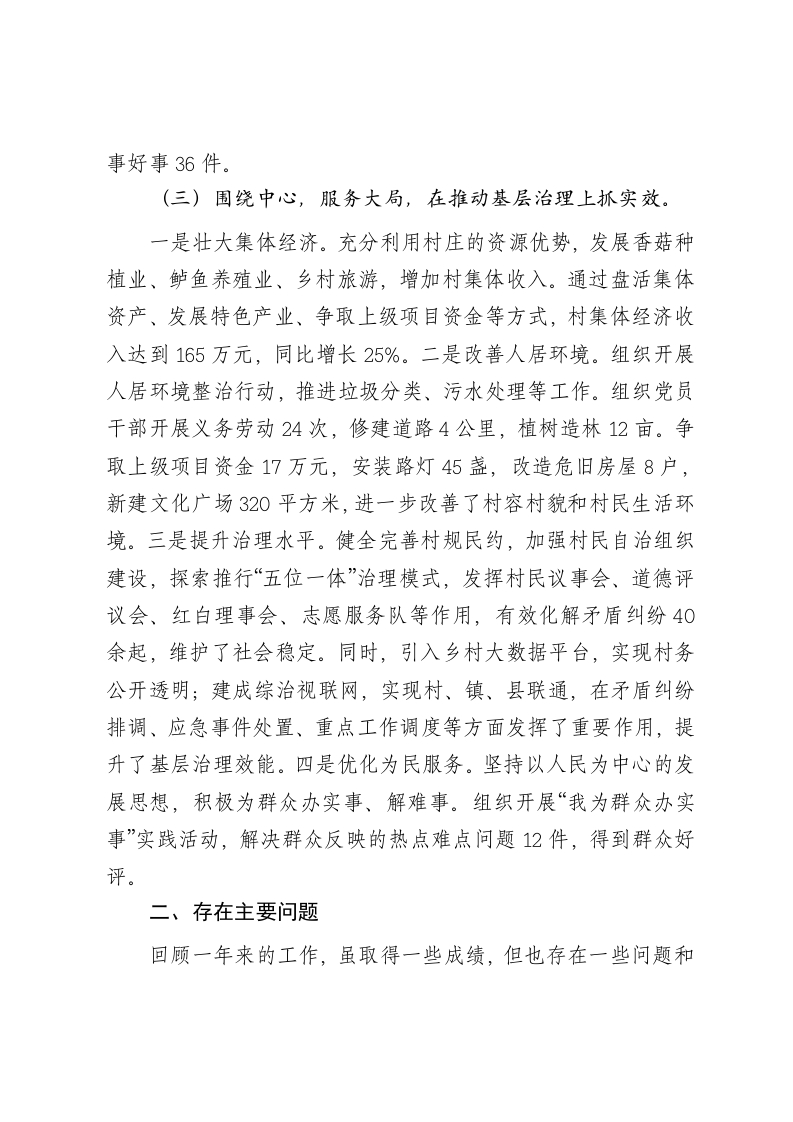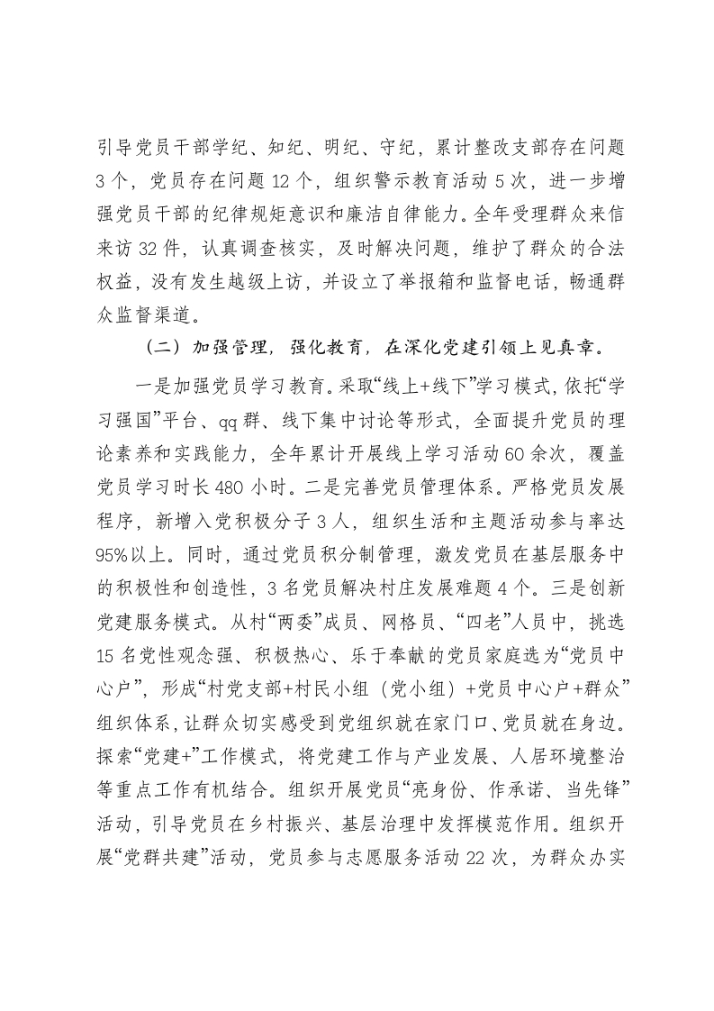 2024年村党支部书记抓基层党建工作述职报告2024年,在镇党委、政府的坚强领导下,本人严格履行党建“第一责任人”职责,团结带领村“两委”班子成员,紧紧围绕中心工作,以提升组织力为重点,以服务群众为核心,扎实开展各项工作,并取得一定成效。一、工作开展情况(一)履职尽责,强化担当,在落实主体责任上下功夫。一是严抓责任落实。严格落实“第一责任人”职责,把党建工作作为核心任务抓紧抓实,全年组织集中学习习近平新时代中国特色社会主义思想、党的二十届三中全会精神以及习近平总书记关于乡村振兴的重要论述16次,开展专题研讨12次,人均撰写心得体会4篇,不断提高党员干部政治判断力、政治领悟力、政治执行力。召开专题会议研究部署党建工作,全面推进“三会一课”、主题党日等基本制度,确保党建工作规范化、制度化、常态化,累计组织党员大会4次、支委会12次、讲党课4次,党建专题讲座6次。二是严肃组织生活。通过召开组织生活会、民主评议党员、谈心谈话等活动,深入查摆问题、剖析根源、落实整改,确保党内生活高质量开展,全年召开组织生活会3次,民主评议党员活动1次,谈心谈话35人次,提升了支部的凝聚力和战斗力。三是强化党风廉政教育。围绕党纪学习教育目标要求和学习重点,扎实做好党纪学习、警示教育、检视整改等工作,