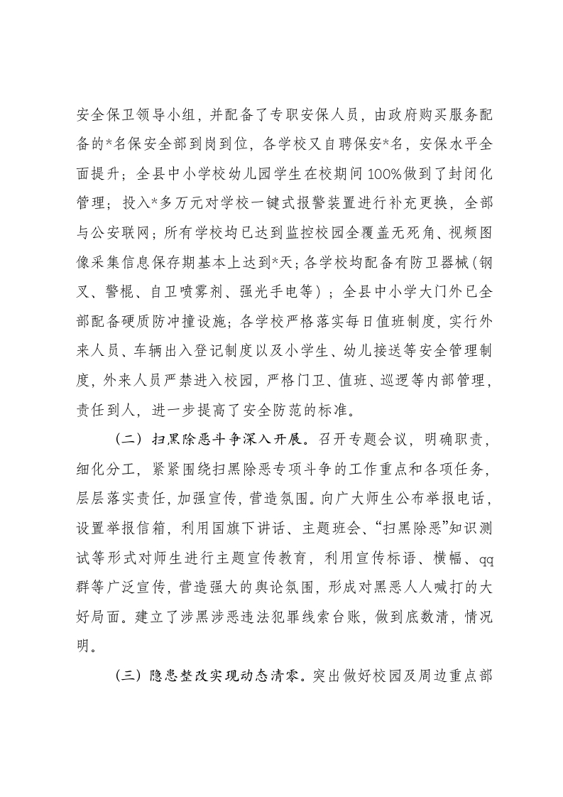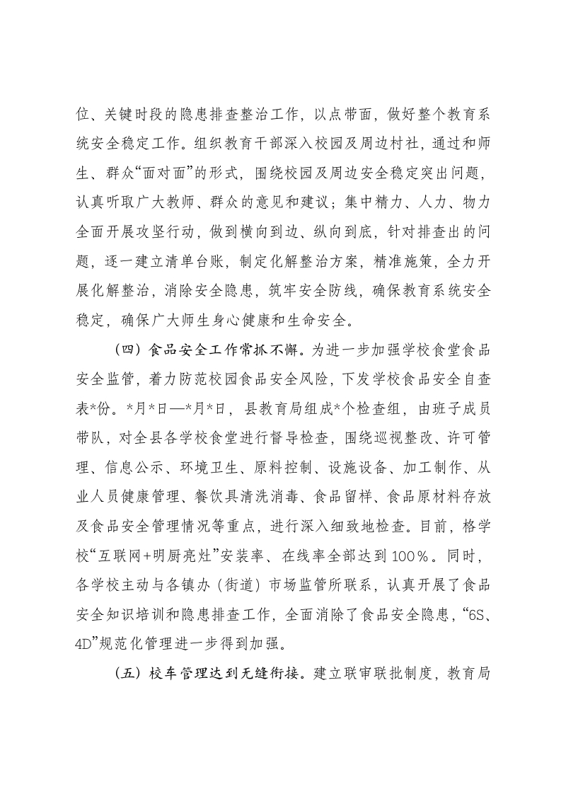 县教育局长2024年平安建设述职报告今年以来,我积极带领县教育局一班人,紧紧围绕中央、省市县关于平安建设的一系列决策部署,进一步落实平安建设“党政同责、一岗双责、齐抓共管”的责任体系,全力做好校园平安建设工作,营造出和谐安定的育人环境。现将履行工作职责情况报告如下:一、提升站位,精心安排部署结合教育系统实际,成立了校园及周边环境治理工作专班,明确了工作目标、行动重点和具体要求,将平安建设作为重大政治任务和重要民生工程。坚持亲自抓、分管领导具体抓、校园长共同抓,形成大平安建设工作格局。局党组先后*次召开平安建设专题部署会议、推进会议研究部署、推动落实,及时传达县委相关工作会议精神和部署要求,印发《“平安校园”创建工作实施方案》《校园周边环境综合治理及信访维稳专项整治工作方案》《教育系统安全稳定“大走访大调研大排查大化解”活动方案》等相关文件。召开校园长专题会*次,研究部署平安建设成功巩固提升工作,我亲自安排部署,要求各校园以“平安校园创建”为抓手,营造浓厚的宣传氛围。开展平安专项行动*次,有效治理了校园及周边环境秩序。努力推进双重预防体系建设。规模以上学校双重预防体系建成*所,占比达到*%。二、明确重点,实施综合整治(一)学校安防水平持续提升。全县中小学(园)均成立有