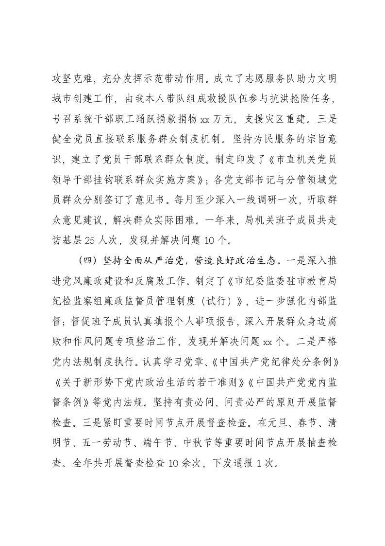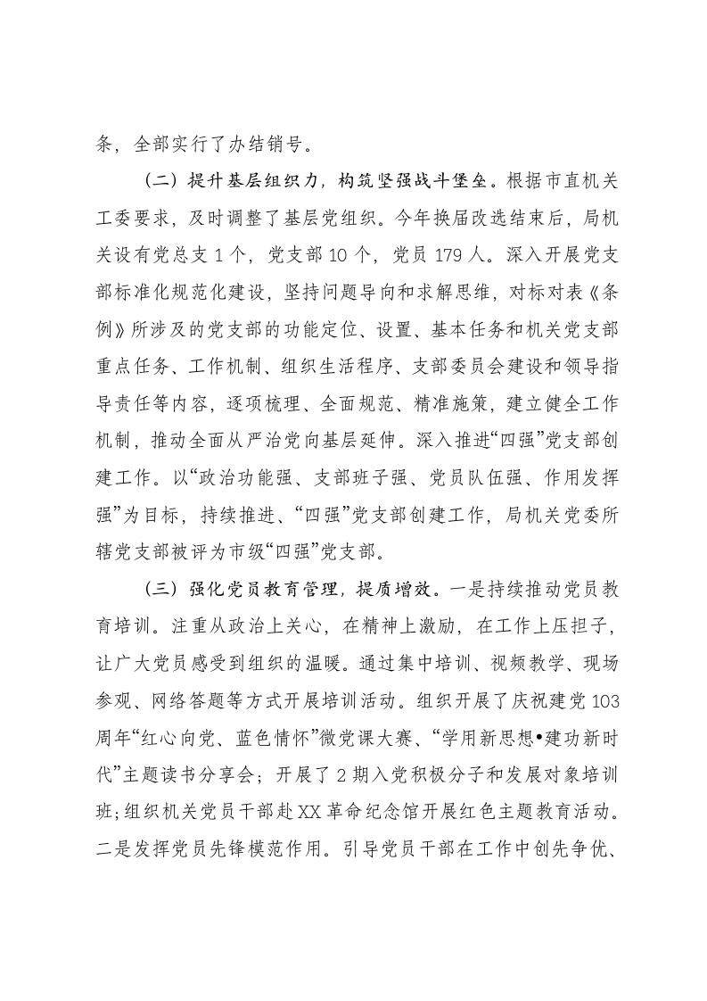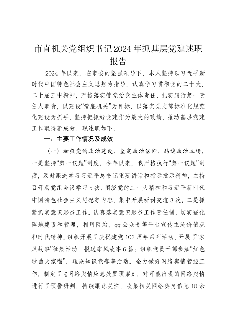 市直机关党组织书记2024年抓基层党建述职报告2024年以来,在市委的坚强领导下,本人坚持以习近平新时代中国特色社会主义思想为指导,认真学习贯彻党的二十大、二十届三中精神,严格落实管党治党主体责任,扎实履行第一责任人职责,以建设“清廉机关”为目标,以落实党支部标准化规范化建设为抓手,坚持把抓好党建作为最大的政绩,推动基层党建工作取得新成效。现述职如下:一、主要工作情况及成效(一)加强党的政治建设,坚定政治信仰,站稳政治立场。一是坚持“第一议题”制度。今年以来,我严格执行“第一议题”制度,及时跟进学习习近平总书记重要讲话和指示批示精神,主持召开局党组会议学习5次。围绕党的二十大精神和习近平新时代中国特色社会主义思想等内容,集中开展研讨交流3次。二是抓紧抓实意识形态工作。认真落实意识形态工作责任制,切实强化阵地建设和管理,利用网站、qg公众号等平台宣传主流价值观和时代精神。组织开展了庆祝建党103周年系列活动,开展了“家风故事”征集活动,报送家风故事6篇;组织党员干部参加“红色歌曲大家唱”、理论知识竞赛等活动。全力做好网络舆情管控工作,制定了《网络舆情应急处置预案》,对可能出现的网络舆情进行了预警研判,持续跟踪关注,收集相关网络舆情信息10余