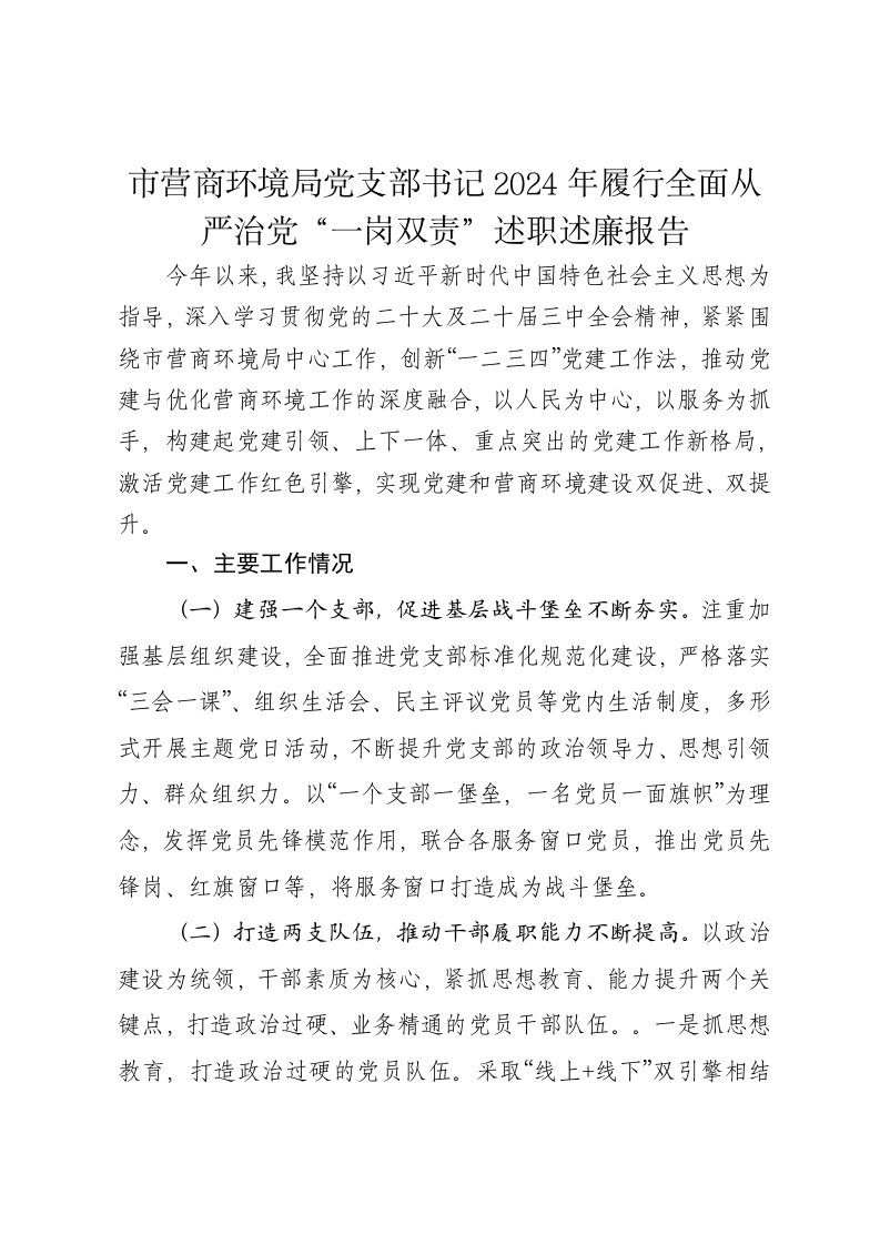 市营商环境局党支部书记2024年履行全面从严治党“一岗双责”述职述廉报告今年以来,我坚持以习近平新时代中国特色社会主义思想为指导,深入学习贯彻党的二十大及二十届三中全会精神,紧紧围绕市营商环境局中心工作,创新“一二三四”党建工作法,推动党建与优化营商环境工作的深度融合,以人民为中心,以服务为抓手,构建起党建引领、上下一体、重点突出的党建工作新格局,激活党建工作红色引擎,实现党建和营商环境建设双促进、双提升。一、主要工作情况(一)建强一个支部,促进基层战斗堡垒不断夯实。注重加强基层组织建设,全面推进党支部标准化规范化建设,严格落实“三会一课”、组织生活会、民主评议党员等党内生活制度,多形式开展主题党日活动,不断提升党支部的政治领导力、思想引领力、群众组织力。以“一个支部一堡垒,一名党员一面旗帜”为理念,发挥党员先锋模范作用,联合各服务窗口党员,推出党员先锋岗、红旗窗口等,将服务窗口打造成为战斗堡垒。(二)打造两支队伍,推动干部履职能力不断提高。以政治建设为统领,干部素质为核心,紧抓思想教育、能力提升两个关键点,打造政治过硬、业务精通的党员干部队伍。。一是抓思想教育,打造政治过硬的党员队伍。采取“线上+线下”双引擎相结