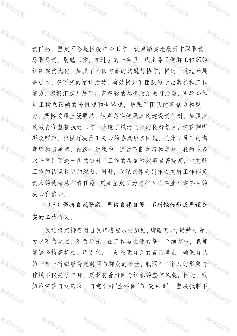 2024年度个人年终工作总结时光荏苒,岁月如梭,不觉间我们已经迎来了2024年的尾声。在这一年里,得承蒙上级领导的悉心指导和同事们的支持,我始终坚守在本职岗位上,兢兢业业,尽心尽力,顺利地完成了年度工作计划以及上级交付的各项任务。在此,现将一年来的主要收获、存在问题及今后的改进计划汇报如下:一、勤勉履职,立足岗位锐意进取,开创工作新局面。(一)持续深化学习,筑牢思想根基,为事业发展注入强劲动力。作为新时代的青年,我将持续学习提升作为工作的重中之重,不断从丰富的理论知识中汲取智慧与力量,以实现自我价值的升华。在过去的一年里,我不仅深入学习了习近平新时代中国特色社会主义思想,始终保持信念的坚定与方向的明确,力求在思想上、政治上、行动上始终与党中央保持高度一致,争做理论上的清醒者、政治上的明白人。另一方面,我深知业务知识的更新与积累对于提升工作效率与质量的重要性。因此,我注重将理论学习与实践操作紧密结合,将书本上的知识转化为工作中的实际行动,不断在业务领域内深耕细作,力求在专业技能上精益求精,以更好地服务于本职工作,为单位的发展贡献自己的力量。(二)始终恪尽职守,全面忠诚履职,全面高效推进各项任务落实。身为党群工作部的负责人,我始终坚守对单位和事业的高度