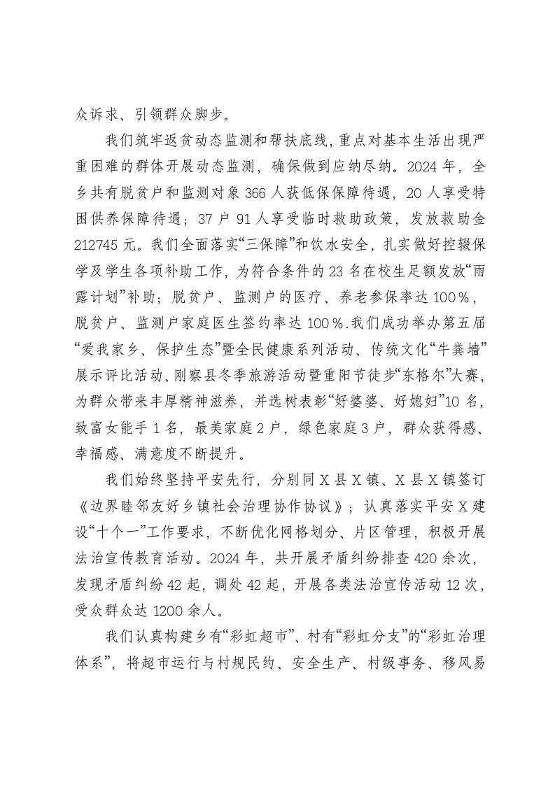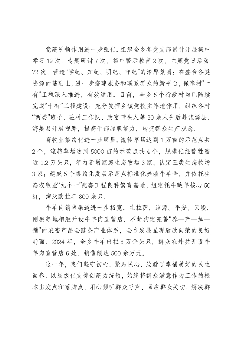 乡党委书记在乡2024年度总结暨表彰大会上的讲话各位领导、同志们:岁月不居,时节如流。在辞旧迎新之际,我们欢聚一堂,隆重召开X乡2024年度工作总结暨表彰大会,主要任务是表彰先进,树立典型,进一步营造万众一心加油干、越是艰险越向前的浓厚氛围,激励全乡上下坚定信心、振奋精神,奋力开创X乡各项事业高质量发展新局面。今天受表彰的先进集体和优秀个人,都是努力拼搏、成绩卓越的代表,他们用汗水浇灌收获,用奋斗诠释担当,树起了一面面争先创优的旗帜。在此,我代表乡党委、政府向受表彰的先进集体和先进个人表示热烈的祝贺!向大家一年来的辛勤付出表示衷心的感谢!下面我讲三方面的内容。一、肯定成绩,保持定力增强信心2024年,是全面学习贯彻党的二十届三中全会精神的开局之年,是进一步深化改革的起步之年,更是我们加压奋进、乘势而上的关键之年。乡党委、政府团结带领全乡干部群众,抓机遇,谋发展,破难题、求奋进,圆满完成全年目标任务,经济社会各项事业稳步迈上新台阶。这一年,我们顶压前行、砥砺奋进,保持了稳定增长的强劲态势,村集体经济“节节攀高”。2024年,村级集体经济收入累计为X万元,较2023年增长了X%.