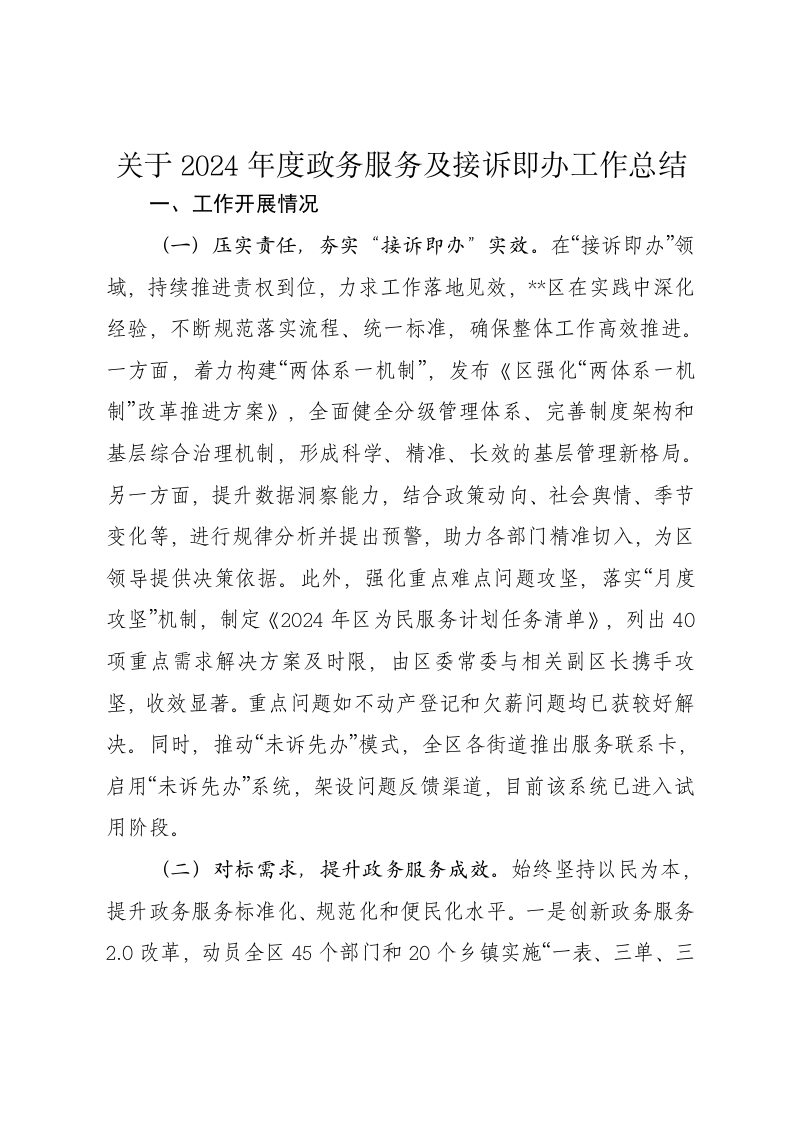 关于2024年度政务服务及接诉即办工作总结一、工作开展情况(一)压实责任,夯实“接诉即办”实效。在“接诉即办”领域,持续推进责权到位,力求工作落地见效,*区在实践中深化经验,不断规范落实流程、统一标准,确保整体工作高效推进。一方面,着力构建“两体系一机制”,发布《区强化“两体系一机制”改革推进方案》,全面健全分级管理体系、完善制度架构和基层综合治理机制,形成科学、精准、长效的基层管理新格局。另一方面,提升数据洞察能力,结合政策动向、社会舆情、季节变化等,进行规律分析并提出预警,助力各部门精准切入,为区领导提供决策依据。此外,强化重点难点问题攻坚,落实“月度攻坚”机制,制定《2024年区为民服务计划任务清单》,列出40项重点需求解决方案及时限,由区委常委与相关副区长携手攻坚,收效显著。重点问题如不动产登记和欠薪问题均已获较好解决。同时,推动“未诉先办”模式,全区各街道推出服务联系卡,启用“未诉先办”系统,架设问题反馈渠道,目前该系统已进入试用阶段。(二)对标需求,提升政务服务成效。始终坚持以民为本,提升政务服务标准化、规范化和便民化水平。一是创新政务服务2.0改革,动员全区45个部门和20个乡镇实施“一表、三单、三