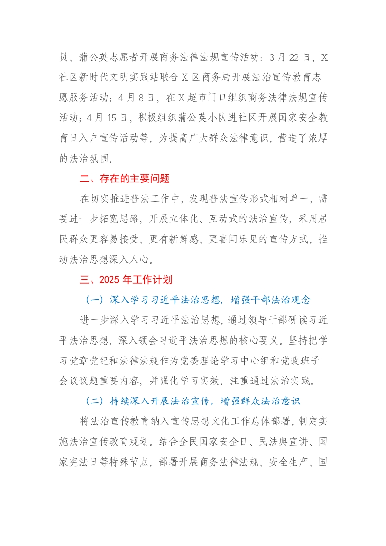 关于2024年度法治政府建设工作落实情况的总结报告及2025年工作计划2024年,我局坚持以习近平新时代中国特色社会主义思想为指导,深入贯彻落实党的X大精神和习近平法治思想,紧紧围绕法治政府建设的总体目标,不断强化组织领导,深化法治宣传教育,努力推进依法行政和执法规范化。现将有关情况报告如下:一、工作开展情况(一)强化组织领导,夯实法治思维我局高度重视法治政府建设工作,认真落实“谁执法谁普法”责任制,将法治建设纳入重要议事日程,与经济工作、党建工作同部署、同推进、同落实。及时成立法治政府建设领导小组,确保法治建设各项任务得到有效落实。3月20日、9月11日分别召开领导小组会议,研究部署法治政府建设工作的具体措施和实施步骤,及时解决工作中遇到的问题和困难。(二)提升法治素养,深化法治宣传始终坚持将法治宣传教育作为推进法治政府建设的重要抓手。通过组织召开9月29日党组理论学习中心组学习会、10月16日党员理论学习会、法律知识竞答等多种形式,深入学习贯彻习近平法治思想。同时,我局积极参与“5.14民法宣传月”、“12.4宪法宣传周”等区级集中宣传活动外,组织我局党