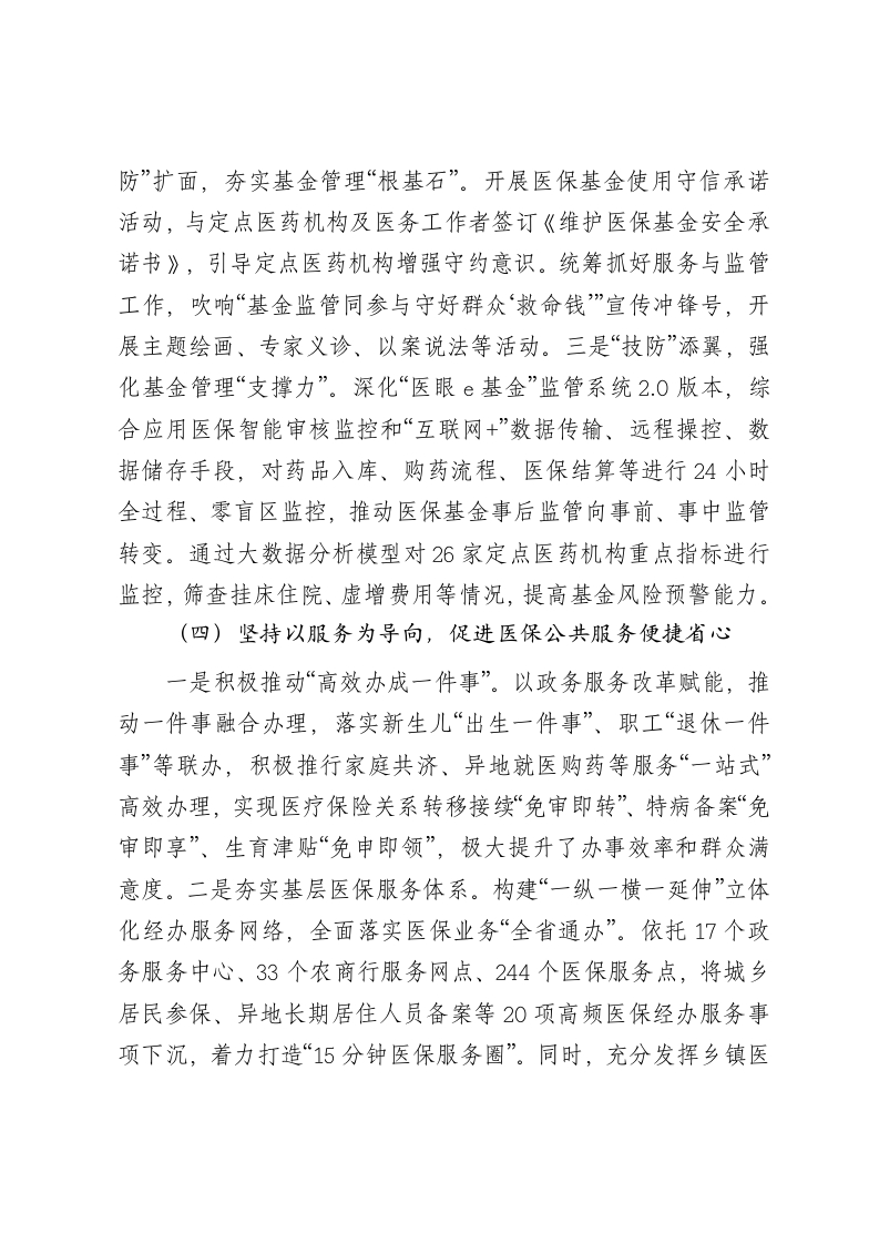 县医疗保障局2024年工作总结和2025年工作思路今年以来,县医疗保障局在县委县政府的正确领导下,坚持以人民健康为中心,紧紧围绕医保领域重点任务和关键环节,上下齐心,攻坚克难,大力推进改革深化、医药管理、监管创新,强力推动各项医保重点工作落地见效。一、2024年工作情况截至目前,我县基本医疗保险参保人数306723人,其中职工医疗保险参保人数40519人,城乡居民医疗保险参保266204人。生育保险参保人数29869人,长护险参保人数40519人。(一)坚持以利民为根本,持续织密多层次医疗保障网一是打好“医保纾困”品牌战。加大困难群众医保帮扶倾斜力度,实现困难群众资助参保、医疗救助、高额化解三个100%。落实门诊特殊病种管理,在原门诊特殊病基础上,新增失代偿期肝硬化、脑瘫、帕金森病等3个病种纳入特殊病种目录。二是打好全民参保突破战。以辖区常住人口为基础,通过建立完善教育、公安、民政等部门的数据共享交换机制,加强人员信息比对和共享,核实断保、停保人员情况,精准锁定本地区户籍人口和常住人口中的未参保人群,形成全民参保数据库,实现“一人一档”有效管理。三是打好异地就医成果巩固战。全县22家定点医疗机构全部开通跨省就医购药医保直接结算服务,稳妥有序扩大跨省直接结算病种范围,在原有5种跨省门诊慢特病病种基础上,新