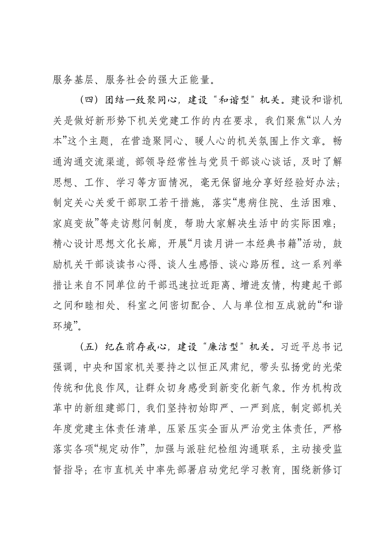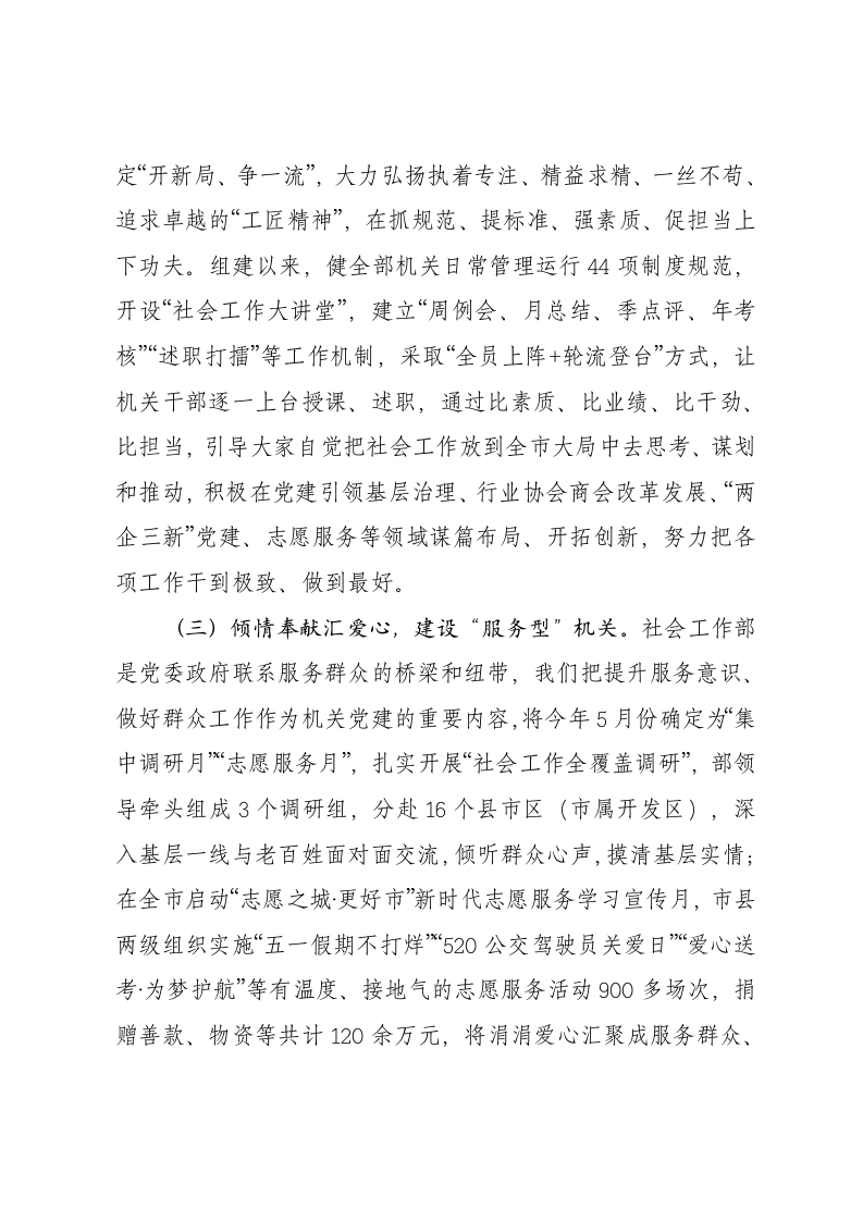市委社会工作部2024年度工作总结今年以来,市委社会工作部坚持以习近平新时代中国特色社会主义思想为指引,深入学习贯彻党的二十大及二十届三中全会精神,坚持政治立部、制度建部、学习强部、从严治部、作风兴部,深入学习贯彻习近平总书记“79”重要讲话精神,以创建“五心五型”模范机关为抓手,促进机关党建与业务工作双融合、双提升,有力推动全市社会工作开好局、启新程。一、主要工作情况(一)党建领航铸忠心,建设“政治型”机关。习近平总书记强调,带头做到“两个维护”,是加强中央和国家机关党的建设的首要任务。我们牢固树立政治机关意识,把政治性作为“第一属性”,把讲政治作为“第一要求”,研究确定全市社会工作“11353”总体思路,其中第一个“1”就是以坚持和加强党对社会工作的全面领导为“一个统领”,真正把对党忠诚贯穿于社会工作各方面、全过程;始终坚持用习近平新时代中国特色社会主义思想凝心铸魂,严格落实部务会“第一议题”、理论学习中心组学习等制度,第一时间传达学习习近平总书记视察市重要讲话重要指示精神,结合部门工作职责,研究贯彻落实措施,以实际行动坚定拥护“两个确立”、坚决做到“两个维护”。(二)事争一流锻匠心,建设“担当型”机关。习近平总书记指出,中央和国家机关党的建设必须走在前、作表率。我们锚