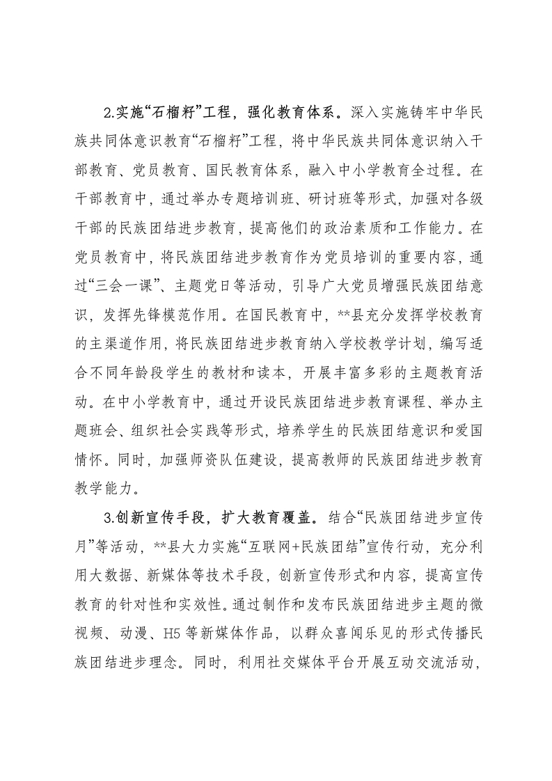 总结经验:四融互嵌拓出民族团结进步新气象近年来,*县深入贯彻落实习近平总书记关于加强和改进民族工作的重要思想,以铸牢中华民族共同体意识为主线,以“四融”为抓手,积极探索创新,有力推动民族团结进步创建工作提质增效,全县呈现出民族团结、社会和谐的良好局面。一、融“心”铸魂,筑牢思想之基1.丰富活动载体,讲好团结故事。*县以民族团结进步创建“十一进”活动为依托,充分整合线下线上资源,构建全方位、多层次的宣传教育体系。在线下,通过举办主题演讲、文艺汇演、知识竞赛等形式多样的活动,深入社区、学校、企业等基层单位,生动讲述各民族共同团结奋斗、共同繁荣发展的感人故事。同时,在公共场所设置宣传展板、悬挂横幅标语,营造浓厚的民族团结氛围。在线上,利用官方网站、qg公众号、短视频平台等新煤体渠道,发布民族团结进步相关的文章、图片、视频等内容,拓宽宣传教育的覆盖面和影响力。为了让民族团结进步的理念更加深入人心,*县还注重挖掘和培养本地的民族团结进步典型人物和事迹,通过他们的亲身经历和示范引领,激发广大群众参与民族团结进步创建的积极性和主动性。此外,积极开展民族团结进步教育进机关、进企业、进社区、进乡镇、进学校、进宗教场所等活动,推动民族团结进步教育常态化、制度化。