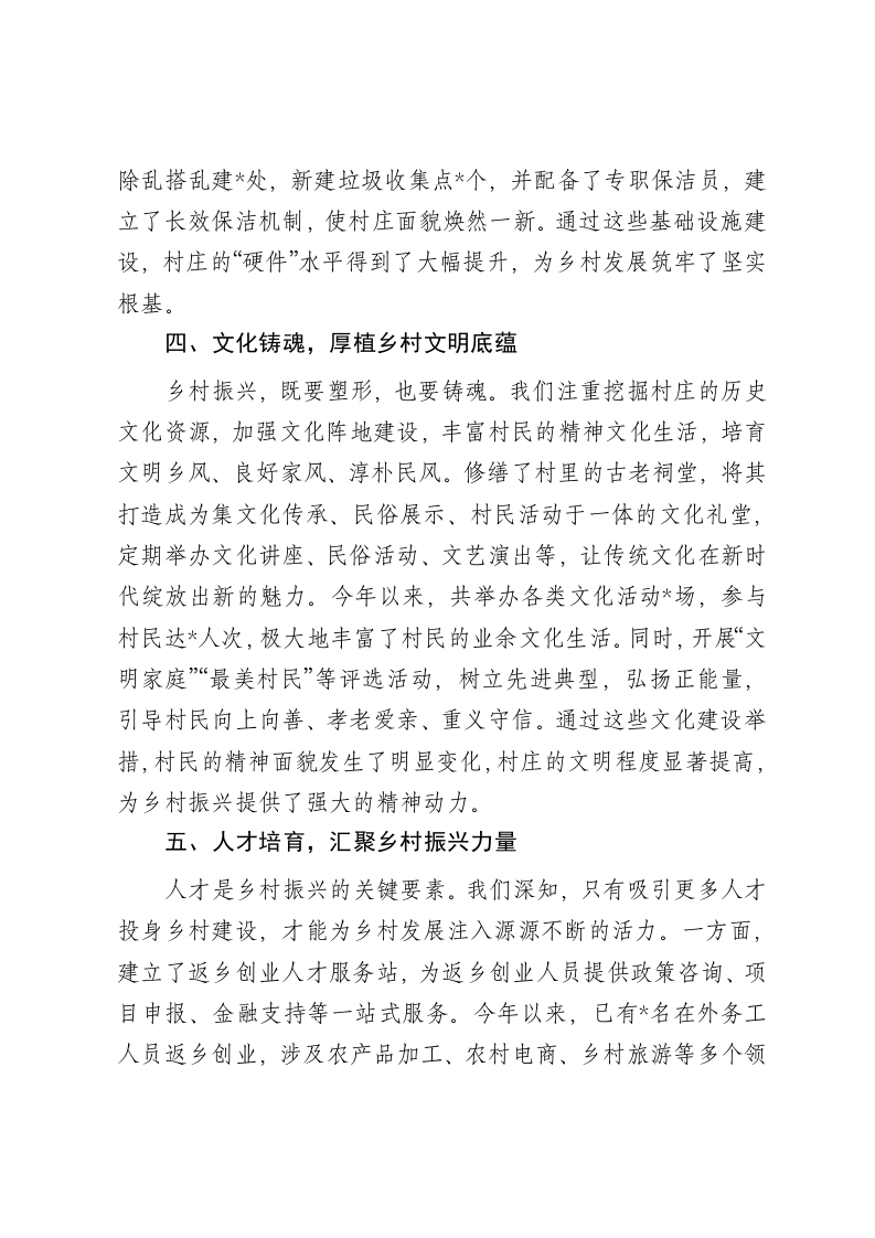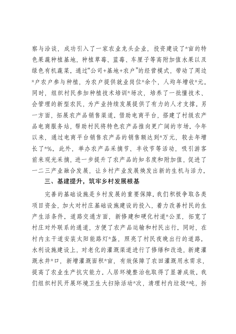 情系乡村促发展,驻村帮扶谱新篇2024年驻村工作总结2024年,作为驻村干部,我肩负着组织的信任与村民的期盼,扎根乡村这片广阔天地,全身心投入到乡村振兴的伟大事业中。这一年,我们见证了乡村的点滴变化,在奋斗中收获了成长与希望,也更加坚定了助力乡村走向繁荣的决心。一、精准调研,锚定乡村发展航向初到乡村,我们深知“没有调查就没有发言权”。为了深入了解村情民意,我们驻村工作队迅速组建调研小组,通过挨家挨户走访、召开村民代表座谈会、实地勘察农田山林等方式,对村庄的人口结构、经济收入、产业现状、基础设施以及村民的需求和期望进行了全方位、多层次的摸底调查。在为期两个月的调研中,我们累计走访村民*户,收集意见建议*余条,梳理出制约村庄发展的关键问题*个,如农业产业结构单一、基础设施薄弱、劳动力外流严重等。基于这些详实的一手资料,我们与村“两委”共同商讨制定了符合本村实际的乡村振兴发展规划,明确了以特色农业产业发展为核心,带动基础设施建设、人才培养引进、文化传承弘扬等协同发展的总体思路,为乡村发展锚定了方向。二、产业赋能,激发乡村内生动力产业兴旺是乡村振兴的基石。我们立足村庄的土壤、气候等自然条件,积极探索特色农业产业发展之路,着力推动传统农业向现代农业转型升级。一方面,引进优质农业项目。经过多方考