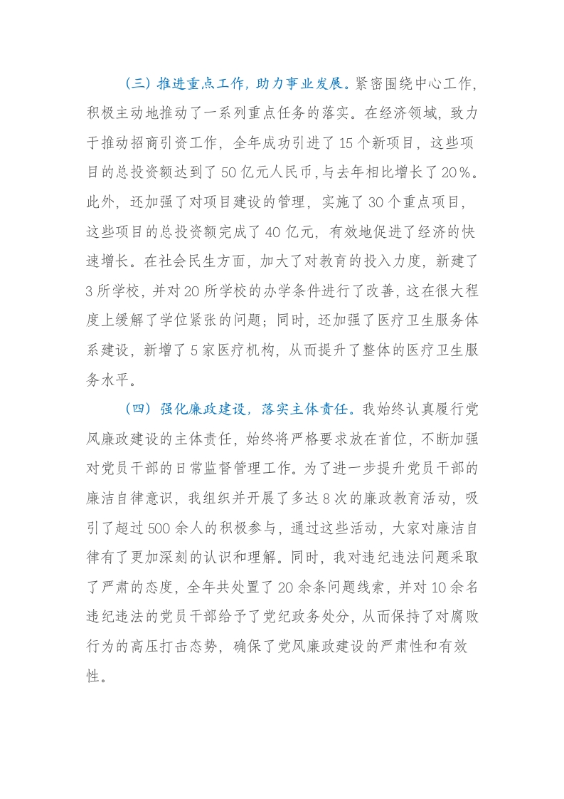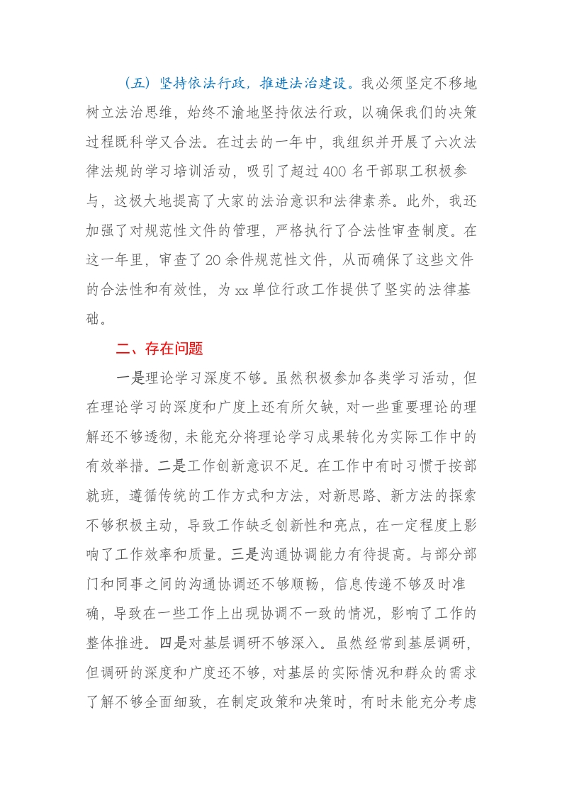 普通领导干部2024年个人年终总结2024年,在组织的信任与培养下,我肩负着领导职责,在工作中砥砺前行,努力做到守土有责、守土负责、守土尽责。现将本人2024年的工作情况总结如下。一、工作完成情况(一)加强理论学习,提升政治素养。始终将理论学习作为首要任务,深入学习贯彻习近平新时代中国特色社会主义思想,认真领悟党的方针政策。积极参加各类集中学习活动,全年累计参加集中学习40余次,撰写心得体会10余篇,切实增强”四个意识”、坚定“四个自信”、做到“两个维护”。通过不断的学习和实践,深刻认识到,只有不断加强理论武装,才能更好地指导实践、推动工作。通过学习,不断提高政治判断力、政治领悟力、政治执行力,确保在思想上政治上行动上同党中央保持高度一致。(二)履行党建责任,加强组织建设。严格遵循并落实了党建工作责任制,认真贯彻新时代党的建设总要求,确保了党的领导贯穿于工作的每一个环节。在全年的工作中,主持召开了12次党组会议,深入研究并讨论了20余项与党建工作密切相关的重要事项。同时,还加强了对党员干部的教育和管理,组织并开展了10余次各类培训活动,培训了300余人次的党员干部,从而有效地提升了党员干部的政治素质和业务能力。