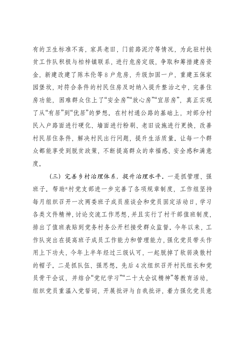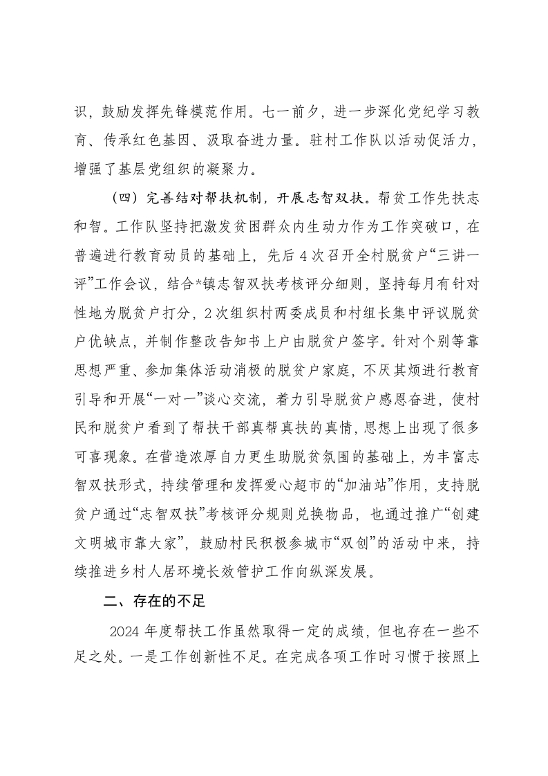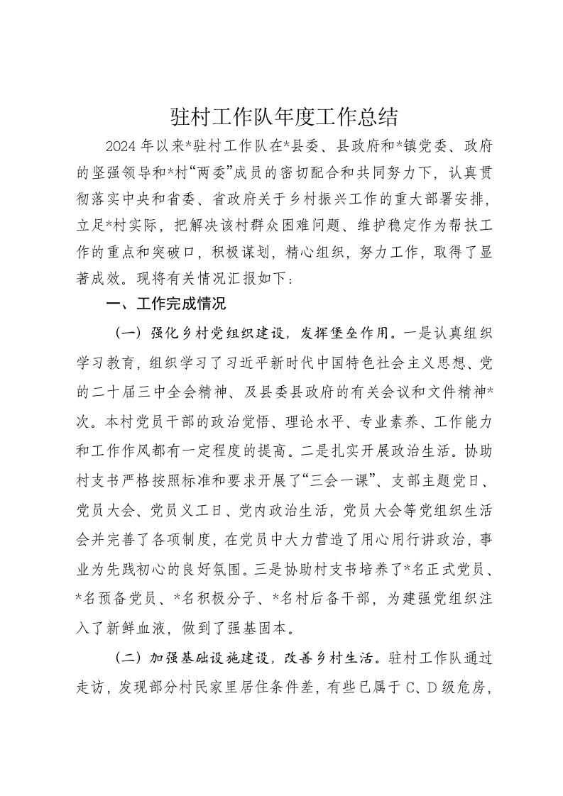 驻村工作队年度工作总结2024年以来*驻村工作队在*县委、县政府和*镇党委、政府的坚强领导和*村“两委”成员的密切配合和共同努力下,认真贯彻落实中央和省委、省政府关于乡村振兴工作的重大部署安排,立足*村实际,把解决该村群众困难问题、维护稳定作为帮扶工作的重点和突破口,积极谋划,精心组织,努力工作,取得了显著成效。现将有关情况汇报如下:一、工作完成情况(一)强化乡村党组织建设,发挥堡垒作用。一是认真组织学习教育,组织学习了习近平新时代中国特色社会主义思想、党的二十届三中全会精神、及县委县政府的有关会议和文件精神*次。本村党员干部的政治觉悟、理论水平、专业素养、工作能力和工作作风都有一定程度的提高。二是扎实开展政治生活。协助村支书严格按照标准和要求开展了“三会一课”、支部主题党日、党员大会、党员义工日、党内政治生活,党员大会等党组织生活会并完善了各项制度,在党员中大力营造了用心用行讲政治,事业为先践初心的良好氛围。三是协助村支书培养了*名正式党员、*名预备党员、*名积极分子、*名村后备干部,为建强党组织注入了新鲜血液,做到了强基固本。(二)加强基础设施建设,改善乡村生活。驻村工作队通过走访,发现部分村民家里居住条件差,有些已属于C、D级危房,