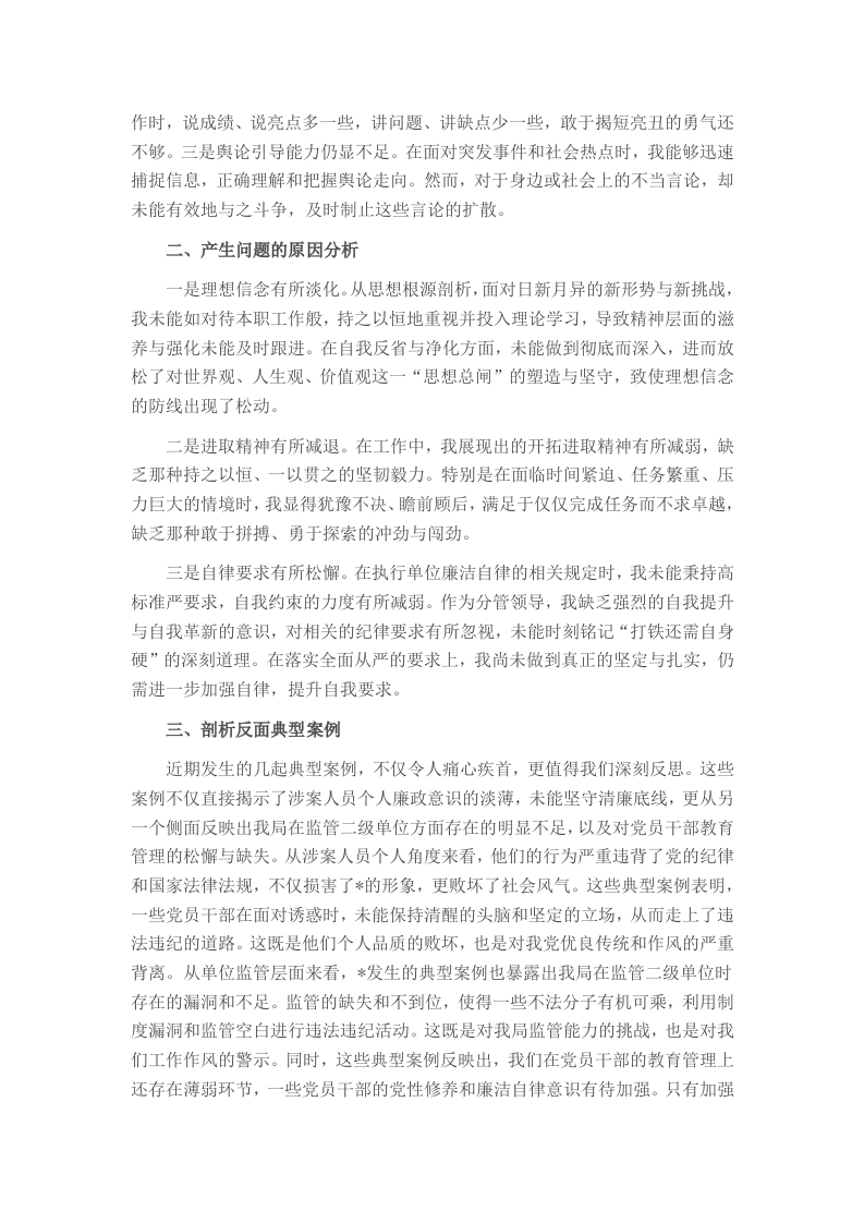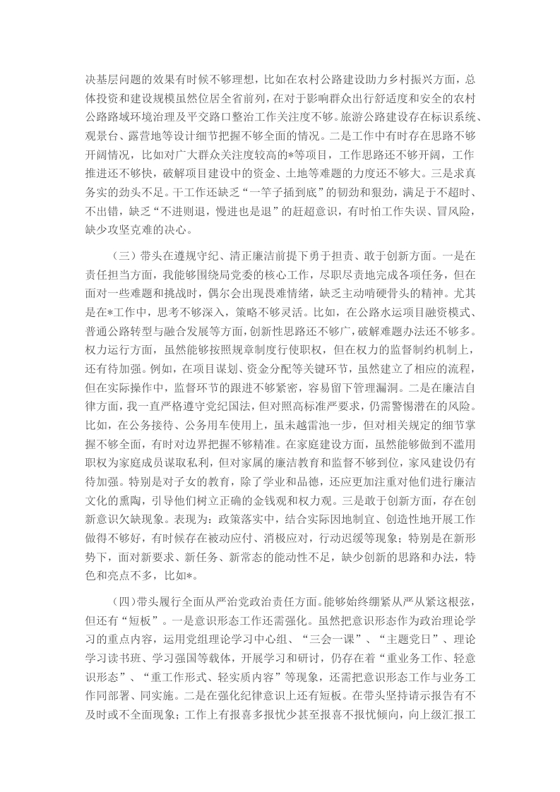 根据《2024年度*交通局党组党员领导干部民主生活会会议方案》要求,我围绕民主生活会主题,深入学习贯彻了习近平新时代中国特色社会主义思想和二十届三中全会精神,紧密联系本人思想和工作实际,深入查摆问题,深刻剖析根源,并制定了整改措施。现将对照检查情况汇报如下。一、存在的主要问题(一)带头严守政治纪律和政治规矩,维护党的团结统一方面。能够认真学习习近平新时代中国特色社会主义思想和十九大精神,特别是学习了《习近平治国理政》、《习近平新时代中国特色社会主义思想三十讲》、习近平总书记视察各地的重要讲话,学习了《党章》和《中国共产党纪律处分条例》等党内法规。坚决维护以习近平同志为核心的党中央权威和集中统一领导,自觉在思想上政治上行动上同党中央保持高度一致,坚决落实省委巡视、市委巡查反馈问题整改,但仍存在一些问题,具体表现为:一是对党的政策理论学习的深度和广度不够,政策理论水平不够高。主要表现是对习近平新时代中国特色社会主义思想学习不透彻,掌握不具体,研究不到位,对新理论学习掌握不全面:树牢“四个意识”,坚定“四个自信”,做到“两个维护”的创新实践措施不足。对习近平总书记视察各地的指导讲话没有及时跟进学习,重视程度、思考程度和借鉴程度不够。注重表面学习,没有把总书记的重要指示和本地区本行业和本职工作密切结合,没有更好地做到学以致用,没有更好地融会贯通指导本职工作。二是政治敏锐性不高,学习思考和洞察力有待加强。对当前世界形势的发展变化了解不足,对国家方针政策的领会思考不全面,思想上的重视程度显得被动和滞后。不善于从政治的角度来观察、分析问题,对事物的理解不深刻、不全面。工作中对自己熟悉的交通行业规划管理重视程度较高,对交通运输领域新信息、新科技、新技术推进等工作重视程度有待进一步提高。三是狠抓落实的力度不够。目前,我局对市委巡察整改问题已找出解决问题的有效途径,尚未完全整改到位。抓工作存在着重布置、轻落实的问题,有时感到上面有主要领导把关,下面有科室人员执行,自己只需要做好上传下达,亲力亲为有所减少,自我加压不够,无形中降低了工作标准。(二)带头增强党性、严守纪律、砥砺作风方面。工作以来,我始终坚持用党性原则修身律己,时刻以《条例》等党规党纪为标尺从严从实检身,严格落实中央八项规定及其实施细则精神,自觉践行社会主义核心价值观,但仍存在一些问题,主要为:一是党性有所弱化,群众观念和宗旨意识有所淡化。主要表现为:用党员领导干部的尺度严格要求自己尚待加强,与党的先进性要求尚有差距,深入基层、深入群众只愿意调查自己想知道的内容,难以做到全面、细致,导致解