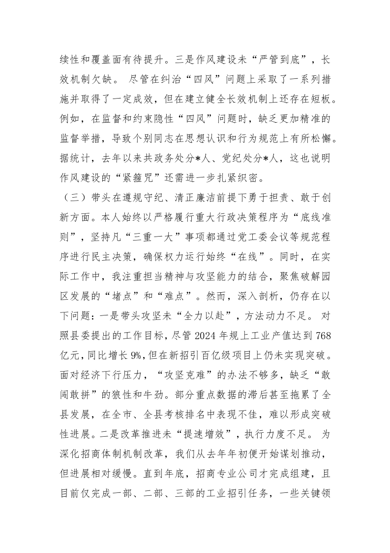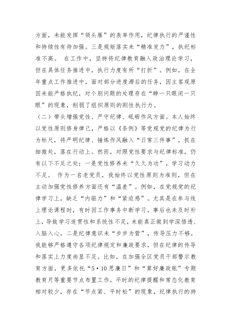 根据市委《关于召开2024年度民主生活会的通知》有关要求和局党组相关工作部署,我严格对照民主生活会主题,全面贯彻党的二十大及二十届三中全会精神,扎实开展学习、剖析和整改工作。在深入研读党章党规党的纪律等重要内容后,通过开展谈心谈话和广泛征求意见建议,结合工作实际,聚焦“四个带头”,全面查摆自身短板和不足,深挖问题根源,努力为整改提升奠定坚实基础。现将个人对照检查情况汇报如下。一、存在的主要问题(一)带头严守政治纪律和政治规矩,维护党的团结统一方面。本人始终将严守政治纪律和政治规矩视为工作的“定盘星”,自觉把党性修养作为“日日精进”的长期课题,不断深化对“两个确立”决定性意义的领悟,坚定践行“两个维护”。然而,检视自身,仍然存在以下问题:一是理论学习未“深耕细作”,学用结合不足。日常虽积极参与理论学习中心组的集中学习和专题研讨,但在“融会贯通”上下功夫不足,存在“学而不深”的问题。例如,在系统性学习和联系实际拓展方面,更多停留在表层理解,未能深度剖析,导致理论与实践“脱钩”,学习的针对性和实效性有待提升。二是纪律执行未“严丝合缝”,表率作用不够。在日常工作中,始终保持对纪律规矩的敬畏之心,但在具体落实上仍存在“时紧时松”的问题。例如,有时因事务繁忙未能及时参加支部生活,特别是在以普通党员身份参与组织生活会议