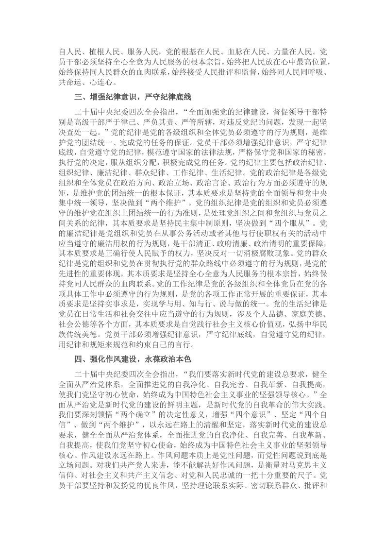 同志们:习近平总书记在二十届中央纪委四次全会中强调,坚持以严的基调强化正风肃纪,锲而不舍落实中央八项规定精神,持续深化纠治“四风”,重点纠治形式主义、官僚主义,坚决破除特权思想和特权行为。党的十八大以来,以习近平同志为核心的党中央把中央八项规定作为加强作风建设的切入点、全面从严治党的突破口,踏石留印、抓铁有痕,刹住了一些长期没有刹住的歪风,纠治了一些多年未除的顽瘴痼疾,党风政风和社会风气为之一新。党的二十大对锲而不舍落实中央八项规定精神作出新部署,二十届中央政治局第一次会议审议《中共中央政治局贯彻落实中央八项规定实施细则》,习近平总书记就加强作风建设发表一系列重要论述,彰显了以习近平同志为核心的党中央持之以恒正风肃纪的坚定决心,为新时代新征程加强作风建设提供了根本遵循。根据机关党委统一安排,今天由我给大家讲一堂党课。结合当前工作实际,我围绕“强化作风建设,永葆政治本色”这一主题,与大家一起学习交流。一、坚定理想信念,强化党性修养二十届中央纪委四次全会指出,“全面加强党的纪律建设,督促领导干部特别是高级干部严于律己、严负其责、严管所辖,对违反党纪的问题,发现一起坚决查处一起。坚持党性党风党纪一起抓,从思想上固本培元,提高党性觉悟,增强拒腐防变能力,涵养富贵不能淫、贫贱不能移、威武不能屈的浩然正气。”当前,我们党团结带领人民踏上了全面建设社会主义现代化国家、全面推进中华民族伟大复兴的新征程,正处于实现第二个百年奋斗目标的关键时期。我们必须清醒认识到,全面从严治党永远在路上,党的自我革命永远在路上,必须持之以恒推进全面从严治党,以党的自我革命引领社会革命。二十届中央纪委四次全会指出,“用党的创新理论武装全党是党的思想建设的根本任务。”思想建设是党的基础性建设,坚定理想信念是党的思想建设的首要任务。对马克思主义的信仰,对社会主义和共产主义的信念,是共产党人的政治灵魂,是共产党人经受住任何考验的精神支柱。理想信念就是共产党人精神上的“钙”,没有理想信念,理想信念不坚定,精神上就会“缺钙”,就会得“软骨病”。党员干部必须坚定理想信念,强化党性修养,牢记党的宗旨,牢固树立正确的世界观、权力观、事业观,加强党性锻炼,不断提高党性修养,始终保持共产党人的政治本色。二、牢记初心使命,强化宗旨意识二十届中央纪委四次全会指出,“全党同志务必不忘初心、牢记使命,务必谦虚谨慎、艰苦奋斗,务必敢于斗争、善于斗争,坚定历史自信,增强历史主动,谱写习近平新时代中国特色社会主义思想更加绚丽的华章。”为中国人民谋幸福、为中华民族谋复兴,是中国共产党人的初心和使命。中国共产党自成立之日起,就把为中国人民谋幸福、为中华民族谋复兴作为自己的初心使命,始终坚持共产主义理想和社会主义信念,团结带领全国各族人民为争取民族独立、人民解放和实现国家富强、人民幸福而不懈奋斗。党员干部必须牢记初心使命,强化宗旨意识,坚持以人民为中心的发展思想,把人民对美好生活的向往作为奋斗目标,全心全意为人民服务。全心全意为人民服务是我们党的根本宗旨,是我们党区别于其他政党的显著标志。二十届中央纪委四次全会指出,“我们要站稳人民立场、把握人民愿望、尊重人民创造、集中人民智慧,形成人民所喜爱、所认同、所拥有的理论,使之成为指导人民认识世界和改造世界的强大思想武器。”我们党来