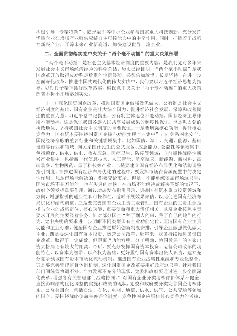 同志们:按照局党组工作安排,下面,我围绕“坚持两个毫不动摇,汇聚经济社会高质量发展强大合力”这一主题,为大家讲一堂专题党课,与大家共同学习提高。公有制经济和非公有制经济都是社会主义市场经济的重要组成部分,都是我国经济社会发展的重要基础。党的十八大以来,习近平总书记高度重视各种所有制经济发展,发表了一系列重要论述,多次强调要坚持毫不动摇巩固和发展公有制经济,毫不动摇鼓励、支持、引导非公有制经济发展,为促进各种所有制经济发展提供了根本遵循。以中国式现代化全面推进强国建设、民族复兴伟业的新征程上,我们必须以习近平经济思想为指引,深入领会“两个毫不动摇”的理论逻辑、历史逻辑和实践逻辑,全面贯彻落实党中央的决策部署,扎实推动我国经济高质量发展。一、深刻理解坚持“两个毫不动摇”的重要意义实践证明,公有制经济、非公有制经济相辅相成、相得益彰。把公有制经济巩固好、发展好,同鼓励、支持、引导非公有制经济发展不是对立的,而是有机统一的。“两个毫不动摇”有机统一于中国式现代化建设全局,贯穿于构建高水平社会主义市场经济体制。任何所谓“国退民进”“国进民退”都是错误命题,任何动摇公有制经济主体地位的言行、影响非公有制经济健康发展的言行,都要坚决反对。坚持“两个毫不动摇”、不断完善落实“两个毫不动摇”的体制机制,具有重要意义。(一)坚持“两个毫不动摇”有利于完善社会主义市场经济体制。社会主义市场经济体制是高质量发展的重要保障。坚持“两个毫不动摇”,加快建设高效规范、公平竞争、充分开放的全国统一大市场,是构建高水平社会主义市场经济体制的题中应有之义。要着力破除各种形式的市场壁垒和地方保护,畅通生产、分配、流通、消费各环节,提高市场运行效率。让市场需求引导创新要素资源有序流动和优化配置,完善自主创新成果市场化应用体制机制,支撑科技创新和新兴产业发展。通过国内大循环和统一大市场有效利用全球要素和市场资源,集聚资源、推动增长、激励创新、优化分工、促进竞争,形成国企敢干、民企敢闯、外企敢投的制度环境。(二)坚持“两个毫不动摇”有利于培育高质量经营主体。国有企业是中国特色社会主义的重要物质基础和政治基础。毫不动摇巩固和发展公有制经济,聚焦战略安全、产业引领、国计民生等功能,继续推进国企改革深化提升行动,有利于做强做优做大国有资本和国有企业,增强国有企业核心功能和核心竞争力,充分发挥国有经济战略支撑作用。民营经济是推进中国式现代化的生力军,是高质量发展的重要基础。毫不动摇鼓励、支持、引导非公有制经济发展,打造公平竞争环境,贯彻平等保护原则,精准制定实施各类支持政策,及时回应其关切和利益诉求,有利于为民营经济发展营造良好预期,促进民营经济发展壮大。(三)坚持“两个毫不动摇”有利于塑造产业链竞争优势。国有企业和民营企业发挥各自优势,深化合作、取长补短,推动创新链产业链资金链人才链深度融合,有利于不断提升产业链水平,加快科技成果向现实生产力转化,打通从科技强到企业强、产业强、经济强的通道。要加强自主创新,着力突破关键核心技术“卡脖子”问题,打造现代产业链“链长”,带动产业链上下游企业协同发展。
