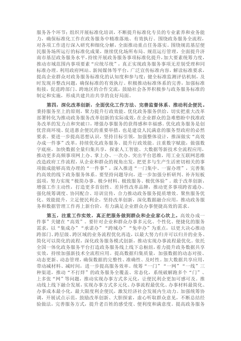 同志们:今天,我们组织召开2025年政务服务工作专题会,主题是深入学习贯彻党的二十届三中全会精神和习近平总书记重要讲话精神,坚持以人民为中心推进改革,以优质政务服务赋能高质量发展。刚才,部分窗口单位汇报了各领域工作开展情况,大家担负的职责使命事关发展、稳定、民生和营商环境,必须提高站位,把工作抓实抓细。要始终坚持以人民为中心的发展思想,明确改革任务、用好改革举措,不断提升企业和群众办事的体验感、满意度。下面,结合抓好政务服务工作,我强调几点意见:第一,敢于创优争先,以实绩实效立标杆、做示范。坚持以“高效办成件事”改革为目标,以提升政务服务效能为重点,在政务服务标准化、规范化、便利化上下功夫,全力打造“审批最少、流程最优、效率最高、服务最好”的政务服务环境,不断夯实高质量发展基础。要创新服务方式,拓展服务渠道,推动信息共享、材料精减、环节简化、时限压缩,让企业和群众办事更便利、体验更舒心。以“群众工作无小事”的态度,努力提升政策水平、服务意识和沟通能力,注重时效、跟踪问效,让政务服务便民热线接得更快、分得更准、办得更实。统筹力量、整合资源、优化机制、形成合力,加快把项目建设好、运行好、应用好、展示好,进一步提升城市治理体系和治理能力现代化水平。持续深化“放管服”改革,以便捷、高效、共享、优质为方向,系统性重塑行政审批制度,整体性优化政务服务环境,把政务服务中心打造成为深化改革的重要阵地、便民利企的服务窗口、营商环境的展示平台。坚持效果导向,强化数字赋能,精简流程、提高效能,全力推动企业和群众办事线上“一网通办”,线下“只进一扇门”,现场办理“最多跑一次”。注重在应用、有效上做文章,加强数据安全管理,建好共享协同平台、深化丰富应用场景,全面推动城市经济、生活、治理数字化转型。第二,坚持问题导向,加快补齐工作中存在的短板弱项。政务服务中心是服务群众、展现政府形象的窗口。要深入贯彻落实习近平总书记关于加强网络强国和数字中国建设重要论述,以更大的决心、更实的举措,着力补齐短板、夯实工作基础、规范工作机制、提升服务效能,全面推动政务服务高质量发展。从提升政务服务效能出发,认真梳理当前“高效办成一件事”工作存在的短板不足,逐项制定推进措施,逐步整改提升,确保各项任务高效推进。持续加强学习,贯彻落实党的二十届三中全会精神,习近平总书记最新讲话精神,不断提高政治素养和理论水平,争取成为服务群众企业的行家能手。持续加强管理,完善管理机制,用制度管人管事,要敢说敢管,持续做好窗口人员的考勤等日常管理工作,对窗口干部的言行举止、衣着、环境卫生、服务水平等方面要做到高标准、严要求。持续优化服务,压紧压实主体责任,持续抓实事项进驻,提升政务服务队伍能力,进一步优化营商环境,为推动“高效办成一件事”等工作落地落实提供有力支撑。强化统筹监督,以企业群众反馈问题为导向,以办事企业群众满意度为目标,加快政务信息数据整合共享,努力打造夏河政务服务品牌,推动政务服务高质量发展。第三,完普制度机制,提升政务服务标准化、规范化、便利化水平。按照标准先行、高频优先、分批推进的实施步骤,稳步推动政务服务标准化建设,实现同一事项跨地区、跨层级互联互通、数据共享、业务协同。选拔政治素质高、业务能力强的干部,组建标准化专员队伍,确保标准化理念和方法能够深入政