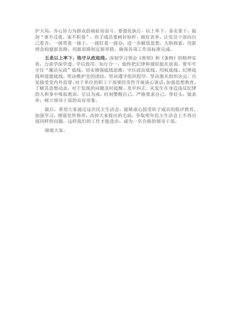 同志们:大家好!今天,我非常高兴能参加你们2024年度班子民主生活会,刚才听了大家的发言,特别是书记,主任,副主任的发言,对经济发展等工作有了进一步了解,也受到不少启发。总的感觉:这次民主生活会有以下几个特点:一是准备充分、主题鲜明。二是追根溯源剖析深刻。三是相互批评态度诚恳。四是查摆到位,整改明确。五是氛围和谐,民主活跃。在开展批评和自我批评上班子成员态度端正,敢于揭短亮丑,即触及了灵魂,又增进了团结,体现了领导带头、坚持了问题导向、贯彻了会议精神,起到了提高认识、帮助同志、改进作风的作用。可以说,生活会开的很成功,质量也很高。最后,结合这次民主生活会的主要内容,就今后一个时期的班子建设和有关工作,我再讲五点意见,与大家共勉。一是加强学习,做到政治合格。要把学习宣传贯彻党的二十大和二十届三中全会精神作为当前和今后一个时期的首要政治任务,以学习好、宣传好、贯彻好习近平新时代中国特色社会主义思想为主线,在学懂、弄通、做实上下功夫,真正把个人理想和党的奋斗目标一致起来。要牢固树立政治意识、大局意识、核心意识、看齐意识,坚定“四个自信”,坚决维护以习近平同志为核心的党中央权威和集中统一领导,切实用习近平新时代中国特色社会主义思想武装头脑、指导实践、推动工作。要坚定理想信念,维护党的权威,在思想上、政治上、行动上同以习近平同志为核心的党中央保持高度一致。把拥戴、维护、捍卫核心作为首要政治纪律,主动向党中央看齐,向习近平总书记看齐,向党的理论和路线方针政策看齐,向党中央决策部署看齐,以实际行动忠诚核心、维护核心、捍卫核心。二是聚焦问题,深化整改落实。要对班子查摆出的问题,分类梳理,建立台账,明确整改目标、整改措施、整改时效、责任领导,做到问题不解决坚决不松手、整改不到位坚决不收兵,努力实现作风建设制度化、常态化。对担当责任回避矛盾,尽职尽责、积极作为方面存在的问题要履行好主体责任,敢于坚持原则,不断完成内部监督管理体系,对于违反工作纪律的人员要发现一起、查处一起,绝不姑息纵容,确保一碗水端平。对个人存在的问题,尤其是作风建设方面的问题,要深刻反思,着眼长远,常抓不懈,必须严字当头、寸步不让,强化责任意识、转变思想观念、完善制度机制、提升执行能力,确保把权力关进制度的笼子里。三是落实责任,从严管党治党。要严格执行集体领导下的个人分工负责制,明确班子成员承担的职责,做到各负其责、各尽其责。充分发扬民主,集中集体智慧,坚持重大问题集体讨论、集体决定,增强决策的科学性和执行力。要用好批评和自我批评的武器,增强班子的凝聚力和向心力,维护班子团结和工作大局,加强相互间的沟通、支持和配合,形成团结共事的整体合力,营造想大局、谋大事的良好工作氛围。要认真履行主体责任,党支部书记作为第一责任人,要发挥好关键带头作用,各位班子成员要认真落实“一岗双责”,对分管领域党风廉政建设加强督促指导,做到常提醒、常谈话。四是攻坚克难,增强责任担当。习近平总书记说:“看一个领导干部,很重要的是看有没有责任感,有没有担当精神”。当前,我省正处于转型发展的关键时期,经济工作尤为重要,所以你们要勇于担起责任,对照全年各项目标任务,以时不我待的精神,全力以赴抓好落实。要维护大局,自觉从大局看问题,把工作放到大局中去思考、定位、摆布,做到正确认识大局、自觉服从大局、坚决维