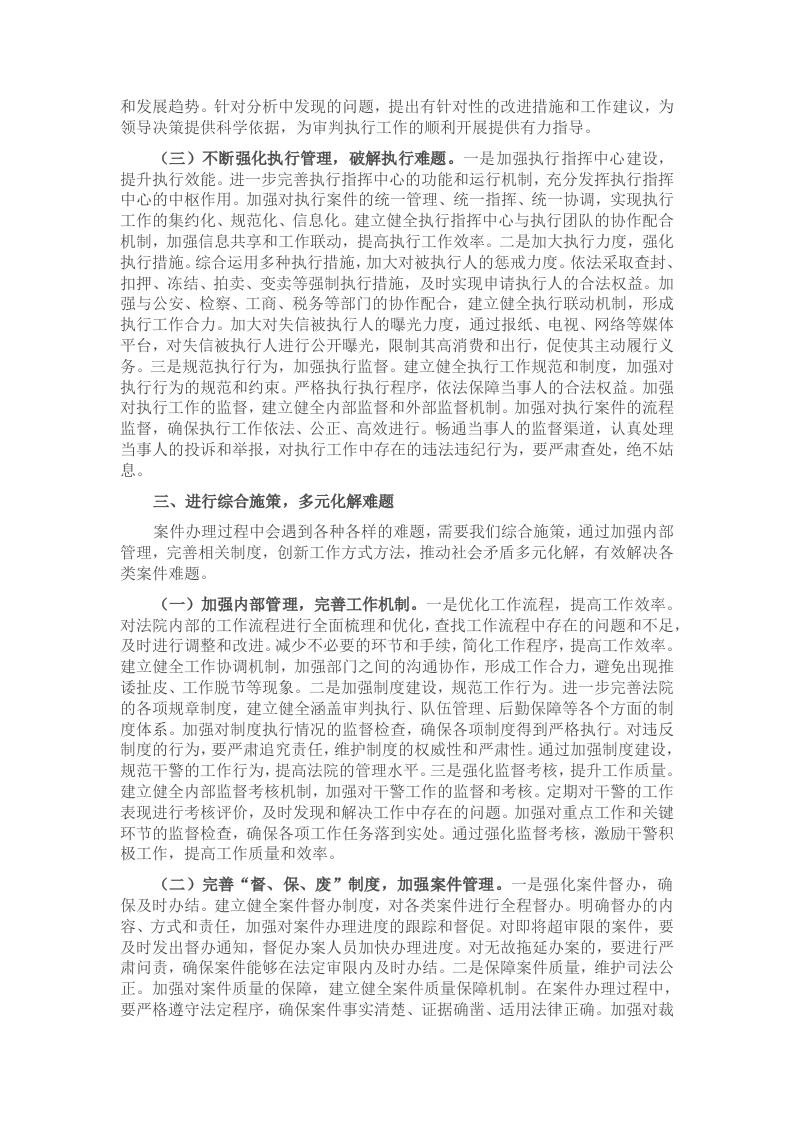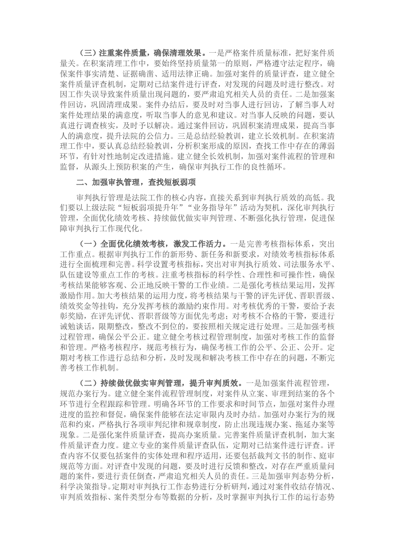 同志们:过去的一年,XX自贸区法院在中院党组的坚强领导下,在分党组的正确带领下,全体干警以大局为重、以工作为先,辛勤付出,实工作,各项工作稳中有进,圆满完成了全年目标任务。这是大家共同努力的成果,在此,我代表院党组,向全体干警表示衷心的感谢和崇高的敬意!在肯定成绩的同时,我们也要清醒地认识到,当前的审判执行工作仍面临着诸多挑战和问题。新的一年已经拉开帷幕,第一季度是全年工作的起步阶段,也是关键时期。我们要抢拼一季度,实现开门红,为全年工作开好局、起好步。借此机会,我讲几点意见。一、坚定信心决心,全力清理积案积案清理工作是提升审判执行质效的重要一环,关乎法院的公信力和当事人的合法权益。我们要以多办案、快办案、办好案为要求,坚决贯彻落实上级法院决策部署,利用第一季度集中精力抓好积案及长期未结案件清理工作,为全年工作打下坚实基础。(一)强化责任担当,明确清理目标。一是压实领导责任,发挥带头作用。各部门负责人要切实履行第一责任人职责,对本部门的积案清理工作负总责。要亲自研究部署,亲自协调解决问题,亲自督促落实。院领导班子成员要以身作则,带头办理重大、疑难、复杂积案,发挥好示范引领作用。定期召开积案清理工作推进会,听取各部门工作进展情况汇报,及时掌握工作动态,协调解决工作中遇到的困难和问题。二是细化任务分解,落实个人责任。将积案清理任务细化分解到每个办案团队、每位办案人员,明确清理目标和时间节点。建立积案清理台账,对每一件积案的基本情况、办理进度、责任人等信息进行详细登记,实行动态管理。办案人员要制定个性化的积案清理计划,明确具体的工作措施和步骤,确保积案清理工作有序推进。三是加强考核监督,严肃责任追究。将积案清理工作纳入绩效考核体系,加大考核权重,对工作成效显著的部门和个人进行表彰奖励,对工作不力、未完成任务的进行通报批评,并按照相关规定追究责任。加强对积案清理工作的日常监督检查,定期通报工作进展情况,对存在的问题及时督促整改,确保积案清理工作取得实效。(二)创新工作方法,提高清理效率。一是优化资源配置,加强团队协作。合理调配审判资源,根据案件类型和难易程度,科学组建办案团队,实现人员优势互补。加强团队内部协作,充分发挥团队成员的专业特长,形成工作合力。建立案件流转机制,对重大、疑难、复杂案件,及时组织团队成员进行研讨,共同研究解决方案,提高办案效率。二是运用信息化手段,提升办案效能。充分利用智慧法院建设成果,借助电子卷宗、在线庭审、智能辅助办案等信息化平台,提高办案效率。通过电子卷宗随案同步生成和深度应用,实现案件材料的快速查阅和共享,减少人工翻阅卷宗的时间。利用在线庭审系统,打破时间和空间限制,方便当事人参与诉讼,提高庭审效率。借助智能辅助办案系统,实现法律文书自动生成、类案推送等功能,减轻法官工作负担,提高办案质量。三是加强沟通协调,形成工作合力。加强与上级法院、兄弟法院以及其他相关部门的沟通协调,建立健全工作联动机制。对于涉及多个部门的案件,要加强协作配合,共同研究解决问题。积极争取党委、政府和社会各界的支持,为积案清理工作创造良好的外部环境。加强与当事人的沟通交流,做好当事人的思想工作,争取当事人的理解和配合,促进案件的顺利解决。