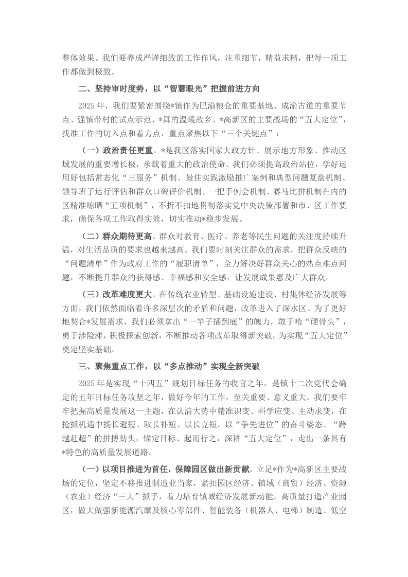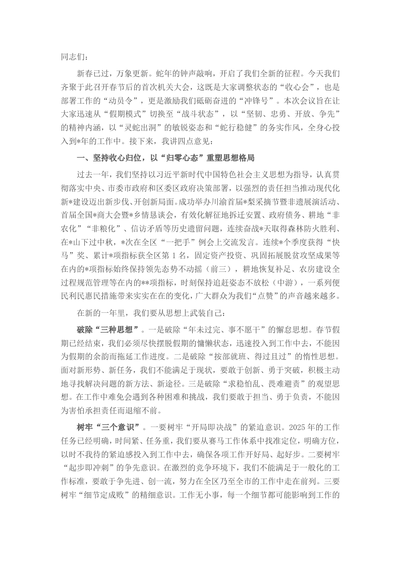同志们:新春已过,万象更新。蛇年的钟声敲响,开启了我们全新的征程。今天我们齐聚于此召开春节后的首次机关大会,这既是大家调整状态的“收心会”,也是部署工作的“动员令”,更是激励我们砥砺奋进的“冲锋号”。本次会议旨在让大家迅速从“假期模式”切换至“战斗状态”,以“坚韧、忠勇、开放、争先”的精神内涵,以“灵蛇出洞”的敏锐姿态和“蛇行稳健”的务实作风,全身心投入到*年的工作中。接下来,我讲四点意见:一、坚持收心归位,以“归零心态”重塑思想格局过去一年,我们坚持以习近平新时代中国特色社会主义思想为指导,认真贯彻落实中央、市委市政府和区委区政府决策部署,以强烈的责任担当推动现代化新*建设迈出新步伐、开创新局面。成功举办川渝首届*梨采摘节暨非遗展演活动、首届全国*商大会暨*乡情恳谈会,有效化解征地拆迁安置、政府债务、耕地“非农化”“非粮化”、信访矛盾等历史遗留问题,连续奋战*天取得森林防火胜利、在*山下过中秋,*次在全区“一把手”例会上交流发言。连续*个季度获得“快马”奖、累计*项指标获全区第1名,固定资产投资、巩固拓展脱贫攻坚成果等在内的*项指标始终保持领先态势不动摇(前三),耕地恢复补足、农房建设全过程规范管理等在内的*项指标,时刻保持追赶姿态不放松(中游),一系列便民利民惠民措施带来实实在在的变化,广大群众为我们“点赞”的声音越来越多。在新的一年里,我们要从思想上武装自己:破除“三种思想”。一是破除“年未过完、事不愿干”的懈怠思想。春节假期已经结束,我们必须尽快摆脱假期的慵懒状态,迅速投入到工作中去,不能因为假期的余韵而拖延工作进度。二是破除“按部就班、得过且过”的惰性思想。面对新形势、新任务,我们不能满足于现状,要敢于创新、勇于突破,积极主动地寻找解决问题的新方法、新途径。三是破除“求稳怕乱、畏难避责”的观望思想。在工作中难免会遇到各种困难和挑战,我们要敢于担当、勇于负责,不能因为害怕承担责任而退缩不前。树牢“三个意识”。一要树牢“开局即决战”的紧迫意识。2025年的工作任务已经明确,时间紧、任务重,我们要从赛马工作体系中找准定位,明确方位,以时不我待的紧迫感投入到工作中去,确保各项工作开好局、起好步。二要树牢“起步即冲刺”的争先意识。在激烈的竞争环境下,我们不能满足于一般化的工作标准,要敢于争先进、创一流,努力在全区乃至全市的工作中走在前列。三要树牢“细节定成败”的精细意识。工作无小事,每一个细节都可能影响到工作的