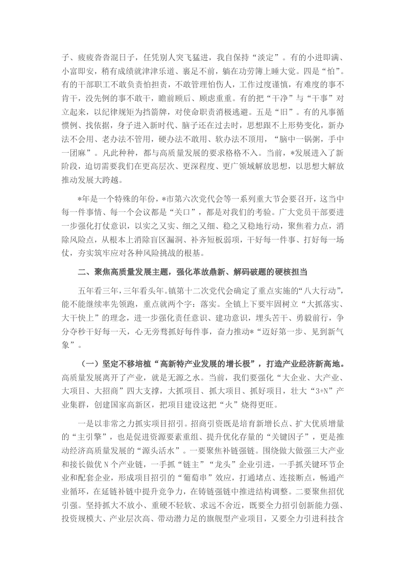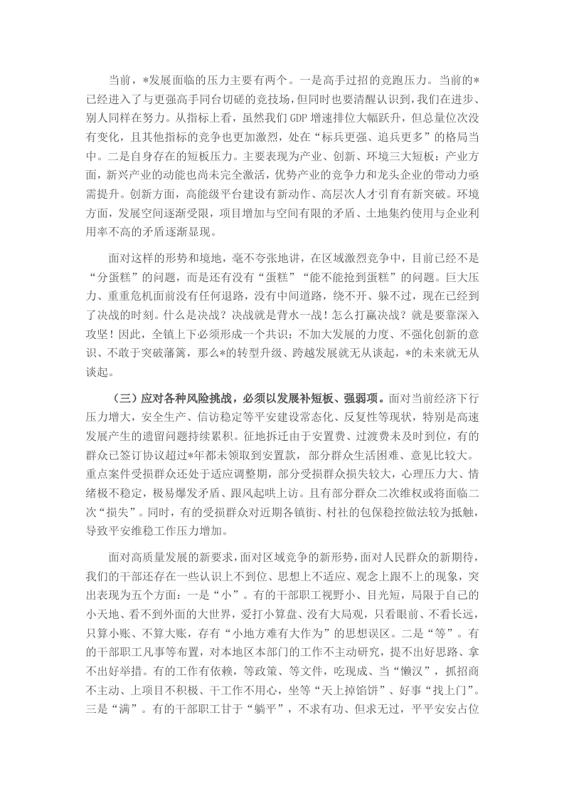 同志们:今天我们召开*年度党务政务工作会,主要任务是以习近平新时代中国特色社会主义思想为指导,贯彻落实市区“两会”精神,按照镇年初人代会确定的“*”思路,动员全镇广大党员干部,弘扬奋斗精神、崇尚真抓实干,吹响冲锋号、点燃壮志心,为加快建设“*制造科创新城”注入强劲动力。刚才,各位分管领导对全镇*年各项工作作了系统全面的部署,讲得都很到位,信心很足、措施很实,体现了主动担当、务实推进的态度,我完全赞同。下面,我再强调三点意见:一、认清抢抓新机遇形势,明确加速崛起、进位赶超的发展方向习近平总书记强调:“要坚持用全面、辩证、长远的眼光分析当前经济形势,努力在危机中育新机、于变局中开新局。”今天会议就是要理清*发展面临的形势任务和风险挑战,抓紧补短板、堵漏洞、强弱项,切实把对上负责与对下负责统一起来,让广大党员干部增强机遇意识和忧患意识,让全镇在百舸争流、千帆竞发的激烈竞争中占得先机、赢得主动。(一)贯彻上级决策部署,必须坚定不移把发展进行到底。*年是实现“十四五”规划目标任务的收官之年,是镇十二次党代会确定的五年目标任务攻坚之年,做好今年工作意义重大。中央经济工作会议确定稳字当头、稳中求进的总基调,市委提出稳进增效、改革创新、除险固安、强企富民工作导向,区委为现代化新*建设目标任务作出的系统部署,将带来一系列发展机遇和政策利好。我们要牢牢把握高质量发展这一主题,锚定“135”工作思路持续发力,在认清大势中精准识变、科学应变、主动求变,在抢抓机遇中扬长避短、取长补短、以长克短,以“基础巩固提升年”为抓手,以抓好“强镇带村”试点为契机,以“争先进位”的奋斗姿态、“跨越赶超”的拼搏劲头,锚定目标、起而行之,走出一条具有*特色的高质量发展道路。(二)实现*加速崛起,必须靠闯关夺隘、破局开路。随着*高新区的建设推进,*的发展进入了转型期,实现了重塑辉煌的快速起步。但是,*现在面临的问题是解决好如何跨越发展。转型发展是主线、是载体,而跨越发展才是实质、是目标。谁能及时转型、成功转型,谁就能掌握发展的主动权,否则将被淘汰。改革开放*年来,中国从一个人口大国和经济欠发达国家一跃成为经济总量位居世界前列,这就是我国经济社会成功转型、跨越发展的具体实践。因此,跨越发展、更好更快地发展,才是可持续发展的战略之举,才是转型发展的根本出路。所以跨越发展才真正是我们今后工作的实质和奋斗目标。