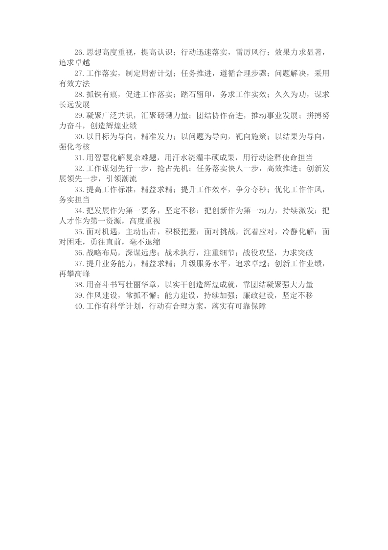 1.锚定目标,矢志不渝:砥砺奋进,步履铿锵:创新突破,勇立潮头2.以拼搏之勇攀登事业高峰,以奋进之姿跨越艰难险阻,以担当之责直面时代挑战3.问题面前,探寻破局思路:困难时刻,寻觅解决良方:挑战之际,谋求关键突破4.以昂扬斗志开启新征程,以务实作风推动工作进程,以创新精神引领发展方向5.任务细化至点,精准聚焦:责任落实到人,明确主体:工作推进到位,确保成效6.高效执行,狠抓工作落实:精细管理,全力提升效能:协同合作,凝聚强大合力7.立足本职岗位,精进业务技能:着眼全局发展,积极谋划布局:服务发展大局,展现担当作为8.面对竞争,毫不退缩:遭遇瓶颈,毫不气馁:迎接变革,毫不畏惧9.以匠心精神雕琢工作品质,使其臻于完美:以进取精神拓展工作边界,实现突破发展:以奉献精神铸就工作辉煌,书写不凡篇章10.强化责任意识,勇挑千斤重担:提升专业能力,破解疑难问题:培育团队精神,凝聚奋进力量11.以敢为人先的锐气开拓全新局面,以锲而不舍的韧劲攻克艰难险阻,以精益求精的态度追求卓越成就12.机遇面前,抢占先机:发展途中,力求突破:合作之时,谋求共赢13.用汗水浇灌收获之花,以实干笃定前行之路,凭创新引领发展之潮14.战略布局,高瞻远瞩:战术执行,精准施策:工作落实,雷厉风行15.困难面前,坚韧不屈:压力之下,昂首挺胸:挫折之后,重振旗鼓16.以优质服务赢得良好口碑,以高效工作树立卓越形象,以卓越业绩展现非凡风采17.目标引领前行方向,行动铸就美好未来,坚持成就辉煌事业18.谋划工作有深度,深度思考:推进工作有力度,强力执行:落实工作有精度,精准到位19.拓宽发展思路,使其更具前瞻性:细化工作举措,确保更具操作性:加强执行力度,保证更具实效性20.激发创新活力,点燃发展引擎:汇聚发展合力,形成强大动力:提升竞争实力,抢占发展高地21.重点工作,精准发力,直击要害:难点问题,持续用力,久久为功:亮点工作,全面发力,大放异彩22.用新理念引领全新发展格局,以新举措推动伟大跨越征程,靠新作为开创崭新工作局面23.学习先进经验,增长自身本领:对标一流标准,查找自身差距:赶超先进水平,争当行业先锋24.常规工作,狠抓规范,确保有序:重点工作,力求突破,实现跨越:特色工作,打造亮点,彰显优势25.强化使命担当,勇挑时代重任:提升履职能力,增强工作本领:严守纪律底线,做到清正廉洁