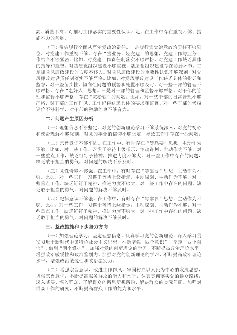 根据市委《关于召开2024年度民主生活会的通知》有关要求,局党组领导班子紧扣本次专题民主生活会主题,聚焦“四个带头”总体要求,坚持问题导向,认真学习研讨,开展谈心谈话,深入查摆和梳理班子自身存在的问题,深刻剖析原因,并提出整改方案,落实整改措施。现对照检查如下:一、存在的突出问题(一)带头严守政治纪律和政治规矩,维护党的团结统一方面。一是政治理论学习不够深入,理论武装不够扎实。学习贯彻党的创新理论还不够系统深入,在一定程度上存在学用脱节的问题。比如,在理论学习中心组学习中,存在学习计划落实不够严格、学习形式单一、研讨交流少等问题。对党的二十届三中全会精神的学习还停留在表面,对全面深化改革的重要论述领会不够深刻,结合部门实际谋划工作思路不够具体。在落实意识形态工作责任制方面,存在重视不够研判不足、措施不力的问题。二是政治敏锐性不够强,政治判断力有待提升。对一些苗头性、倾向性问题的敏感性不够,分析研判不够及时。比如,对涉及本系统本领域的负面舆情关注不够,研判处置不够及时。在落实上级重大决策部署时,对工作中的政治风险预判不足,工作预案不够完善。对一些热点敏感问题处置不当,造成不良影响。三是工作落实质量不高。在执行重点任务时,有时存在“交办式”工作方式,习惯于“安排部署”,但对后续推进的督导和跟踪不够。例如,部分重点任务虽然按时布置,但在执行过程中,缺少细化措施,导致实际落地效果不尽如人意。(二)带头增强党性、严守纪律、砥砺作风方面。一是群众观念有所淡化,服务意识有所弱化。与群众联系不够紧密,对群众的所思所想所盼了解不够深入对群众反映的问题解决不够及时。比如,对一些群众反映强烈的热点难点问题,虽然进行了专题调研,但调研成果转化不够及时。对一些涉及群众切身利益的政策措施宣传不够到位,导致群众对政策措施的知晓率不高。二是工作作风不够扎实,工作效率不够高。在工作中,有时存在“等靠要”思想,主动作为不够。比如,对一些工作,习惯于等待上级指示,主动谋划、主动作为不够。对一些重点工作,缺乏钉钉子精神,推进力度不够大。对一些工作中存在的问题,缺乏敢于担当的勇气,对问题的解决不够及时。三是对群众工作研究不深。对群众反映强烈的一些热点难点问题,对深层次原因、解决问题的办法缺乏深入研究。比如,对一些群众反映的问题,只是简单地进行了解,没有深入分析原因,没有制定具体的解决方案。(三)带头在遵规守纪、清正廉洁前提下勇于担责、敢于创新。一是对强化系统观念的认识不深刻,统筹谋划不够。对强化系统观念的重要性认识不足,在工作中存在重视不够、统筹谋划不到位的问题。比如,在谋划工作时,缺乏全局意识和系统思维,有时存在“就事论事”的现象。对工作的统筹谋划不够,导致工作效率不高、质量不高。二是在工作中存在单打独斗的现象,协同配合不够。对加强协同配合的重要性认识不足,在工作中存在重视不够、协同配合不到位的问题。比如,在落实重点任务时,有时存在“各自为政”的现象,导致工作效率不高、质量不高。对加强协同配合的重要性认识不足,在工作中存在重视不够、协同配合不到位的问题。三是对推动工作落实的重要性认识不足,措施不力。对推动工作落实的重要性认识不足,在工作中存在重视不够、措施不力的问题。比如,在落实重点任务时,有时存在“重部署、轻落实”的现象,导致工作效率不