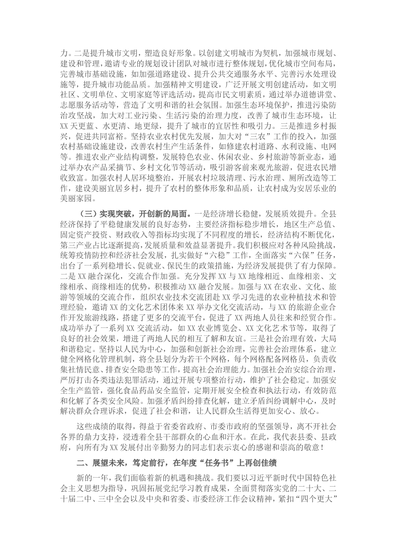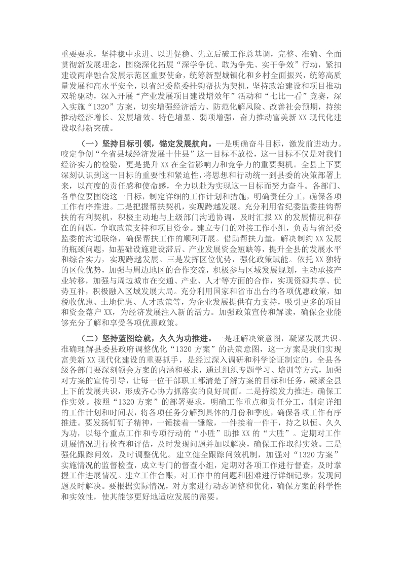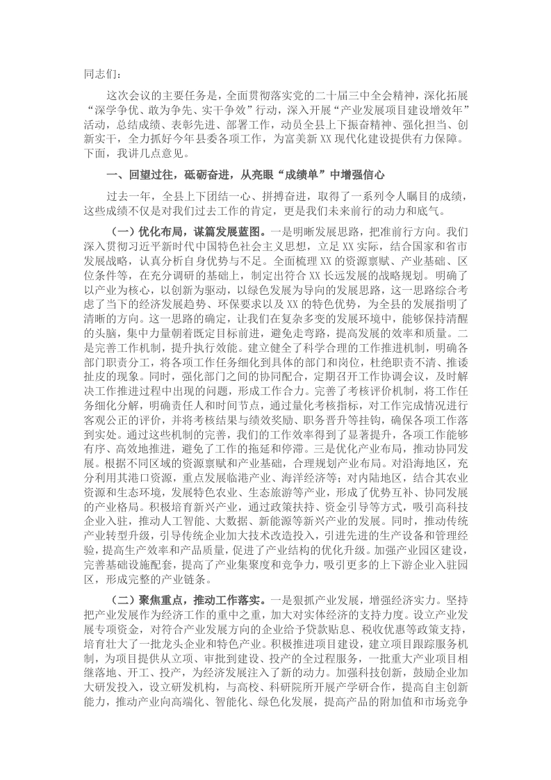 同志们:这次会议的主要任务是,全面贯彻落实党的二十届三中全会精神,深化拓展“深学争优、敢为争先、实干争效”行动,深入开展“产业发展项目建设增效年”活动,总结成绩、表彰先进、部署工作,动员全县上下振奋精神、强化担当、创新实干,全力抓好今年县委各项工作,为富美新XX现代化建设提供有力保障。下面,我讲几点意见。一、回望过往,砥砺奋进,从亮眼“成绩单”中增强信心过去一年,全县上下团结一心、拼搏奋进,取得了一系列令人瞩目的成绩,这些成绩不仅是对我们过去工作的肯定,更是我们未来前行的动力和底气。(一)优化布局,谋篇发展蓝图。一是明晰发展思路,把准前行方向。我们深入贯彻习近平新时代中国特色社会主义思想,立足XX实际,结合国家和省市发展战略,认真分析自身优势与不足。全面梳理XX的资源禀赋、产业基础、区位条件等,在充分调研的基础上,制定出符合XX长远发展的战略规划。明确了以产业为核心,以创新为驱动,以绿色发展为导向的发展思路,这一思路综合考虑了当下的经济发展趋势、环保要求以及XX的特色优势,为全县的发展指明了清晰的方向。这一思路的确定,让我们在复杂多变的发展环境中,能够保持清醒的头脑,集中力量朝着既定目标前进,避免走弯路,提高发展的效率和质量。二是完善工作机制,提升执行效能。建立健全了科学合理的工作推进机制,明确各部门职责分工,将各项工作任务细化到具体的部门和岗位,杜绝职责不清、推诿扯皮的现象。同时,强化部门之间的协同配合,定期召开工作协调会议,及时解决工作推进过程中出现的问题,形成工作合力。完善了考核评价机制,将工作任务细化分解,明确责任人和时间节点,通过量化考核指标,对工作完成情况进行客观公正的评价,并将考核结果与绩效奖励、职务晋升等挂钩,确保各项工作落到实处。通过这些机制的完善,我们的工作效率得到了显著提升,各项工作能够有序、高效地推进,避免了工作的拖延和停滞。三是优化产业布局,推动协同发展。根据不同区域的资源禀赋和产业基础,合理规划产业布局。对沿海地区,充分利用其港口资源,重点发展临港产业、海洋经济等:对内陆地区,结合其农业资源和生态环境,发展特色农业、生态旅游等产业,形成了优势互补、协同发展的产业格局。积极培育新兴产业,通过政策扶持、资金引导等方式,吸引高科技企业入驻,推动人工智能、大数据、新能源等新兴产业的发展。同时,推动传统产业转型升级,引导传统企业加大技术改造投入,引进先进的生产设备和管理经验,提高生产效率和产品质量,促进了产业结构的优化升级。加强产业园区建设,完善基础设施配套,提高了产业集聚度和竞争力,吸引更多的上下游企业入驻园区,形成完整的产业链条。(二)聚焦重点,推动工作落实。一是狠抓产业发展,增强经济实力。坚持把产业发展作为经济工作的重中之重,加大对实体经济的支持力度。设立产业发展专项资金,对符合产业发展方向的企业给予贷款贴息、税收优惠等政策支持,培育壮大了一批龙头企业和特色产业。积极推进项目建设,建立项目跟踪服务机制,为项目提供从立项、审批到建设、投产的全过程服务,一批重大产业项目相继落地、开工、投产,为经济发展注入了新的动力。加强科技创新,鼓励企业加大研发投入,设立研发机构,与高校、科研院所开展产学研合作,提高自主创新能力,推动产业向高端化、智能化、绿色化发展,提高产品的附加值和市场竞争