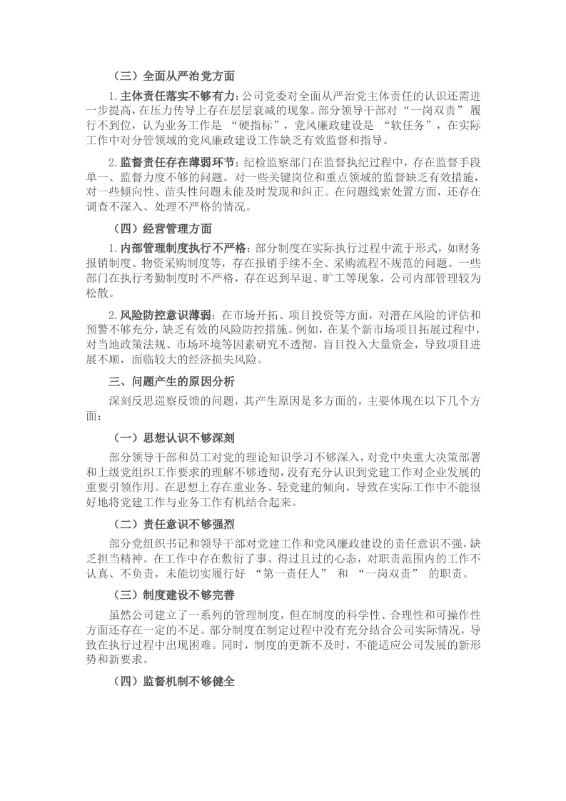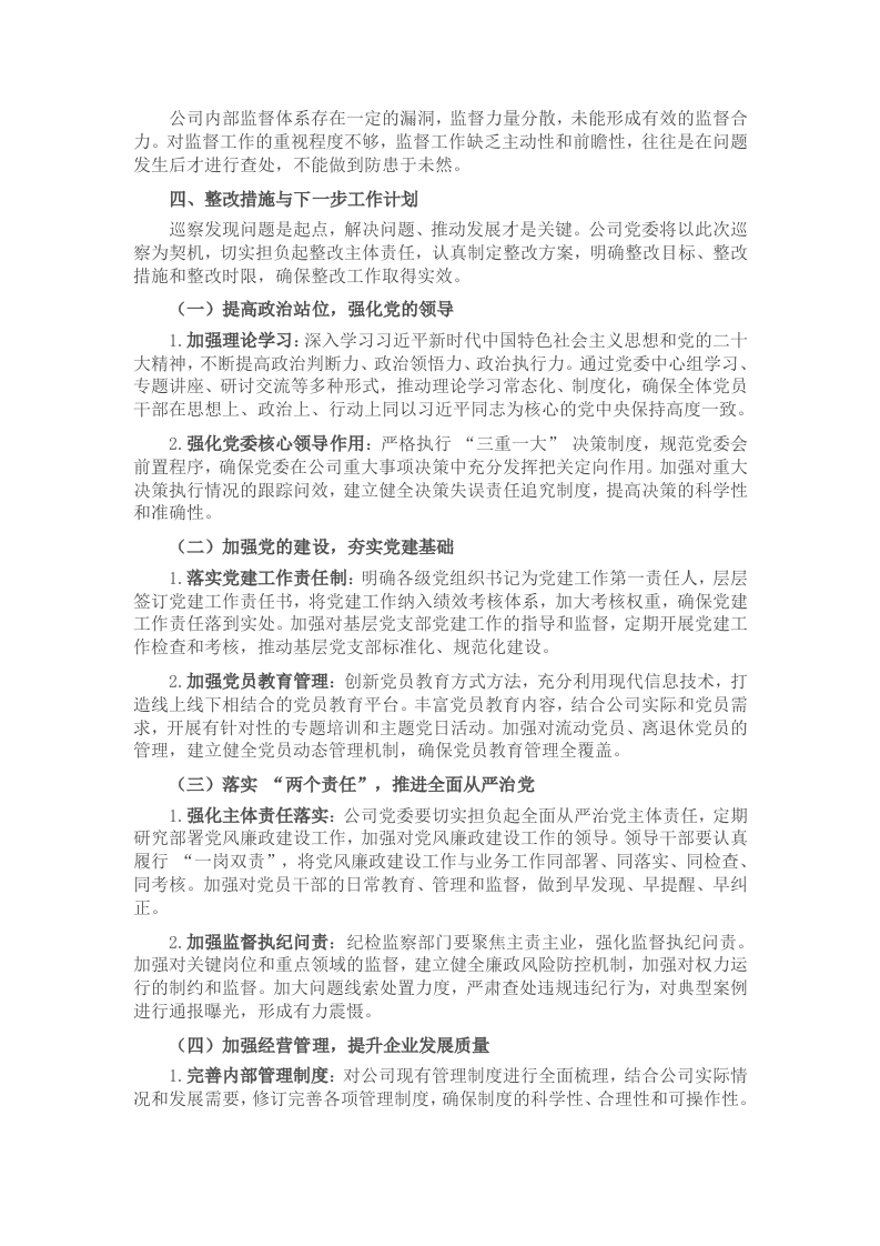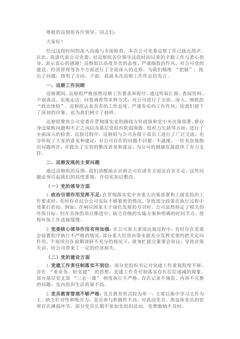 尊敬的巡察组各位领导、同志们:大家好!经过这段时间的深入沟通与全面检查,本次公司党委巡察工作已接近尾声。在此,我谨代表公司党委,对巡察组各位领导这段时间以来的辛勤工作与悉心指导,表示衷心的感谢!巡察组以高度负责的态度、严谨细致的作风,对公司党的建设、经营管理等各个方面进行了全面深入的巡察,为我们精准“把脉”,找出了问题,指明了方向。下面,我就本次巡察工作作总结发言。一、巡察工作回顾巡察期间,巡察组严格按照巡察工作要求和程序,通过听取汇报、查阅资料、个别谈话、实地走访、问卷调查等多种方式,对公司进行了全面、深入、细致的“政治体检”。巡察组认真负责的工作态度、严谨务实的工作作风,给我们留下了深刻的印象,也为我们树立了榜样。巡察组聚焦公司党委在贯彻落实党的路线方针政策和党中央决策部署、群众身边腐败问题和不正之风以及基层党组织软弱涣散、组织力欠缺等方面,进行了全面深入的检查。巡察过程中,巡察组与公司各级干部员工进行了广泛交流,充分听取了大家的意见和建议,对公司存在的问题不回避、不遮掩,一针见血地指出问题所在,并提出了宝贵的整改意见和建议,为公司的健康发展提供了有力支持。二、巡察发现的主要问题通过巡察组的反馈,我们清醒地认识到公司在诸多方面还存在不足,这些问题必须引起我们的高度重视,并切实加以整改。(一)党的领导方面1.政治引领作用发挥不足:在贯彻落实党中央重大决策部署和上级党组织工作要求时,有时存在结合公司实际不够紧密的情况,导致部分政策在执行过程中效果打折扣。例如,在响应国家关于绿色发展的号召时,公司虽然制定了相关的环保目标,但在具体的项目推进中,缺乏详细的实施方案和明确的时间节点,使得环保工作进展缓慢。2.党委核心领导作用有待加强:在公司重大事项决策过程中,有时存在党委会前置程序执行不严格的情况,部分重大经营决策未能充分发挥党委的把关定向作用。个别项目在前期调研不充分的情况下,就匆忙提交董事会审议,导致决策失误,给公司带来了一定的经济损失。(二)党的建设方面1.党建工作责任制落实不到位:部分党组织书记对党建工作重视程度不够,存在“重业务、轻党建”的思想,党建工作责任制落实存在层层递减的现象。部分基层党支部“三会一课”制度执行不严格,存在记录不规范、内容不完整的问题,党内组织生活质量不高。2.党员教育管理不够严格:党员教育形式较为单一,主要以集中学习文件为主,缺乏针对性和吸引力,党员参与积极性不高。对流动党员、离退休党员的管理存在薄弱环节,部分党员长期不参加党组织活动,党费缴纳不及时。