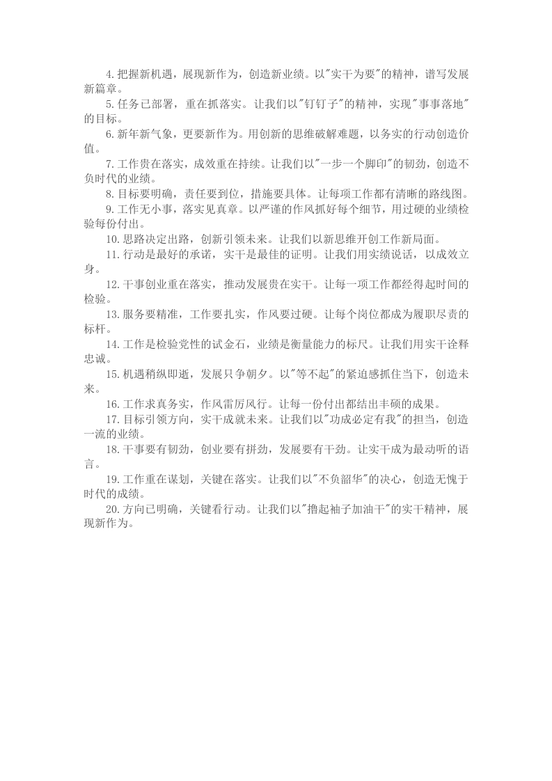 一、收心会场景金句1.节日的气氛虽然温暖,工作的号角更加嘹亮。让我们从春节的祥和中走出,向着奋斗的征程进发。2.收心不是一个简单的姿态,而是一种责任的回归,使命的重启。3.春节的团圆点亮了生活,工作的充实成就了价值。让我们以最好的精神状态,点燃奋斗的激情。4.与其在节日的氛围中沉醉,不如用饱满的热情开启新的征程。收心就是冲锋的号角,归位就是出发的起点。5.过去的假期是充电,现在的工作是冲锋。把握当下,就抓住了开局的先机。6.成功从不眷顾懈怠的人,机遇永远青睐有准备的团队。让我们立即转变状态,以最佳的姿态迎接挑战。7.春节的祝福是力量,收心的行动是担当。让我们用实干诠释初心,以奋斗书写华章。8.假期虽然结束,但奋斗的脚步永不停歇。让每一天都成为追逐梦想的新起点。9.收心不仅是状态的转变,更是精神的重整。让我们以崭新的面貌开启新的征程。10.节日的喜悦已成回忆,工作的责任正在召唤。让我们以”归零“的心态,重启奋斗的征程。11.春节的温暖犹在,但责任的召唤更急。让我们以“等不起“的紧迫感,跑出“开局即决战”的加速度。12.收心不是结束,而是新的开始。用实干托起希望,让奋斗成就梦想。13.休憩的时光已过,拼搏的征程正启。让我们以只争朝夕的劲头,创造不负韶华的业绩。14.把春节的美好祝愿转化为奋斗的不竭动力,让每一天都闪耀着奋进的光芒。15.收心是一种态度,更是一份责任。让我们用实干诠释担当,以业绩证明价值。16.节日虽有温度,奋斗更有高度。让我们以最饱满的热情投入工作,创造最精彩的业绩。17.把团圆的喜悦化作前进的动力,让拼搏的汗水浇灌事业的硕果。18.收心不是简单的转变,而是责任的重新起航。让我们以实干笃定前行,用奋斗书写答卷。19.春节的温馨是充电,收心的行动是起航。让我们把美好的祝福化作奋进的力量。20.休养的时光给了我们能量,工作的舞台给我们机会。让我们用实干证明担当,以奋斗展现作为。二、工作部署会场景金句1.蓝图已绘就,奋斗正当时。让我们以“只争朝夕“的精神,创造“日新月异“的业绩。2.目标已明确,关键在行动。用”马上就办“的效率,践行“办就办好“的承诺。3.思路要清晰,措施要精准,行动要迅速。让每一项工作都经得起实践的检验。