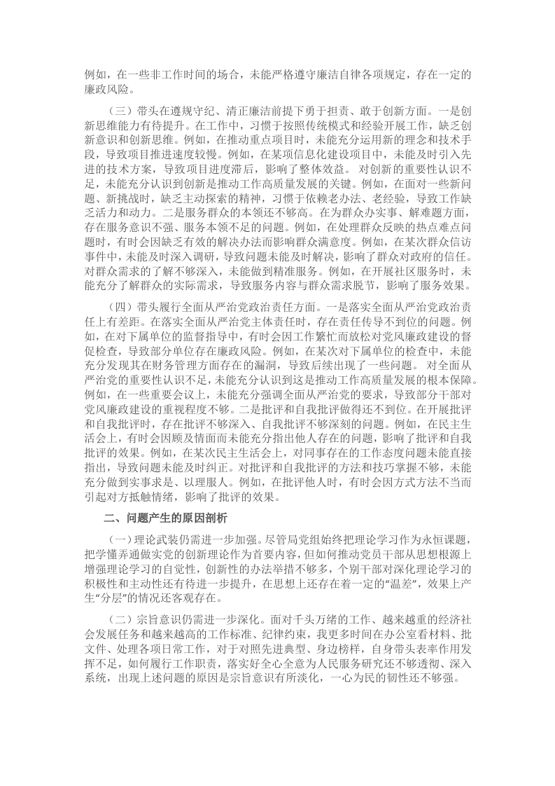 根据市委《关于召开2024年度民主生活会的通知》有关要求和局党组相关工作部署,我紧扣本次专题民主生活会主题,聚焦“四个带头”总体要求,坚持问题导向,认真学习研讨,开展谈心谈话,深入查摆和梳理自身存在的问题,深刻剖析原因,并提出整改方案,落实整改措施。按照会议安排,现对照检查如下:一、存在的主要问题(一)带头严守政治纪律和政治规矩,维护党的团结统一方面。一是对政治信仰的重要作用认识不够深刻。虽然始终坚定政治信仰,但在实际工作中,未能充分认识到政治信仰对工作的引领作用。例如,在面对复杂多变的工作任务时,有时会因任务繁重而忽视从政治高度去思考和谋划工作,导致工作推进不够系统、全面。例如,在推进某项重大改革项目时,未能充分从政治大局出发,导致在项目初期出现了一些协调不畅的问题,影响了整体进度。对政治信仰的内涵理解不够深入,未能将其与日常工作紧密结合。在组织学习和讨论时,有时会因缺乏深入思考而流于形式,未能真正将政治信仰内化于心、外化于行。二是强化政治教育的方式单一。在组织政治教育时,形式较为单一,多以集中学习、传达文件为主,缺乏创新性和针对性。例如,在学习习近平新时代中国特色社会主义思想时,未能充分结合实际案例进行深入剖析,导致部分党员干部对理论的理解浮于表面,难以转化为实际行动。对于年轻干部的政治教育,未能充分考虑其特点和需求,教育内容和方式较为传统,难以激发他们的学习兴趣和积极性。例如,在组织年轻干部学习二十届二中、三中全会精神时,未能充分利用新媒体和互动式教学,导致学习效果不佳。三是意识形态宣传教育方式滞后于时代发展。在意识形态宣传教育方面,未能及时跟上时代步伐,宣传教育内容和方式较为传统。例如,在网络新媒体快速发展的背景下,未能充分利用新媒体平台进行意识形态宣传,导致宣传教育的覆盖面和影响力有限。对意识形态领域的复杂形势认识不足,未能及时发现和应对一些潜在的风险和挑战。例如,在面对一些网络谣言和负面信息时,未能及时采取有效措施进行引导和纠正,导致部分群众受到误导。(二)带头增强党性、严守纪律、砥砺作风方面。一是对“生活中有政治”的认识不够深刻,把握不够精准。在日常生活中,有时会忽视政治纪律和政治规矩的约束作用,未能充分认识到生活中的言行举止都与政治密切相关。例如,在与家人、朋友交流时,偶尔会放松警惕,对一些不当言论未能及时纠正,甚至有时会因个人情绪影响而发表一些不符合党员身份的言论。对“生活中有政治”的具体内涵理解不够深刻,未能将其贯穿于日常生活的方方面面。例如,在参与社区活动时,未能充分从政治高度去思考如何发挥党员先锋模范作用,导致在一些社区事务中未能积极发声、主动作为。二是学用结合不够好。在学习党纪党规和习近平新时代中国特色社会主义思想时,存在学用脱节的现象。虽然能够认真学习理论知识,但在实际工作中,未能将理论与实践紧密结合,导致工作效果不够理想。例如,在处理一些复杂问题时,未能充分运用所学理论进行分析和解决,导致问题久拖不决。三是对理论学习的深度和广度把握不够,未能做到系统学习、全面领会。例如,在学习党的二十届二中、三中全会精神时,仅停留在对文件的表面理解上,未能深入挖掘其精神实质和核心要义,导致在实际工作中难以有效运用。纪律自觉尚未完全转化为日常习惯和行动准绳虽然能够严格遵守党纪党规,但在日常工作中,有时会因工作繁忙而放松对纪律的自我约束。例如,在执行请示报告制度时,偶尔会出现口头报告代替书面报告的情况,未能将纪律要求完全内化为日常习惯。对纪律的敬畏之心有所减弱,未能时刻以高标准严格要求自己。