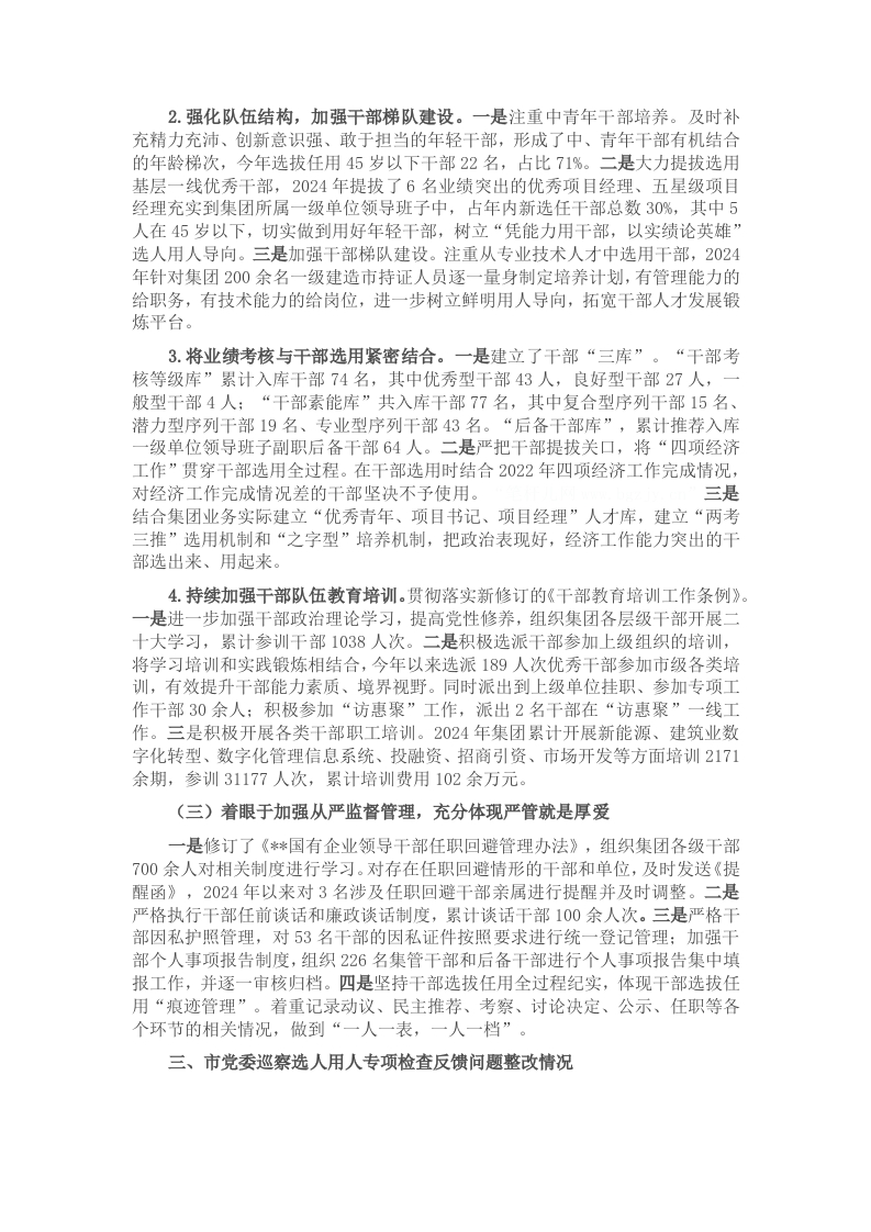 2024年某国有企业党委选人用人工作情况报告2024年,*国有企业党委以学习贯彻习近平新时代中国特色社会主义思想为主线,在*市党委、众信建设党委的正确领导下,深入贯彻市组织工作会议精神,围绕贯彻集团党委决策部署、聚焦主责主业、推动高质量发展,选优配强干部人才,抓好干部培育、选拔、管理和使用等环节,着力打造忠诚干净担当的高素质专业化干部队伍,为企业高质量发展提供坚强组织保障。现将2024年度选人用人工作情况汇报如下:一、干部基本情况截至2024年底**国有企业管理的干部170人,其中集团总部机关中层干部40人,直接管理的一级单位领导班子成员130人。集管干部中本科及以上学历156人,占干部总数的91%:中级及以上职称146人,占干部总数的86%(其中高级职称干部99人,占干部总数的58%)。二、选人用人工作情况集团始终坚持“凭能力用干部,以实绩论英雄”的选人用人导向,严格执行党管干部原则,不断完善工作机制,在选拔任用干部工作中,坚持任人唯贤、德才兼备、注重实绩、竞争择优的原则,不断营造有利于干部人才脱颖而出、健康发展的良好环境。2024年集团聘任干部59人,其中提拔、进一步使用干部31人,公开招竞聘集团总部机关中层干部2人,平职交流干部26人。因履职不力、工作不胜任等原因降职干部3人。(一)着眼于凝心铸魂,坚持政治标准严把控选人用人关口一是严把政治关。把深入学习贯彻习近平新时代中国特色社会主义思想作为主题主线,坚持把政治标准作为集团党委选拔干部的第一标准,将政治素质考察贯穿于干部选拔全过程。大力选拔坚定拥护“两个确立”、坚决做到“两个维护”、在思想上政治上行动上始终同以习近平同志为核心的党中央保持高度一致的干部,对政治上不合格的干部“一票否决”。二是严把品德关。实行多方位、立体式考察干部的道德品行,突出政治、道德、业绩“三条标准线”,严格落实“凡提四必”和党委书记、纪委书记廉政意见“双签字”要求,在干部选用中始终坚持“德才兼备、以德为先,五湖四海、任人唯贤”。三是严把绩效关。根据市党委“四项经济工作”考核机制,结合**国有企业实际修订完善了绩效考核实施细则,坚持把绩效考核作为干部考核评价的重要手段,注重考核干部的工作实绩、德才表现、廉洁自律等,并与党建考核相结合,使干部考核更加精准科学。(二)着眼于健全干部工作体系,建设高素质专业化干部队伍1.深入学习,不断完普干部管理机制。一是集团党委坚持通过党委理论中心组、专题会议等方式不断深入学习《党政领导干部选拔任用工作条例》《*市国有企业管理人员管理办法》等政策制度,把对制度的学习贯彻作为重点。二是进一步完善干部管理制度。对干部管理权限进行分级授权,并制定集团干部交流、轮岗实施方案,全面启动集团内部轮岗和干部交流工作,进一步畅通干部通道。2024年集团总部与所属单位交流干部14人,开展部分单位总会计市、总经济市轮岗,累计轮岗8人。