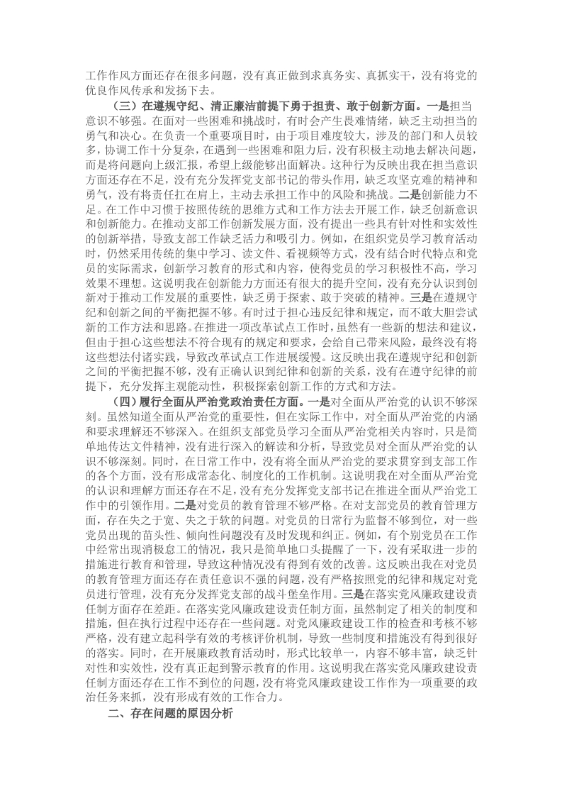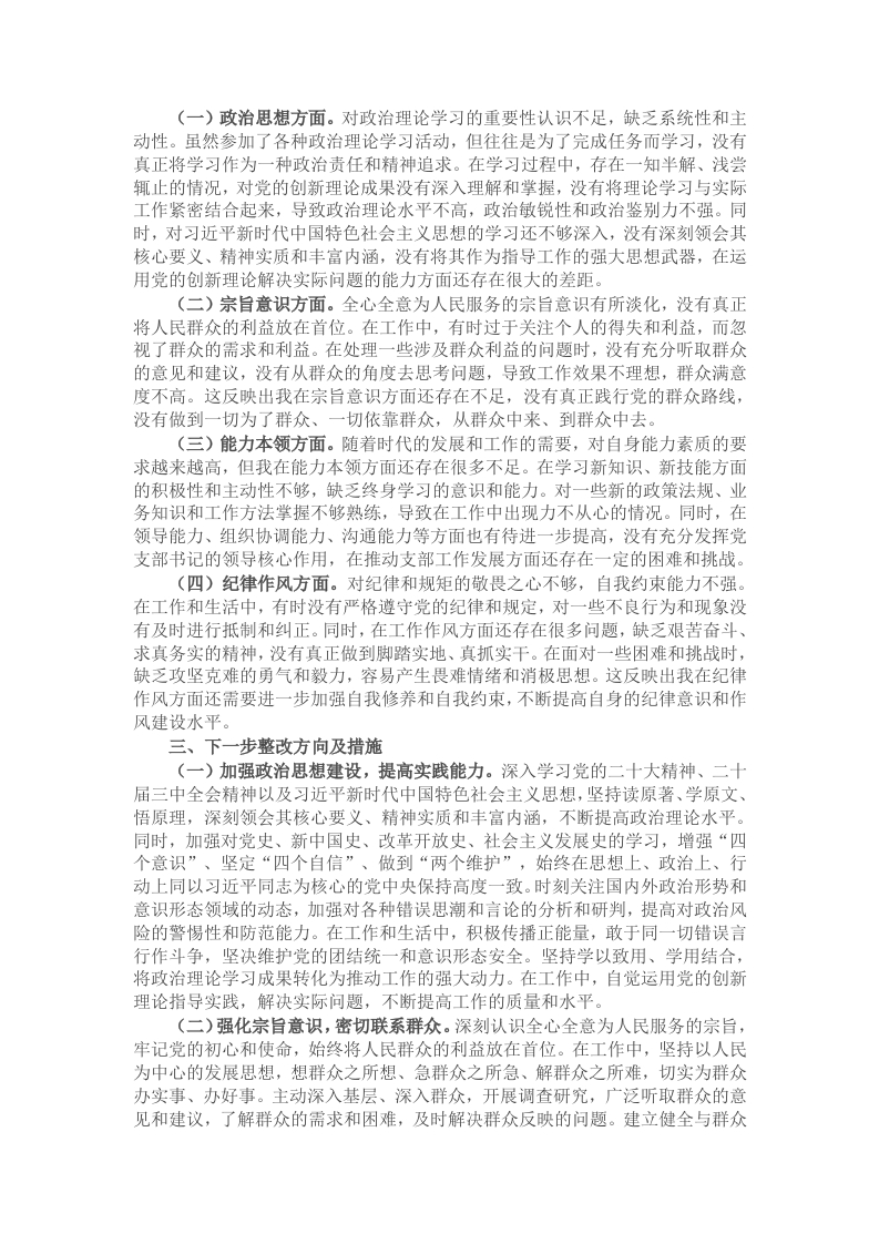 根据党支部召开2024年组织生活会的通知要求,我深入学习了党的二十届三中全会精神,认真研习了党规以及《中国共产党章程》《条例》《中国共产党支部工作条例(试行)》等党内法规,与支部党员开展了深入的谈心谈话,广泛听取批评意见,对照“四个带头”进行了全面深入的自我检视,查找自身存在的问题,明确了整改方向,并制定了切实可行的整改措施。现将个人对照检查情况汇报如下。一、存在的主要问题及表现(一)围绕严守政治纪律和政治规矩,维护党的团结统一方面。一是政治敏锐性有待提高。对一些潜在的政治风险和意识形态问题缺乏足够的警觉性。在日常工作和生活中,浏览网络信息时,对一些看似平常却可能存在错误导向的言论和观点,没有及时辨别和抵制。例如,在浏览某些社交媒体平台时,看到一些对国家政策断章取义、歪曲解读的帖子,只是简单地划过,没有意识到其潜在的危害,也没有积极采取行动进行反驳和纠正,没有充分发挥党员在维护意识形态安全方面的先锋模范作用。这反映出我在政治敏锐性方面的不足,对政治风险的警惕性不够高,未能时刻保持政治上的清醒和坚定。二是贯彻执行上级决策部署不够彻底。在落实上级党组织的一些决策部署时,有时存在打折扣、搞变通的情况。在执行某项涉及业务调整的上级决策时,由于担心调整会对本部门的短期业绩产生一定影响,没有积极主动地去推动,而是采取了观望的态度,导致工作进度滞后。虽然最终完成了任务,但与上级的要求和预期目标还有一定差距。这种行为反映出我在政治纪律和政治规矩方面的意识不够强,没有充分认识到坚决贯彻执行上级决策部署的重要性,缺乏大局意识和担当精神,没有将党的事业和工作的整体利益放在首位。三是在维护党的团结统一方面发挥作用不够。在支部内部,有时对一些不利于团结的言论和行为没有及时进行制止和纠正。当听到个别党员在背后议论其他同志,传播一些不实信息时,只是简单地提醒了一下,没有严肃地进行批评教育,没有从维护党的团结统一的高度去认识和处理这个问题。这说明我在维护党的团结统一方面的责任感不够强,没有充分发挥党支部书记的带头作用,没有积极营造团结和谐的党内氛围,对党的团结统一的重要性认识还不够深刻。(二)增强党性、严守纪律,砥砺作风方面。一是党性修养不够深入。在党性锻炼方面还存在一定的差距,缺乏持之以恒的精神。虽然参加了各种党性教育活动,但在实际工作和生活中,没有将党性要求完全融入到日常行为中。例如,在面对一些个人利益和集体利益发生冲突的情况时,有时会优先考虑个人利益,没有从党性的高度去处理问题,没有做到无条件地服从集体利益。这反映出我在党性修养方面还不够成熟,没有真正将党性原则内化于心、外化于行,缺乏坚定的党性立场和高尚的党性品格。二是纪律意识不够牢固。在遵守工作纪律方面,偶尔会出现松懈的情况。有几次因为个人原因,上班迟到了几分钟,虽然没有造成严重的后果,但这种行为违背了工作纪律的要求。这说明我在纪律意识方面还存在不足,没有将纪律要求时刻牢记在心,没有养成自觉遵守纪律的良好习惯。同时,对一些纪律规定的学习还不够深入,理解不够透彻,导致在执行过程中出现偏差。三是工作作风不够扎实。在工作中存在形式主义的倾向,有时过于注重工作的形式和表面,而忽视了工作的实际效果。在组织一些支部活动时,为了完成任务而完成任务,没有充分考虑活动的实际意义和党员的需求,导致活动的参与度不高,效果不佳。此外,在工作中还存在浮躁情绪,对一些复杂问题缺乏耐心和毅力,没有深入研究和解决问题,而是采取敷衍了事的态度。这反映出我在