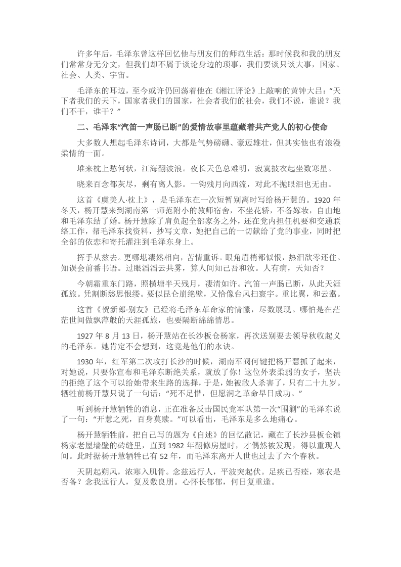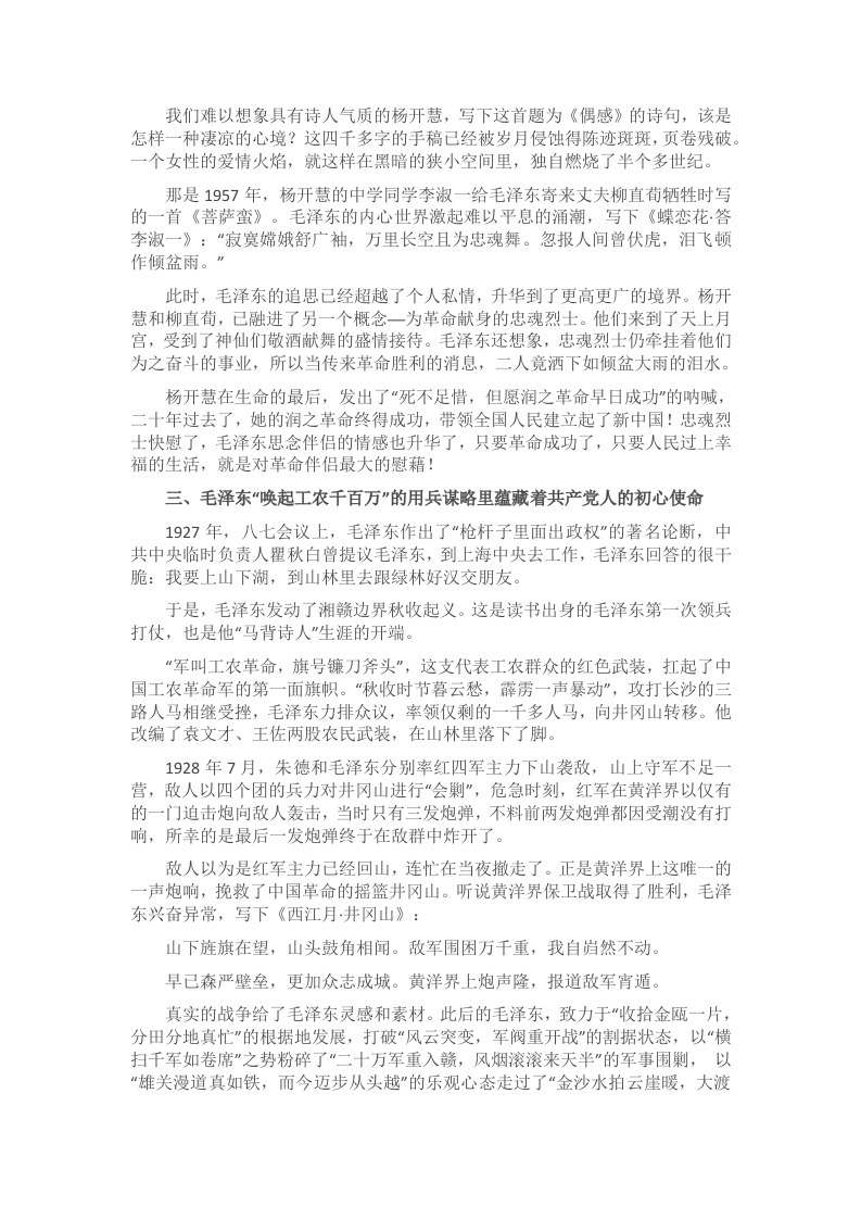 毛泽东是伟大的革命家、政治家、军事家、思想家,同时又是独领风骚的诗词巨匠。他是中国共产党、中国人民解放军和中华人民共和国的主要缔造者和领导人,他的初心和中国共产党人的初心,是天然地联系在一起的。毛泽东诗词是毛泽东人生观、世界观、价值观的高度浓缩和艺术载体。借助诗词去解读和分析毛泽东的初心,也有助于更好地理解和把握中国共产党人的初心。一、毛泽东“孩儿立志出乡关”的人生志向里蕴藏着共产党人的初心使命1910年秋天,17岁的毛泽东离开韶山去湘乡县城就读东山高等小学堂。临行前,改写了日本一个叫月性和尚写的言志诗,夹在了父亲每天必看的账簿里。孩儿立志出乡关,学不成名誓不还。埋骨何须桑梓地,人生无处不青山。毛泽东把原诗中的“男儿”改成“孩儿”,儿子在父亲面前永远长不大:他把“死不还”改成“誓不还”,中国人都忌讳“死”这个字,毛泽东很在乎父亲的感受。但是,他更知道,种几亩良田,收几份佃租的温饱生活并不是他想要的。毛泽东从学生时代开始,就志存高远,积极探索救国救民之策。在湖南第一师范学校求学时,毛泽东的人生志愿是“立奇志、交奇友、读奇书、创奇事,做一个奇男子”。1915年5月9日,袁世凯同日本政府签订丧权辱国的“二十一条”,消息传出,举国震动。湖南第一师范学校的师生将国内知名人士反对卖国条约的言论编印成册,题为《明耻篇》。毛泽东读后,在封面上愤然写道:五月七日,民国奇耻。何以报仇,在我学子!毛泽东的同窗好友易昌陶,恰巧就是这个时候病逝的。“东海有岛夷,北山尽仇怨。我怀郁如焚,放歌倚列嶂。”好友的病逝使毛泽东更牢固地树立了一个信念一一强健体魄对于人生奋斗,对于报国救民有着重要的前提意义。毛泽东《新青年》上的《体育之研究》里提出了一个颇为新鲜的口号:文明其精神,野蛮其体魄。说到做到的毛泽东,潜心实践着他的这个信念。寒冬时节,他用冷水擦身。大雨滂沱,他在野外奔跑。江水滔滔,他去搏击风浪。他甚至琢磨出一套强身健体的广播体操,四处推广。“与天奋斗,其乐无穷:与地奋斗,其乐无穷:与人奋斗,其乐无穷。”青年毛泽东在日记本里写下了这样的人生箴言。很快,在毛泽东周围便聚集起了蔡和森、李立三、向警予、李维汉、何叔衡等志同道合的青年。他们常常相约到长沙的岳麓山、橘子洲、平浪宫等风景名胜处聚会,他们“指点江山,激扬文字,粪土当年万户侯”。中华民族内忧外患,毛泽东发出振聋发聩的诘问:“问苍茫大地,谁主沉浮?”