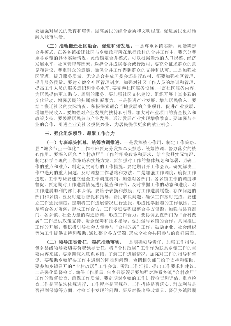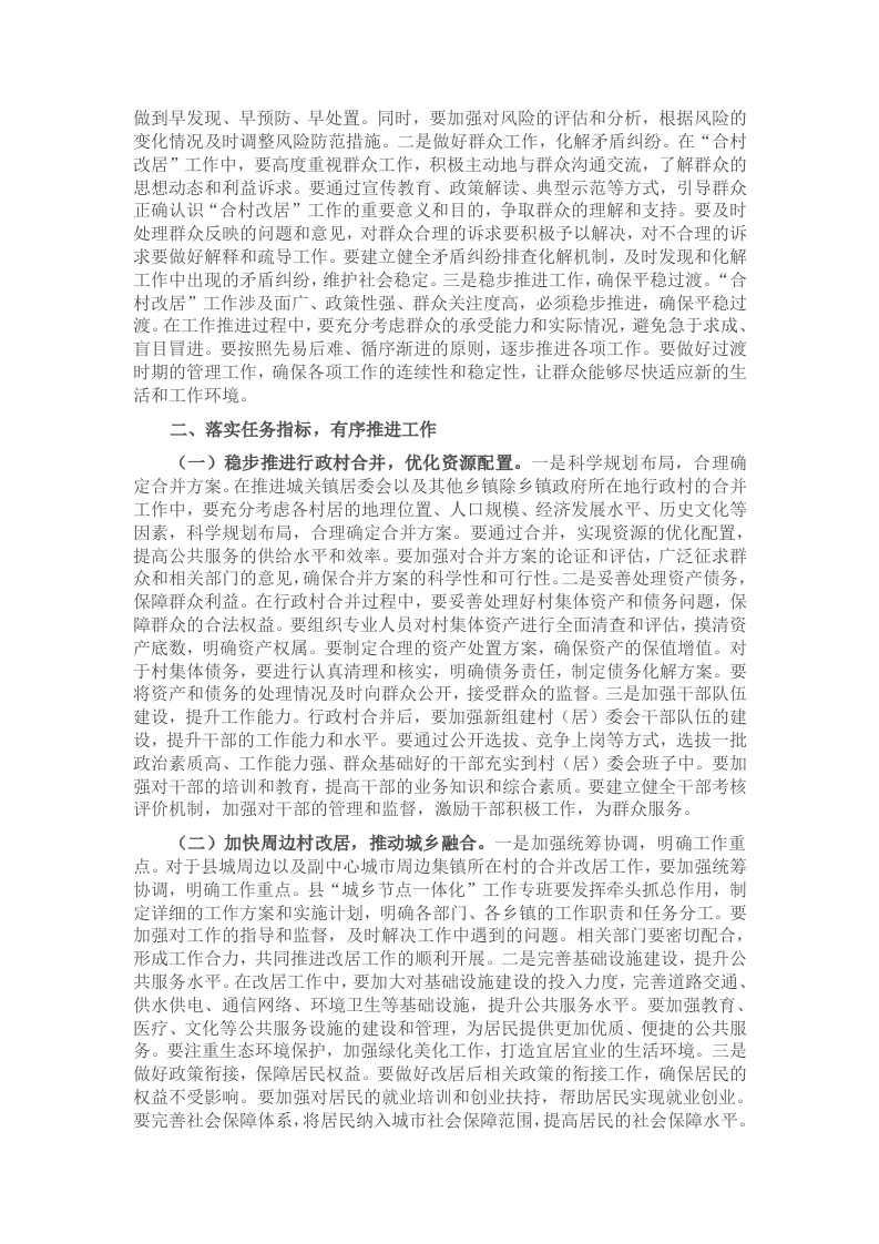 同志们:今天,我们召开“合村改居”工作座谈会,旨在进一步统一思想、凝聚共识,推动我县“合村改居”工作高质量开展。“合村改居”工作是提升我县城镇化水平、优化资源配置、提高治理效能的关键举措,对于我县的长远发展意义重大。下面,我围绕如何做好这项工作,谈几点意见。一、坚守工作准则,确保平稳推进(一)压实乡镇责任,强化属地管理。一是落实主体责任,明确工作目标。各乡镇作为“合村改居”工作的直接责任主体,要深刻认识到这一工作的重要性和紧迫性,将其作为当前的重点工作来抓。乡镇主要领导要亲自挂帅,担任“合村改居”工作的第一责任人,制定详细的工作计划和目标任务,明确工作的时间节点和进度安排,确保各项工作有条不紊地推进。同时,要将工作任务层层分解,落实到具体的部门和个人,做到责任明确、任务到人。二是深入基层调研,掌握实际情况。各乡镇要组织工作人员深入到各村居,开展全面细致的调研工作。通过实地走访、召开座谈会、问卷调查等方式,充分了解群众的意愿和诉求,掌握各村居的人口、土地、经济、文化等方面的实际情况。要建立工作台账,对调研中发现的问题进行梳理和分类,为制定科学合理的工作方案提供依据。同时,要及时向上级部门汇报调研情况,争取上级部门的支持和指导。三是加强沟通协调,形成工作合力。各乡镇要加强与县直相关部门的沟通协调,建立健全工作协调机制。在工作推进过程中,要及时与相关部门沟通工作进展情况,共同研究解决工作中遇到的困难和问题。要积极配合县直部门开展工作,为县直部门提供必要的支持和帮助。同时,各乡镇之间也要加强交流与合作,相互学习借鉴好的经验和做法,共同推动“合村改居”工作的顺利开展。(二)严格依法依规,规范工作流程。一是加强法律法规学习,提高法治意识。各部门、各乡镇要组织工作人员认真学习与“合村改居”工作相关的法律法规和政策文件,如《中华人民共和国村民委员会组织法》《中华人民共和国城市居民委员会组织法》等,提高工作人员的法治意识和业务水平。要通过举办培训班、专题讲座、研讨会等形式,加强对工作人员的培训,使其熟悉工作流程和操作规范,确保工作依法依规进行。二是规范工作程序,确保公开透明。在“合村改居”工作中,要严格按照法定程序进行操作,确保工作的公开、公平、公正。涉及到群众切身利益的重大事项,如村集体资产处置、居民身份转换、社会保障衔接等,要广泛征求群众意见,充分保障群众的知情权、参与权和监督权。要及时将工作进展情况和相关信息向群众公开,接受群众的监督。同时,要建立健全工作档案,对工作过程中的文件、资料、会议记录等进行妥善保存,以备查阅。三是加强法律监督,维护群众权益。县司法部门要加强对“合村改居”工作的法律监督,确保工作依法依规进行。要建立健全法律监督机制,对工作中出现的违法违规行为及时进行纠正和处理。要加强对群众的法律援助和服务,为群众提供法律咨询和帮助,维护群众的合法权益。同时,要加强对工作人员的廉政教育,防止在工作中出现以权谋私、贪污受贿等违法违纪行为。(三)秉持稳妥态度,防范化解风险。一是制定风险预案,提前防范风险。各部门、各乡镇要充分认识到“合村改居”工作中可能存在的风险,如群众抵触情绪、社会稳定风险、资产流失风险等。要结合实际情况,制定详细的风险预案,明确风险防范的重点和措施。要建立风险预警机制,及时发现和掌握风险隐患,