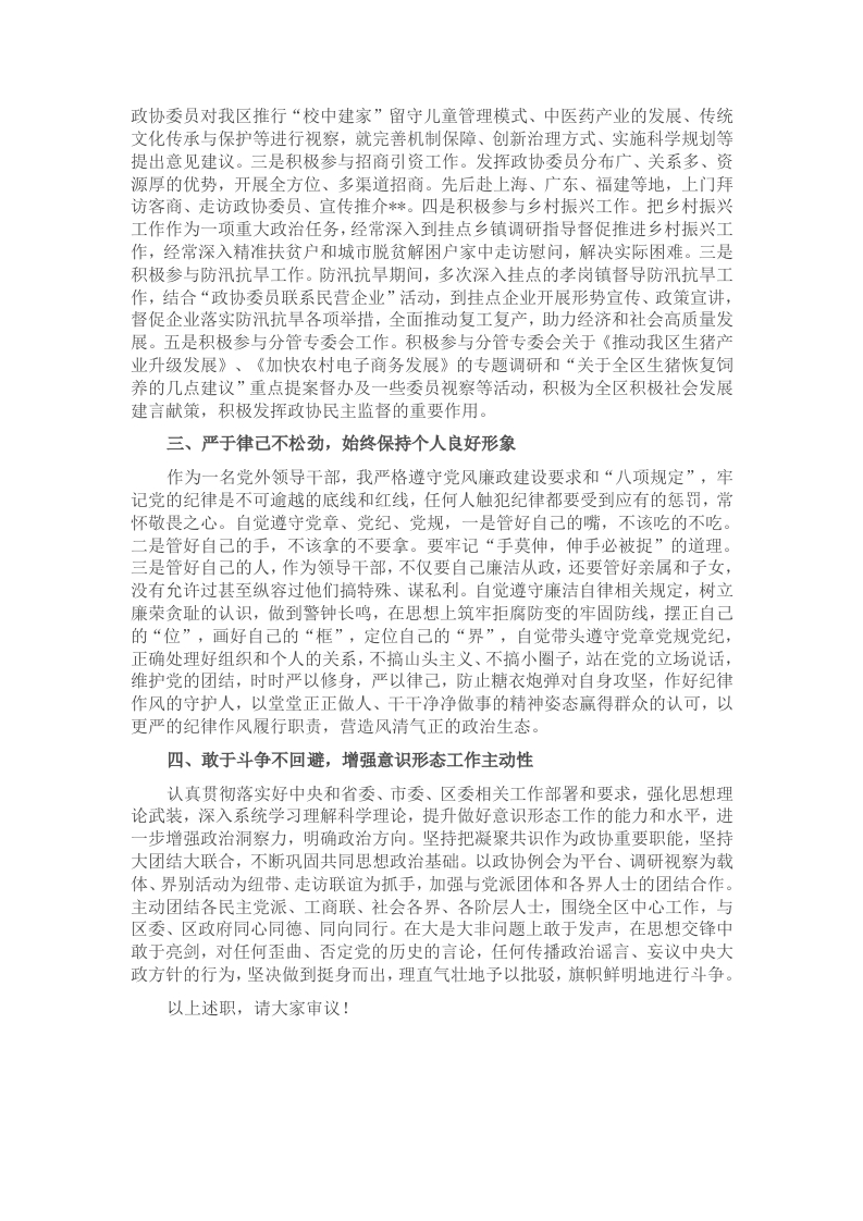 2024年1月,根据市委安排,本人辞去区政协副主席职务,转任区政协三级调研员,2024年7月转任区政协二级调研员。协助分管教科文卫体和学习委员会、社会法制港澳台侨民族宗教委员会。一年来,在区委的坚强领导下,按照区政协党组工作分工,认真履行职责,较好地完成了职责范围内各项工作任务。现将本人一年来的思想、工作、学习情况报告如下:一、狠抓学习不放松,努力提高自身综合素质始终把加强学习作为增强自身综合素质的重要途径,通过参加集中学习以及个人自学等形式,结合“*之害”解放思想大讨论活动,深入学习习近平新时代中国特色社会主义思想,党的二十大和二十届二中、三中全会以及省、市、区委全会精神,《习近平新时代中国特色社会主义思想专题摘编》《中国共产党纪律处分条例》,习近平总书记视察云南重要讲话精神,习近平总书记关于加强和改进人民政协工作的重要思想,中央和省、市、区委政协工作会议精神,做到真学、真信、真懂、真用,不断提高用党的创新理论指导实践、推动自身工作的能力和水平。始终把法治方式作为推动工作的首要方式,认真领会习近平法治思想,自觉遵守宪法法律、政协章程和各项规章制度,坚持在宪法法律和政协章程范围内履行职责、开展工作,自觉做社会主义法治的忠实崇尚者、自觉遵守者和坚定捍卫者。二、认真履职不懈怠,积极服务经社会发展一是积极围绕中心履职。充分发挥政协优势,上门拜访客商、走访政协委员、宣传推介**,开展全方位、多渠道招商。经常深入精准扶贫户和城市脱贫解困户家中走访慰问,解决实际困难。防汛抗旱期间,多次深入挂点的红光垦殖场督导防汛抗旱工作,结合“政协委员联系民营企业”活动,到挂点企业开展形势宣传、政策宣讲,督促企业落实防汛抗旱各项举措,全面推动复工复产。二是发挥政协优势履职。在提案督办方面,围绕群众关心的热点问题,切实抓好“关于大力发展以优质水稻为重点的特色种植业的建议“关于加强城市道路开挖管理的建议”“关于加强水库退养后水产养殖的指导和监管的建议”“关于发展休闲农业、生态旅游产业的几点建议”等重点提案的督办,督促有关部门抓好有关问题建议的落实,促使一批事关民生的难题的到了有效的解决。在民主监督方面,推荐9名政协委员担任相关部门的民主监督员,组织委员参加规划调整、物价评议等方面的听证会10多人次,较好地发挥了政协民主监督的职能作用。在发挥委员作用方面,充分发挥界别资源优势,积极开展政协委员“界别活动月”活动、联系走访民营企业活动、“委员学习研讨交流”活动,动员经济和农业农村委员会委员深入企业,基层群众开展调研视察和社会公益等活动,为企业解决问题建议6个,在抗击防汛抗旱和捐资助学过程中经济和农业农村委员会委员累计捐款近30万元。紧扣人民对美好生活的向往提出意见建议。开展“提高残疾人保障能力”专题调研,建议采取建立独立的残疾人社会保障体系、完善残疾人社会救助制度、推动残疾人社区服务规范化等措施,进一步完善残疾人社会保障体系,提高残疾人保障制度化、规范化水平。与分管专委会一道开展专题调研、开展重点提案督办、组织委员进行视察,积极发挥政协建言资政、民主监督等方面的作用。为积极应对人口老龄化问题,开展“加快推进医养融合,助推健康养老事业发展”专题调研,提出“建立医养融合发展的运行机制和服务模式”“加强基层医疗卫生养老服务能力建设”“推进养护型和医护型养老服务设施建设”等建议。组织