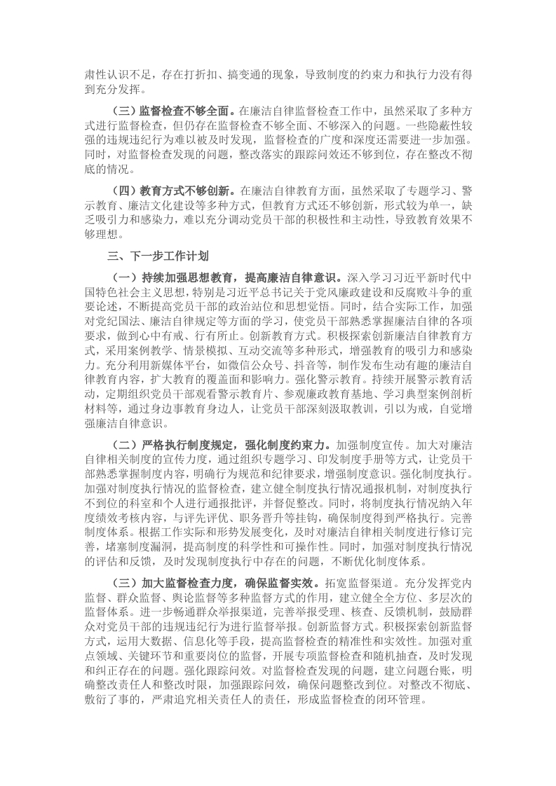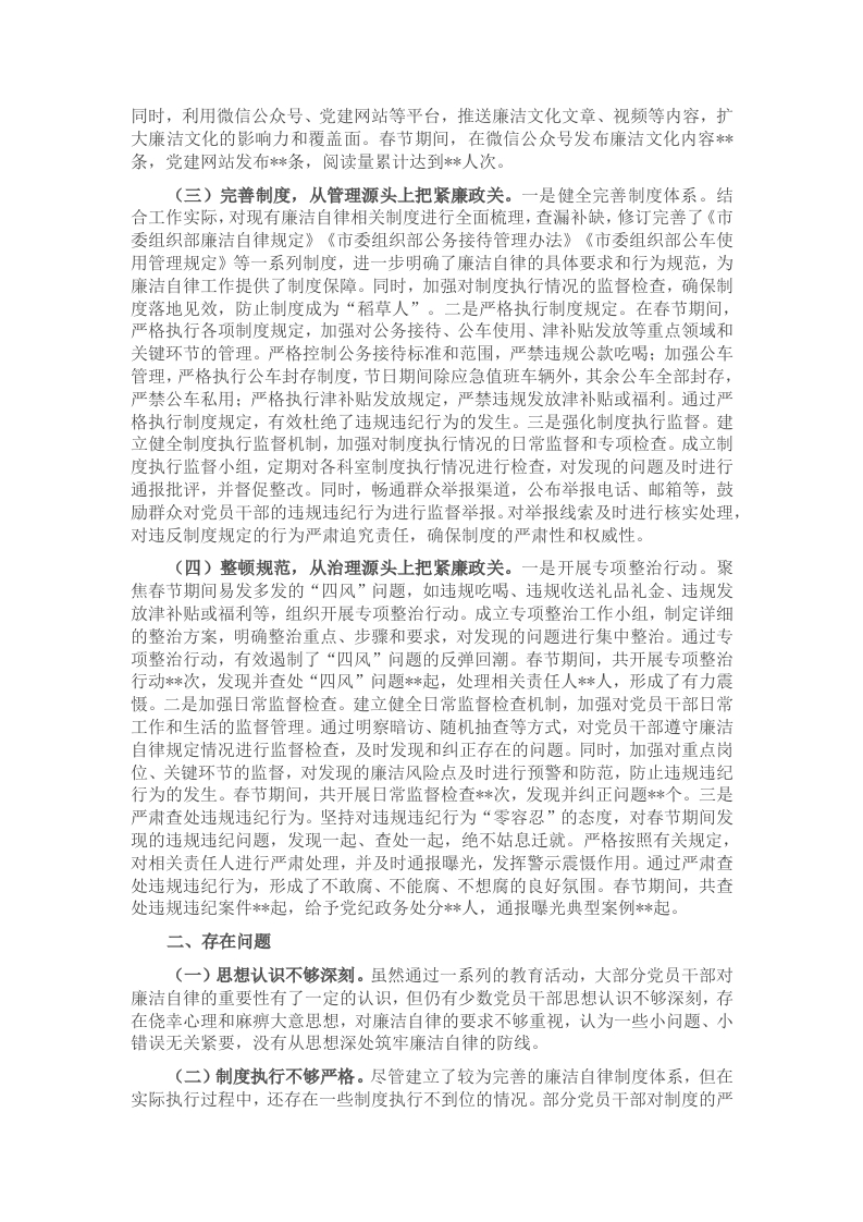 春节期间,是人情往来密集、“四风”问题易发高发的特殊时期,抓好廉洁自律工作对维护党和政府形象、营造风清气正的政治生态至关重要。2025年春节期间,市委组织部认真贯彻落实中央八项规定精神及上级有关廉洁自律的各项要求,紧密围绕加强领导、强化教育、完善制度、整顿规范等方面,扎实推进廉洁自律工作,取得了阶段性成效。现将工作情况报告如下:一、工作开展情况(一)加强领导,从组织源头上把紧廉政关。一是强化组织领导与责任落实。市委组织部高度重视春节期间廉洁自律工作,将其作为一项重要政治任务来抓。节前,部务会专门召开会议,专题研究部署春节期间廉洁自律工作,结合实际制定了详细的工作方案,明确了工作目标、任务和责任分工,确保各项工作有序推进。成立了以部主要领导为组长,各分管领导为副组长,各科室负责人为成员的廉洁自律工作领导小组,负责统筹协调、指导监督全市组织系统春节期间廉洁自律工作。同时,要求各级党组织切实扛起主体责任,党组织书记认真履行“第一责任人”职责,班子成员严格落实“一岗双责”,形成了一级抓一级、层层抓落实的工作格局。二是开展廉政谈话与提醒。为进一步增强党员干部的廉洁自律意识,市委组织部开展了多层次、全覆盖的廉政谈话活动。部主要领导与班子成员、班子成员与分管科室负责人、科室负责人与科室成员之间分别进行了廉政谈话,通过面对面交流,重申廉洁纪律,强调廉洁过节的重要性,提醒党员干部时刻保持清醒头脑,自觉抵制各种诱惑,做到廉洁从政、廉洁用权、廉洁修身、廉洁齐家。此外,还通过发送廉政短信、微信工作群提醒等方式,向全体党员干部发送廉洁过节温馨提示,累计发送廉政短信**条,微信提醒**次,做到早提醒、早预防,打好节前“预防针”。三是加强统筹协调与监督指导。春节期间,市委组织部加强了对全市组织系统廉洁自律工作的统筹协调和监督指导。廉洁自律工作领导小组定期召开会议,听取工作进展情况汇报,研究解决工作中存在的问题。同时,组织督查组深入基层党组织,通过实地走访、查阅资料、个别访谈等方式,对各单位廉洁自律工作落实情况进行监督检查,及时发现问题并督促整改。共开展监督检查**次,覆盖基层党组织*个,发现并督促整改问题*个,有效推动了廉洁自律工作的深入开展。(二)强化教育,从思想源头上把紧廉政关。一是开展专题学习教育。组织全体党员干部深入学习习近平总书记关于党风廉政建设和反腐败斗争的重要论述,学习中央八项规定及其实施细则精神,学习上级有关廉洁自律的文件和会议精神,通过集中学习、个人自学、研讨交流等方式,引导党员干部深刻认识廉洁自律的重要性和紧迫性,增强廉洁自律的思想自觉和行动自觉。春节前,共组织专题学习*次,参与党员干部*人次,撰写心得体会**篇,进一步筑牢了党员干部的思想防线。二是开展警示教育活动。以身边事教育身边人,组织党员干部观看警示教育片、参观廉政教育基地、学习典型案例剖析材料等,通过直观、生动的方式,让党员干部深刻汲取教训,引以为戒,自觉做到心有所畏、言有所戒、行有所止。春节期间,组织观看警示教育片**场,参与党员干部*人次:组织参观廉政教育基地**次,参与党员干部**人次:印发典型案例剖析材料**份,要求党员干部认真学习,撰写观后感*篇,达到了良好的警示教育效果。三是加强廉洁文化建设。积极推进廉洁文化建设,营造崇廉尚洁的良好氛围。在部机关办公场所张贴廉洁标语、悬挂廉洁字画,设置廉洁文化宣传栏,定期更新内容,宣传廉洁自律的先进典型和工作成果,让党员干部在潜移默化中受到廉洁文化的熏陶。