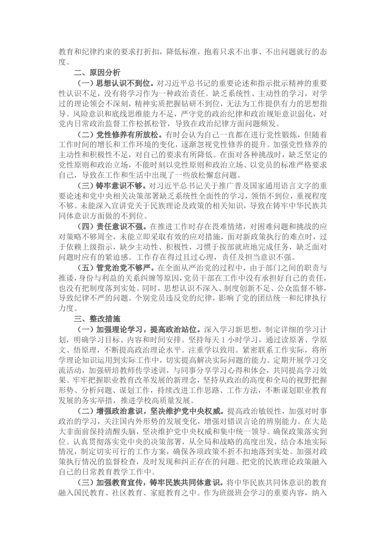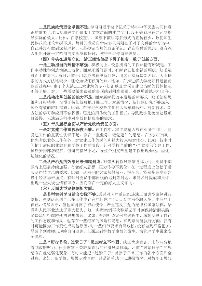 根据《市纪委机关工委市委组织部关于开展好2024年度科级以上党和国家机关党员领导干部民主生活会的通知》(X党组〔2025)1号)有关精神,通过深入开展谈心谈话和会前集中学习研讨的基础上,结合个人思想和工作实际,紧扣会议主题,深刻查摆问题、深挖症结根源,明确了今后的努力方向和整改措施,形成个人对照检查材料。2023年度民主生活会中,本人查找“七个方面”X个问题,市委第二巡视巡察组反馈问题X个,按照即知即改、边学边改、边查边改的要求,制定整改方案,明确整改措施,现已全部整改完毕并长期坚持。现将个人对照检查情况汇报如下:一、问题查摆(一)带头严守政治纪律和政治规矩,维护党的团结统一方面。一是政治理论钻研不够深入。虽积极参与各类理论、专题会议的学习活动,但在学习党的创新理论、新思想及相关要求的学习深度和系统性有所欠缺,多以碎片化、通读式方式开展,精读程度不够。存在一知半解的情况,对一些关键概念和重要观点的理解不够准确到位,理论及会议精神的钻研不够深入,研讨等钻研策略有待进一步增强。比如,在学习全国教育大会精神时,仅停留在理解文件的表面含义,对会议的深刻内涵未开展专项研讨。常态化通过每期政治理论学习在教职工大会及中层干部会议上领学,未通过座谈研讨、传学述训等方式进行深入学习,对如何结合自身在职业学校行政管理工作进行具体落实的思考不够深入透彻。二是党内政治监督不够有力。在党内政治监督方面,有时存在畏难情绪,不敢或不愿对违反党的纪律和规矩的行为进行坚决斗争。在监督执纪问责过程中,有时存在失之于宽、失之于软的情况,未能切实维护党的纪律的严肃性和权威性。比如,党员教师管理“宽松散”,违纪党员频发。学校先后有X名党员教师被纪委处理。(二)带头增强党性、严守纪律、砥砺作风方面。一是党性修养意识不强。有时放松了党性修养的要求,放松了对增强自我净化、自我完善、自我革新、自我提高能力的重视,放松了对保持党员先进性和纯洁性的追求。在保持和发挥先进性方面,对时时处处保持先进性这根弦绷得还不够紧。比如,以业务工作繁忙为借口,对联系的X党支部在党员民主谈心谈话上还不够深刻,参加所在党支部的主题党日活动不及时,开展活动偶尔出现得过且过的现象。二是作风建设不够严格。工作上没有给自己定出较高的标准,满足于只要不影响工作大局,能过得去就行。对作风建设出现的新问题没有加强警惕、持续关注。比如,随着自己年龄的增长及对职业教育内涵建设把握不到位,在涉及职业教育“五金”建设内在逻辑和方法方面,缺少建设举措,学习研究能力欠缺,带头抓作风的劲头不足。(三)带头有形有感有效推进铸牢中华民族共同体意识方面。一是宜传教育工作不到位。在全校范围内对习近平总书记关于民族工作、推广普及国家通用语言文字的重要论述和党中央相关决策部署缺乏系统全面性的学习、领悟不到位,中华传统文化系列活动教育不到位,少数学生对于铸牢中华民族共同体意识方面的认识还不到位,导致部分少数民族群体对中华民族的融入感不够强烈。比如,民汉混校管理工作开展中,虽然学校开展了全国推广普通话宣传周系列活动,介于宣传工作力度不够持续深入,部分少数民族教师及学生在学校和课堂仍存在不讲国通语现象,文明礼貌行为不规范。
