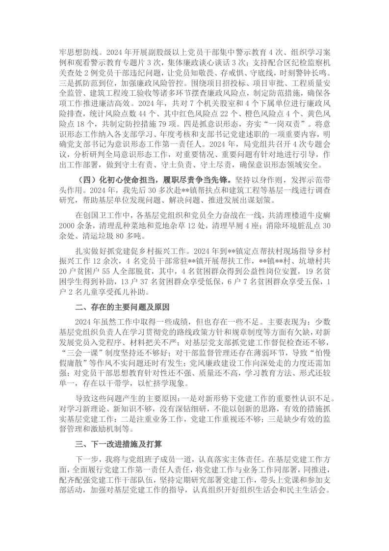 根据区委工作安排,现就本人2024年度抓基层党建工作述职如下:一、履职情况和工作亮点(一)加强政治理论学习,不断提升履职能力。习近平新时代中国特色社会主义思想是实现新时代城乡建设工作高质量发展根本遵循,我始终把学懂弄通做实习近平新时代中国特色社会主义思想和习近平总书记视察云南时的重要讲话精神作为第一政治要求,在学原文中感知真理,在悟原理中坚定信仰,在调研中探究实情,在抓落实中彰显担当,坚决贯彻落实区委区政府关于城乡建设的各项决策部署:按时参加集体学习,认真做好个人自学,持续开展“好人主义之害”解放思想大讨论活动,强化政治责任,树牢“四个意识”,提高政治能力,坚定“四个自信”,切实做到“两个维护”,坚决维护习近平同志在党中央和全党的核心地位、维护党中央权威和集中统一领导,自觉在思想上政治上行动上同以习近平同志为核心的党中央保持高度一致。坚决同破坏政治纪律和规矩的行为作斗争,自接受党内外监督,不断增强推进政治建设的自觉性和坚定性。(二)扎实推进“三化”建设,聚力提升党建水平。一是严格规范组织生活。对“三会一课”、组织生活会、谈心谈话、民主评议党员、请示报告、主题党日活动6项基本制度,从时间安排、组织形式、程序步骤、标准要求等方面逐一固化、量化,列出清单,指导各支部照着标准做、对着要求抓。常态化开展党员过政治生日、重温入党誓词和党员志愿服务等活动:定期组织党员到区革命烈士纪念公园等红色教育基地开展教育活动,引导党员干部回望入党初心、强化使命担当。2024年,组织开展党组中心组学习12次,交流研读6次,讲授专题党课3次:组织党员、党务工作者参加区委培训8人次,参加局党组培训84人次:开展党建专项检查14次,各基层支部共开展主题党日活动84次。二是深入开展“一回顾三对照”主题党日活动。28名同志在各自支部的主题党日活动上发言回顾了入党历程。在主题党日活动时,各支部的党员结合“一回顾三对照”,以及围绕争做“住建先锋”开展了思想交流。主题党日期间,局党组还组织人员对基层各支部党员落实“三会一课”制度,以及缴纳党费等情况进行了检查。2024年,全局共培养入党积极分子5名,发展预备党员1名:全年共缴纳党费43438.83元。三是积极开展“五必到、五必访”走访慰问活动。把“五必到、五必访”工作贯穿全年始终,做到有问题必到,有困难必访,时刻把党组织的关怀和关爱及时送到每位党员干部群众身边。2024年,全局各基层党组织在“五必访”方面,共走访138人次,送去慰问金35200元。在“五必到”方面,对挂点帮扶的**村、坑塘村、东糖社区共落实帮扶资金近14万元,帮助*镇推销花果芋头1.3万斤及购买帮扶农产品约11万元:受理住宅质量投诉等信访件176件,办结率100%。四是扎实抓好党员干部网络在线学习。将党员在“学习强国”APP在线学习列入党员教育重点工作之一,要求在职党员全部参加在线学习,并按时完成学习积分,对学习不达标、账户异常等情况及时进行提醒,利用微信群和会议对参与学习人员较少、学习积分不高的单位和个人进行通报批评,对积分较高的学员进行表扬。(三)加强党风廉政建设,抓好意识形态工作。一是抓责任落实,促进压力传导。坚持把单位廉政建设和业务工作一同谋划、一同部署、一同落实。积极落实班子成员党风廉政建设“一岗双责”责任,将任务层层分解,形成了各方配合、上下齐抓共管的工作格局。二是抓警示教育,筑
