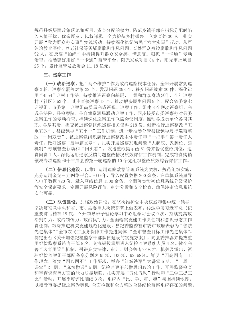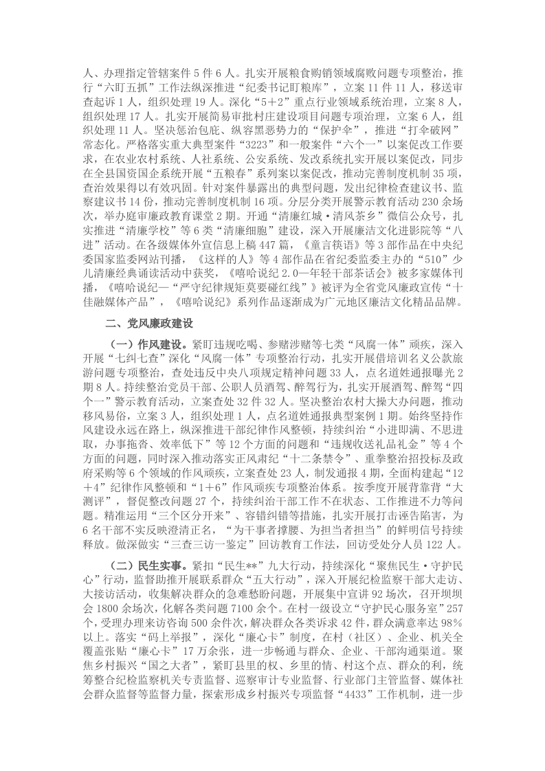 县纪委内设办公室、组织部、宣传部、党风政风监督室、信访室、案件监督管理室、第一纪检监察室、第二纪检监察室、第三纪检监察室、第四纪检监察室第五纪检监察室、案件审理室、纪检监察干部监督室13个科室,下属*县廉政教育培训中心1个事业单位,向县委直属机关派出纪检监察工委,同时设机关党委,向乡镇派出6个片区纪检监察组,向县级单位派驻11个纪检监察组。纪委机关行政编制37名,工勤编制1名,事业编制5名:派驻纪检监察组行政编制30名,参公事业编制11名:派出片区纪检监察组行政编制18名。机关实有人员44人(工勤1人),其中中共党员44人,研究生学历3人、大学学历35人、大专学历5人、高中学历1人。一、监督执纪(一)政治监督。认真贯彻加强和坚决维护党中央集中统一领导若干规定,坚决维护习近平总书记党中央的核心、全党的核心地位,坚决维护党中央权威和集中统一领导,严格执行向上级纪委监委、县委请示报告制度,督促规范党内政治生活,坚决防止和治理“七个有之”问题,不断巩固提升政治生态,立案查处违反政治纪律1人。紧盯习近平新时代中国特色社会主义思想、党的二十大和二十届三中全会精神,特别是习近平总书记来川视察重要指示精神,以及党中央和省、市、县委重大决策部署落实情况强化监督,严肃调查处置疫情防控、森林防灭火、信访维稳、安全生产等履职不到位问题,追责问责73人。扎实开展营商环境专项监督,出台“十个一”工作措施,成立营商环境投诉举报中心,帮助企业解决问题34个。协助县委常委会听取县级领导履行党风廉政建设责任情况汇报4次,及时督促县级领导班子及成员从严履行管党治党主体责任和分管领域“一岗双责”。扎实推动县委书记、县纪委书记、县级领导、乡镇部门“一把手”开展廉政提醒谈话1600余人次。(二)精准监督。全面落实“4321”精准监督,各级各部门结合实际精准建立全面从严治党“三张清单”,扎实开展“四责同述”352场次,全覆盖开展政治生态评估“画像”,“四个责任”协同联动、一体落实。将“一把手”、领导班子和年轻干部作为监督重点,对存在苗头性、倾向性问题及时约谈提醒,对失职失责、违纪违法问题严肃查处。持续健全完善城乡基层综合治理“1十10”大监督体系,调整充实970余人的监督人员库,常态化开展“大督战”,推动“四项监督”贯通融合,党内监督与其他监督协同联动,治理体系和治理能力现代化加快推进。精准推进阳光问政、百姓问廉,播出“阳光问政(廉)”2期,23个乡镇开展“百姓问廉”坝坝会36场次。根据新形势新任务新要求,健全完善日常监督、信访核查、审查调查“室组地”协作配合工作机制,进一步优化派驻监督归口联系单位,统筹纪检监察监督资源、力量,持续打通各环节之间的“断点”“堵点”“痛点”,切实解决基层纪检监察组织监督执纪力量薄弱、各自为战、效率不高等问题,持续激发监督合力,各“协作区”平均发现问题线索18个,平均办理案件32件。(三)惩贪治腐。创新开展信访举报“三减两提”行动,探索推行“六访六问”工作法,受理信访举报125件、同比下降35.2%:其中检举控告83件、同比下降42%。始终坚持案件开道,全年处置问题线索317件,精准运用“四种形态”批评教育帮助和处理443人次,“四种形态”分别占比54.8%、38.6%、3.2%、3.4%,其中立案200件201人、采取留置措施5人、移送审查起诉4