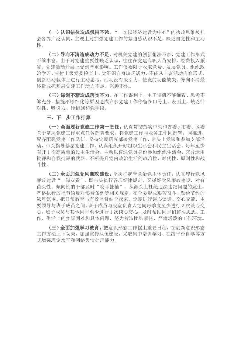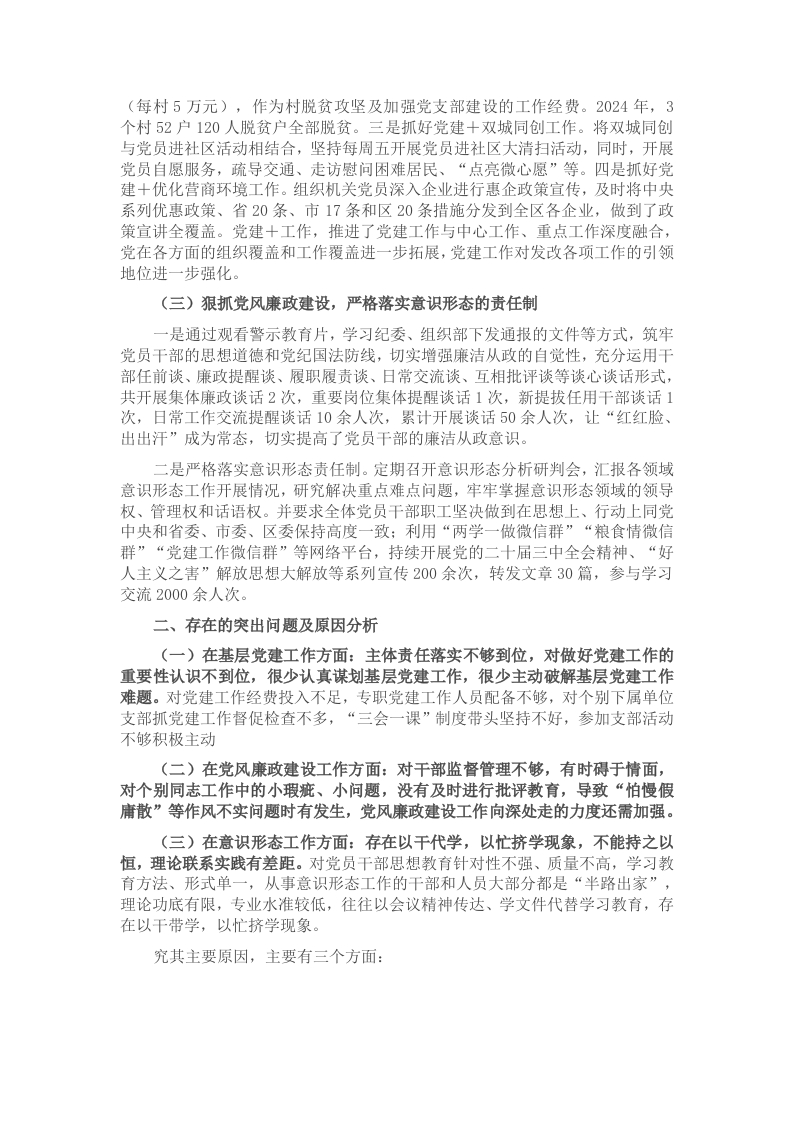 按照区委要求,现就本人2024年度抓基层党建工作述职如下:一、履职情况和工作亮点(一)深化学习教育,从严抓好思想建设坚持以习近平新时代中国特色社会主义思想为指导,深入学习贯彻党的二十届三中全会精神,认真贯彻落实习近平总书记视察云南重要讲话和指示批示,不断增强“四个意识”,坚定“四个自信”,落实“两个维护”,全力打造党建品牌,制定了《2024年*区发改委党委中心组理论学习方案》《关于围绕“好人主义之害”开展解放思想大讨论活动学习安排》,围绕“好人主义”之害开展主题研讨,把《中国共产党纪律处分条例》作为中心组学习的主要内容,第一时间安排部署、第一时间宣传动员领会实质,通过请专家讲座、观看录像、上党课、开座谈会等方式,提高党员的政治思想素质和理论水平。一年来,共组织中心组集体学习**次,先进典型教育*批次、警示教育**批次,参加党员*余人次,确保了上级精神人人领会到位、层层贯彻到位。(二)精准发力,扎实推进基层党建工作1.扎实推进“三化”建设。一是完善了机关基层组织设置。在党委的支持下,党建硬件、软件及会议,走访困难党员等所需经费列入年度预算,严格按照“六有”标准(有场所、有设施、有标志、有党旗、有书报、有制度),扎实推进党支部活动场所的建设。二是抓好日常的党员教育管理。以普通党员身份坚持参加每月“主题党日”活动,充分发挥理论学习中心组的主阵地作用,全力抓实党支部理论学习教育,严格落实“三会一课”、民主生活会和组织生活会制度,开展“一回顾三对照”“五必到五必访”等活动,带头讲好专题党课,在机关支部大会上作了以《克服“好人主义”,全力做好我区跑项争资工作》为主题的专题党课宣讲,深入珀玕乡和王桥镇开展十九届六中全会精神宣讲。三是积极组织党员进社区,责任区创国卫,驻村帮扶等方面的工作,定期开展红色基因教育,抓好党员的廉政警示数育。四是严格落实“三重一大”事项全部上会研究,定期进行党务、政务、财务公开,党员捐款,民主评议党员等事项及时在党建宣传栏中进行公开公示。五是做好发展党员工作。结合实际制定我委2024年度发展党员工作计划,同时积极做好对入党积极分子、发展对象、预备党员的教育、培养工作,做到成熟一个发展一个,确保发展党员质量,2024年度发展预备党员*名。一年来,召开了党员大会*次,党员集中学习*次,支部进行主题党日*次,“一回顾三对照”活动12次,“五必到五必访”24次,党员到共建*社区报道500余人次。2.强化“党建十”引领。一是抓好党建+疫情防控。充分发挥党员先进模范作用,组织机关党员到各卡点执勤,深入东门社区无物业小区开展入户调查摸排,全力做好体温检测、登记工作。开展疫情防控募捐倡活动,积极捐款捐物,集齐善款18000元,大米等生活物资6余吨。二是抓好党建十*。严格按照**挂点责任要求,落实好“大村长”制,坚持每周深入各挂点扶贫1次,先后20多次到帮扶的3户脱贫户家中走访,发放慰问金6000元,发送油米等慰问品价值2000多元。同时,积极帮助脱贫户发展产业,搞好脱贫劳动力培训。2024年5月在东观村邀请农业局技术人员开展脱贫户养鸽技术培训,当月又请农业局技术人员在东观村和愉怡村开展优质稻种植技术培训,并从单位工作经费中节余15万元